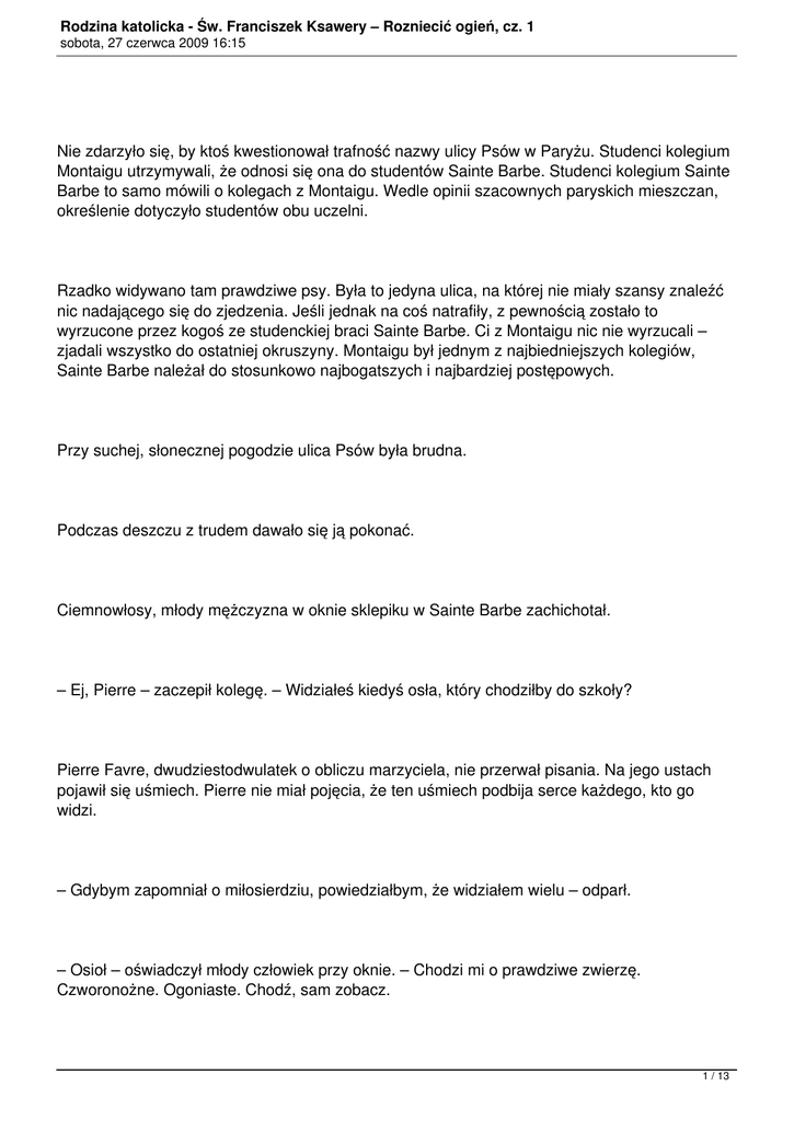 Rodzina katolicka - Św. Franciszek Ksawery – Rozniecić ogień, cz. 1 sobota, 27 czerwca 2009 16:15 Nie zdarzyło się, by ktoś kwestionował trafność nazwy ulicy Psów w Paryżu. Studenci kolegium Montaigu utrzymywali, że odnosi się ona do studentów Sainte Barbe. Studenci kolegium Sainte Barbe to samo mówili o kolegach z Montaigu. Wedle opinii szacownych paryskich mieszczan, określenie dotyczyło studentów obu uczelni. Rzadko widywano tam prawdziwe psy. Była to jedyna ulica, na której nie miały szansy znaleźć nic nadającego się do zjedzenia. Jeśli jednak na coś natrafiły, z pewnością zostało to wyrzucone przez kogoś ze studenckiej braci Sainte Barbe. Ci z Montaigu nic nie wyrzucali – zjadali wszystko do ostatniej okruszyny. Montaigu był jednym z najbiedniejszych kolegiów, Sainte Barbe należał do stosunkowo najbogatszych i najbardziej postępowych. Przy suchej, słonecznej pogodzie ulica Psów była brudna. Podczas deszczu z trudem dawało się ją pokonać. Ciemnowłosy, młody mężczyzna w oknie sklepiku w Sainte Barbe zachichotał. – Ej, Pierre – zaczepił kolegę. – Widziałeś kiedyś osła, który chodziłby do szkoły? Pierre Favre, dwudziestodwulatek o obliczu marzyciela, nie przerwał pisania. Na jego ustach pojawił się uśmiech. Pierre nie miał pojęcia, że ten uśmiech podbija serce każdego, kto go widzi. – Gdybym zapomniał o miłosierdziu, powiedziałbym, że widziałem wielu – odparł. – Osioł – oświadczył młody człowiek przy oknie. – Chodzi mi o prawdziwe zwierzę. Czworonożne. Ogoniaste. Chodź, sam zobacz. 1 / 13 Rodzina katolicka - Św. Franciszek Ksawery – Rozniecić ogień, cz. 1 sobota, 27 czerwca 2009 16:15 Favre posłusznie wstał. Nie odkładając pióra, podszedł do przyjaciela przy oknie. – Z osłem idzie żebrak – zauważył. – Ale musi być z niego dureń, skoro przyszedł tutaj na łowy. Jakby nie było innych miejsc. – Och, sam nie wiem – zamyślił się Favre. – Jego osioł ugina się pod ciężarem książek. Może to wędrowny bukinista. – Źle trafił! Biedny staruszek. – Wiesz, Franciszku, coś ci powiem – oznajmił Favre. – Zauważyłem, że zawsze nazywasz staruszkami ludzi, którzy są mniej więcej szesnaście lat starsi od nas. Ten człowiek ma trzydzieści kilka lat. – Niemożliwe. Przecież łysieje, prawda? Gdyby się odwrócił, zobaczylibyśmy jego twarz. Patrz, właśnie skończył rozmawiać z odźwiernym. Nic nie sprzedał. – Utyka. Franciszek odwrócił się od okna. – Szkoda – mruknął ze złością. 2 / 13 Rodzina katolicka - Św. Franciszek Ksawery – Rozniecić ogień, cz. 1 sobota, 27 czerwca 2009 16:15 – Racja, biedak zasłużył na coś... – Nie w tym rzecz, Pierre. Ten człowiek to Bask. – Co z tego? – Ma twarz i dłonie osoby z dobrej rodziny. Nie musi chodzić po prośbie. To nonsens. Szkoda, że nie znam jego nazwiska. Napisałbym list do jego krewnych. – Zrobiłbyś to? – spytał rozpromieniony mały Pierre Favre. – Pewnie byś zaczął i nigdy nie skończył. Od dwóch lat mieszkamy w tym samym pokoju, a chyba ani razu nie widziałem, żebyś napisał choć jeden list. – Mylisz się. Piszę zawsze, gdy potrzebuję pieniędzy, czyli trzy razy w roku. – O ile wiem, twój słynny list do króla nadal leży na biurku, a przecież zacząłeś pisać wiele miesięcy temu. – Lepiej władasz piórem niż ja, drogi Pierre. Ten list jest ogromnie trudny do napisania. Na mą duszę, Pierre, nie masz pojęcia, jakie to skomplikowane przedsięwzięcie! Moja rodzina chce, bym został kanonikiem w Pampelunie. Kapituła nie wybierze mnie jednak, chyba że dowiodę swojego szlachectwa. – Przecież jesteś szlachetnie urodzony, prawda? – Jestem, lecz w dzisiejszych czasach każdy może to o sobie powiedzieć... 3 / 13 Rodzina katolicka - Św. Franciszek Ksawery – Rozniecić ogień, cz. 1 sobota, 27 czerwca 2009 16:15 – Ja nie. – Pierre się uśmiechnął. – Tylko raz w życiu sprawowałem władzę, kiedy powierzono mi stado owiec. Pasanie owiec to dobre zajęcie, Franciszku. Te zwierzęta są łagodne i można przy nich poświęcać sporo czasu na rozmyślania. Niegdyś płakałem, tak bardzo pragnąłem się kształcić. Teraz, gdy zdobywam wiedzę, czuję, że nie powinienem był opuszczać owiec. – Przyjdzie dzień, gdy staniesz się dobrym księdzem – ocenił Franciszek. – Wtedy zaopiekujesz się dużym stadem dwunożnych owieczek. Wątpię jednak, czy odkryjesz w nich podobną łagodność. Widzisz, ja też mam doświadczenie w pracy przy owcach. Pomagałem ojcu i braciom w zaganianiu stad, kiedy ich właściciele usiłowali przemycać je przez naszą posiadłość bez płacenia należności. – Myślałem, że przywilejem króla... – W tym rzecz, nie rozumiesz? Dokładnie pół wieku temu mój ojciec uzyskał królewski patent, dla siebie i spadkobierców. Zgodnie z jego literą, miał prawo sprawować cywilną władzę sądowniczą nad Ydocin w dolinie Ybargoiti. Mógł orzekać w sprawach o zabójstwa, półzabójstwa, obrzucanie kalumniami, nieprzestrzeganie praw obywatelskich. Ponadto mógł mianować burmistrzów, sędziów, pracowników sądu i innych urzędników. – Ho, ho – westchnął Pierre, wyraźnie pod wrażeniem. – Cóż to takiego półzabójstwa, do diaska? – Grzywny – wyjaśnił Franciszek zwięźle. – Zasądzane rodzinom morderców, oszczerców i im podobnych. Zresztą, ja ścigałem owce, ty je pasłeś. – Skoro twój ojciec dysponował takim patentem, to czemu się martwisz? – Och, to drobiazg. Kapituła Pampeluny nie zaakceptuje mnie tylko dlatego, że potrafi ę okazać jakiś dokument. Trzeba być hidalgiem, Pierre, człowiekiem z czwórką szlachetnie urodzonych dziadków. Co prawda, spełniam także ten warunek, ale musi on uzyskać potwierdzenie Jego Wysokości. 4 / 13 Rodzina katolicka - Św. Franciszek Ksawery – Rozniecić ogień, cz. 1 sobota, 27 czerwca 2009 1