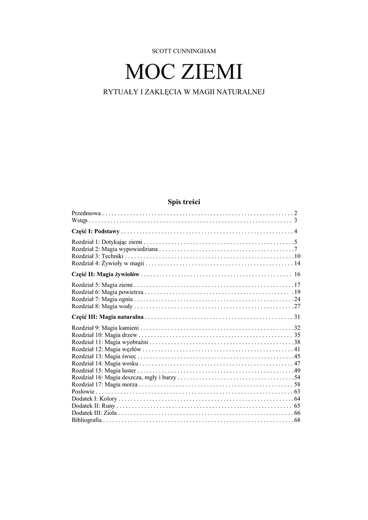 SCOTT CUNNINGHAM MOC ZIEMI RYTUAŁY I ZAKLĘCIA W MAGII NATURALNEJ Spis treści Przedmowa . . . . . . . . . . . . . . . . . . . . . . . . . . . . . . . . . . . . . . . . . . . . . . . . . . . . . . . . . . . . . . 2 Wstęp . . . . . . . . . . . . . . . . . . . . . . . . . . . . . . . . . . . . . . . . . . . . . . . . . . . . . . . . . . . . . . . . . . 3 Część I: Podstawy . . . . . . . . . . . . . . . . . . . . . . . . . . . . . . . . . . . . . . . . . . . . . . . . . . . . . . . . 4 Rozdział 1: Dotykając ziemi . . . . . . . . . . . . . . . . . . . . . . . . . . . . . . . . . . . . . . . . . . . . . . . . . 5 Rozdział 2: Magia wypowiedziana . . . . . . . . . . . . . . . . . . . . . . . . . . . . . . . . . . . . . . . . . . . . 7 Rozdział 3: Techniki . . . . . . . . . . . . . . . . . . . . . . . . . . . . . . . . . . . . . . . . . . . . . . . . . . . . . . . 10 Rozdział 4: Żywioły w magii . . . . . . . . . . . . . . . . . . . . . . . . . . . . . . . . . . . . . . . . . . . . . . . . 14 Część II: Magia żywiołów . . . . . . . . . . . . . . . . . . . . . . . . . . . . . . . . . . . . . . . . . . . . . . . . . 16 Rozdział 5: Magia ziemi . . . . . . . . . . . . . . . . . . . . . . . . . . . . . . . . . . . . . . . . . . . . . . . . . . . . 17 Rozdział 6: Magia powietrza . . . . . . . . . . . . . . . . . . . . . . . . . . . . . . . . . . . . . . . . . . . . . . . . 19 Rozdział 7: Magia ognia . . . . . . . . . . . . . . . . . . . . . . . . . . . . . . . . . . . . . . . . . . . . . . . . . . . . 24 Rozdział 8: Magia wody . . . . . . . . . . . . . . . . . . . . . . . . . . . . . . . . . . . . . . . . . . . . . . . . . . . . 27 Część III: Magia naturalna . . . . . . . . . . . . . . . . . . . . . . . . . . . . . . . . . . . . . . . . . . . . . . . . 31 Rozdział 9: Magia kamieni . . . . . . . . . . . . . . . . . . . . . . . . . . . . . . . . . . . . . . . . . . . . . . . . . . 32 Rozdział 10: Magia drzew . . . . . . . . . . . . . . . . . . . . . . . . . . . . . . . . . . . . . . . . . . . . . . . . . . 35 Rozdział 11: Magia wyobraźni . . . . . . . . . . . . . . . . . . . . . . . . . . . . . . . . . . . . . . . . . . . . . . . 38 Rozdział 12: Magia węzłów . . . . . . . . . . . . . . . . . . . . . . . . . . . . . . . . . . . . . . . . . . . . . . . . . 41 Rozdział 13: Magia świec . . . . . . . . . . . . . . . . . . . . . . . . . . . . . . . . . . . . . . . . . . . . . . . . . . . 45 Rozdział 14: Magia wosku . . . . . . . . . . . . . . . . . . . . . . . . . . . . . . . . . . . . . . . . . . . . . . . . . . 47 Rozdział 15: Magia luster . . . . . . . . . . . . . . . . . . . . . . . . . . . . . . . . . . . . . . . . . . . . . . . . . . . 49 Rozdział 16: Magia deszczu, mgły i burzy . . . . . . . . . . . . . . . . . . . . . . . . . . . . . . . . . . . . . . 54 Rozdział 17: Magia morza . . . . . . . . . . . . . . . . . . . . . . . . . . . . . . . . . . . . . . . . . . . . . . . . . . 58 Posłowie . . . . . . . . . . . . . . . . . . . . . . . . . . . . . . . . . . . . . . . . . . . . . . . . . . . . . . . . . . . . . . . . 63 Dodatek I: Kolory . . . . . . . . . . . . . . . . . . . . . . . . . . . . . . . . . . . . . . . . . . . . . . . . . . . . . . . . . 64 Dodatek II: Runy . . . . . . . . . . . . . . . . . . . . . . . . . . . . . . . . . . . . . . . . . . . . . . . . . . . . . . . . . 65 Dodatek III: Zioła . . . . . . . . . . . . . . . . . . . . . . . . . . . . . . . . . . . . . . . . . . . . . . . . . . . . . . . . . 66 Bibliografia . . . . . . . . . . . . . . . . . . . . . . . . . . . . . . . . . . . . . . . . . . . . . . . . . . . . . . . . . . . . . . 68 Przedmowa Od najwcześniejszych lat życia zafascynowany byłem naturą we wszystkich jej przejawach. Widok łąki pokrytej kobiercem dzikich kwiatów, faktura granitowego klifu, nieposkromiona furia burzy na prerii – oto niektóre z najsilniejszych wrażeń zapamiętanych z mojego dzieciństwa. Podczas gdy moi rówieśnicy uganiali się za piłką lub zgłębiali tajniki silników i gaźników, ja wolałem obserwować niebo, usiłując pojąć jego bezmiar. Kontemplując ten ogrom bez granic, odczuwałem grozę, a nawet strach. Pytania dotyczące czerni nieba i świetlnych punktów na nim wywoływały we mnie kolejne wątpliwości dotyczące świata natury, który nauczyłem się kochać. Kiedy odkryłem, że nawet nauka nie potrafi odpowiedzieć na wiele spośród moich pytań, postanowiłem poświęcić życie wyjaśnianiu i rozwiązywaniu tych tajemnic przyrody. Poszukując odpowiedzi na swoje pytania, przestudiowałem wiele zapomnianych religii i systemów magicznych powstałych w odległych zakątkach naszej planety. Strzępy informacji zostały odnalezione na starożytnych glinianych tabliczkach i w magicznych traktatach. Kiedy odkryłem magię, wiedziałem, że jestem blisko celu, ponieważ w magicznych praktykach wykorzystuje się siły fascynującej mnie natury. Cały swój wysiłek skierowałem na poznanie setek form i odmian magii. Zawarłem znajomość z magami i czarownicami, którzy – dzięki wprowadzeniu mnie w arkana swej sztuki – pogłębili moje poznanie. Po wielu latach zdałem sobie w końcu sprawę z faktu, że magia objawia się i posłuszna jest tym, którzy współpracują z naturą. Jej sekrety zapisane są w meandrach strumieni i przepływających chmurach; jej szept można usłyszeć w ryku oceanu i chłodnym powiewie wiatru; magia pobrzmiewa echem w jaskiniach, skałach i lasach. Bardzo możliwe, że magia to najstarsza istniejąca nauka, ale jednocześnie nie ma i nie było praktyki bardziej nadużywanej i gorzej rozumianej – nawet przez osoby mianujące się jej adeptami. Magia to sztuka współpracowania z siłami natury w celu uzyskania koniecznych zmian. Na tym właśnie polega czysta magia. Siły natury – przejawiające się w ziemi, powietrzu, ogniu i wodzie – istniały długo przed naszym pojawieniem się na tej planecie. Siły te mogą być uznane za duchowych przodk