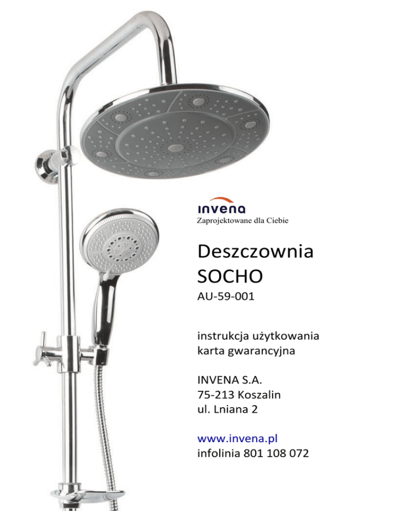 Zaprojektowane dla Ciebie Deszczownia SOCHO AU-59-001 instrukcja użytkowania karta gwarancyjna INVENA S.A. 75-213 Koszalin ul. Lniana 2 www.invena.pl infolinia 801 108 072 deszczownia SOCHO AU-59-001 okrągły, regulowany natrysk górny słuchawka natryskowa 5-funkcyjna przełącznik funkcji w komplecie: wąż natryskowy w oplocie 150 cm wąż do podłączenia baterii 60 cm posiada atest PZH www.invena.pl 2 infolinia 801 108 072 Gratulujemy wyboru! Deszczownie INVENA zapewniają najwyższą jakość i komfort użytkowania. Aby zapewnić sobie długotrwałe, bezawaryjne działanie produktu prosimy o przestrzeganie zaleceń użytkowych producenta. Po zakupie sprawdź! Przy zakupie deszczowni należy sprawdzić, czy wyrób nie ma widocznych uszkodzeń oraz czy posiada w zestawie wszystkie części potrzebne do montażu: 2 tuleje montażowe deszczowni, 1 uchwyt słuchawki, 1 przełącznik deszczowni, 4 kołki rozporowe oraz wkręty do zamontowania uchwytów montażowych deszczowni 4 uszczelki węży natryskowych uszczelka przełącznika natrysku uszczelka natrysku górnego klucz imbusowy Dane techniczne materiał wykonania: stal nierdzewna, mosiądz, ABS, PVC max. temp. wody: 65o min ciśnienie robocze: 0,25 MPa max. ciśnienie robocze: 1 MPa wysokość zestawu: 103cm szerokośc zestwu: 24cm Konserwacja W celu wyeliminowania przyczyn powstawania zacieków na powierzchni deszczowni, po każdorazowym użyciu należy deszczownię wyczyścić i wytrzeć do sucha. Ze względu na wysoką twardość wody, należy raz w miesiącu czyścić słuchawkę wodą z octem (w stosunku 1 do 2). Niewłaściwa jakość wody może powodować uszkodzenie słuchawki. W przypadku takiego uszkodzenia reklamacja na słuchawki nie będzie uwzględniana. Do bieżącej konserwacji wyrobu należy używać płynów myjących nie posiadających właściwości żrących oraz ściernych, które mogłyby spowodować zarysowanie powierzchni. Niewskazane jest również stosowanie ściereczek lub gąbek wykonanych z materiałów o dużej szorstkości. Może to doprowadzić do przedwczesnego zniszczenia gładkiej powierzchni urządzenia oraz uszkodzenia powłok metalizowanych. www.invena.pl 3 infolinia 801 108 072 UWAGA ! Po zamknięciu dopływu wody do deszczowni, przez pewien czas występuje zjawisko tzw. kapania wody z natrysku górnego. Wynika to z tego, że zgromadzona w natrysku woda musi samoczynnie wydostać się z układu, czego efektem jest zanikające po krótkim czasie kapanie wody. Podczas pracy deszczowni zużywane są dość duże ilości wody. Przy tak dużym wydatku podgrzewacze przepływowe mogą nie nadążyć z jej podgrzewaniem. Minimalna zalecana moc podgrzewacza to 18KW. INSTRUKCJA MONTAŻU 1. Nałożyć rozetę (1) na tuleję (2) uchwytu (rys. I). 2. Przełożyć rurę (5) deszczowni przez tuleję (2) stanowiącą uchwyt górny (rys. II), następnie w tuleję (2) wcisnąć element dociskający (3), zwrócony stroną wklęsłą do rury (5) – Rys. III. Zablokować go używając do tego zaślepki (4) - Rys. IV. 3. Przez rurę (5) przełożyć następnie uchwyt słuchawkowy (6) oraz mydelniczkę (7). 4. W sposób identyczny jak w pkt. 2, 3 i 4 zamocować uchwyt dolny deszczowni. 5. Przełożyć wkrętkę (8-A) przez nakrętkę (8-B) mocującą trójnik (8-C) i przykręcić całość do rury (5) deszczowni (rys. VII), wykorzystując do tego celu załączoną uszczelkę. 6. Ustalić miejsce na ścianie gdzie ma być zamocowana deszczownia. Bateria zasilająca nie powinna znajdować się w odległości większej niż długość węża zasilającego komplet (60 cm). Wysokość montażu należy określić tak, aby zagwarantować najwyższy komfort kąpieli osobom o różnym wzroście. 7. Wywiercić w ścianie otwory pod kołki montażowe. Rozstaw otworów należy dopasować zgodnie z rozstawem montażowym uchwytów deszczowni. 8. Przy pomocy załączonych kołków (11) i wkrętów (12) przykręcić uchwyty (13) do ściany (Rys. V). 9. Nakręcić na oba uchwyty (13) rozetę (1) wg Rys. VI, mocując deszczownię do ściany. 10. Przed montażem deszczowni górnej (15) oraz słuchawki (14) i węża natryskowego (9, 10) należy pamiętać o montażu załączonego w komplecie uszczelnienia. www.invena.pl 4 infolinia 801 108 072 Rys. 1 www.invena.pl 5 infolinia 801 108 072 www.invena.pl 6 infolinia 801 108 072 Zaprojektowane dla Ciebie KARTA GWARANCYJNA data sprzedaży, pieczęć i podpis sprzedawcy (karta gwarancyjna bez daty zakupu i pieczątki jest nieważna) Firma Invena S.A. udziela 24 - miesięcznej gwarancji od daty sprzedaży na deszczownię, pod warunkiem zastosowania się Nabywcy do INSTRUKCJI MONTAŻU, UŻYTKOWANIA I KONSERWACJI. Gwarancja obejmuje wyłącznie wady fabryczne: wady materiału i wykonania powstałe w procesie produkcji. Nie ponosimy odpowiedzialności za skutki nieprawidłowego montażu i użytkowania deszczowni, w szczególności za skutki wywołane zanieczyszczeniem mieszacza baterii, jeśli deszczownia została podłączona do instalacji, w której nie ma filtra oraz uszkodzenia spowodowane przez zanieczyszczoną wodę i przez kamień kotłowy. Zgłoszenie stwierdzonej przez Nabywcę wady fabrycznej wyrobu przyjmowane jest przez punkt sprzedaży, gdzie wyrób został zakupiony. W przypadku reklamacji należy przedłożyć dowód sprzedaży oraz niniejszą kartę gwarancyjną wraz z wadliwym towarem. Invena S.A. ramach gwarancji usunie wadę, jeśli usunięcie wady okaże się niemożliwe, wymieni deszczownię na nową, a w przypadku braku reklamowanego modelu deszczowni w ofercie sprzedaży, Invena S.A. wystawi fakturę korygującą lub zaproponuje wymianę deszczowni na inny model. Gwarancja na sprzedany towar konsumpcyjny nie wyłącza, nie ogranicza ani nie zawiesza uprawnień kupującego, wynikających z niezgodności towaru z umową. Zgłoszenia reklamacji można dokonać na terenie RP. www.invena.pl 7 infolinia 801 108 072 * poniższe pola wypełnia serwisant dokładny opis reklamacj