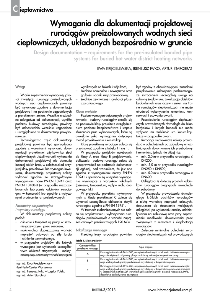 C iepłownictwo Wymagania dla dokumentacji projektowej rurociągów preizolowanych wodnych sieci ciepłowniczych, układanych bezpośrednio w gruncie Design documentation – requirements for the pre-insulated bonded pipe systems for buried hot water district heating networks EWA KRĘCIELEWSKA, IRENEUSZ IWKO, ARTUR STAROBRAT Wstęp W celu zapewnienia wymaganej jakości inwestycji, rurociągi preizolowanych wodnych sieci ciepłowniczych powinny być wykonane zgodnie z dokumentacją projektową i na podstawie uzgodnionych z projektantem zmian. Wszelkie niezbędne odstępstwa od dokumentacji, wynikłe podczas budowy rurociągów, powinny być odpowiednio wcześnie uzgodnione i uwzględnione w dokumentacji powykonawczej. Technologiczna część dokumentacji projektowej powinna być sporządzona zgodnie z warunkami wykonania dokumentacji projektowej użytkownika sieci ciepłowniczych. Jeżeli warunki wykonania dokumentacji projektowej nie stanowią inaczej lub ich brak, w zależności od przyjętej klasy projektowej lub wymagań inwestora, dokumentację projektową należy wykonać zgodnie ze szczegółowymi wymaganiami norm PN-EN 13941 oraz PN-EN 13480-3 (w przypadku niezaizolowanych fabrycznie odcinków rurociągów w komorach) lub zgodnie z wytycznymi producenta rur preizolowanych. Parametry eksploatacyjne i wymiary rurociągu W dokumentacji projektowej należy podać: –– ciśnienie i temperaturę pracy w sezonie grzewczym i poza sezonem, –– maksymalną dopuszczalną wartość naprężeń osiowych od siły tarcia i ciśnienia wewnętrznego, –– w przypadku projektów, dla których wymagane jest wykonanie szczegółowych obliczeń statycznych – maksymalną dopuszczalną wartość naprężeń mgr inż. Ewa Kręcielewska − Heat-Tech-Center Warszawa mgr inż. Ireneusz Iwko – Logstor Polska mgr inż. Artur Starobrat 4 wynikowych na łukach i trójnikach, –– średnice nominalne i zewnętrzne oraz grubości ścianki rury przewodowej, –– średnice zewnętrzne i grubości płaszcza osłonowego. Klasa projektu Poziom wymagań dotyczących projektowania i budowy rurociągów określa się na podstawie klasy projektu z uwzględnieniem poziomu bezpieczeństwa i stopnia złożoności prac wykonawczych, które są określane jako wymagania dotyczące metod projektowania i konstrukcji. Klasę projektową rurociągu zaleca się przyjmować zgodnie z tabelą 1 i rys 1. W przypadku projektów należących do klasy A oraz klasy B projektowanie, obliczenia i budowę rurociągu zaleca się przeprowadzić na podstawie dokumentacji ogólnej, pod warunkiem, że jest ona zgodna z wymaganiami normy PN-EN 13941 i spełnione są wszystkie wymagania wynikające z warunków lokalnych (ciśnienie, temperatura, wpływ ruchu drogowego itd.). W przypadku projektów wykonywanych w klasie projektowej C zaleca się wykonać szczegółowe obliczenia statyki rurociągów zgodne z PN-EN 13941. W terenach zurbanizowanych nie zaleca się projektowania i wykonywania rurociągów preizolowanych o wartości naprężeń osiowych przekraczających 190 MPa. Lokalizacja rurociągu Przebieg trasy rurociągów powinien być zgodny z obowiązującymi zasadami projektowania uzbrojenia podziemnego, ze zwróceniem szczególnej uwagi na ochronę środowiska. Lokalizacja obiektów budowlanych oraz drzew i zieleni na trasie rurociągów ciepłowniczych nie może utrudniać wykonywania remontów, konserwacji i usuwania awarii. Posadowienie rurociągów ciepłowniczych prowadzonych równolegle do ścian budynków i innych budowli nie może wpływać na stabilność ich konstrukcji, także w przypadku awarii. Rurociągi ciepłownicze należy prowadzić w odległościach od zabudowy umożliwiających dokonywanie ich przebudowy i remontów, jednak nie bliżej niż: –– min. 2,0 m w przypadku rurociągów ≤ DN200, –– min. 3,0 m w przypadku rurociągów DN250 ÷ DN500, –– min. 5,0 m w przypadku rurociągów ≥ DN600. Odległości te dotyczą prostych odcinków rurociągów biegnących równolegle do zabudowy. W przypadku prowadzenia równoległego krótkich odcinków rurociągów z niską wartością naprężeń osiowych, dopuszcza się stosowanie mniejszych odległości, po wykonaniu analizy oddziaływania na zabudowę oraz przy zapewnieniu możliwości dokonywania prac związanych z remontem i eksploatacją rurociągów. Zalecane minimalne odległości rurociągów ciepłowniczych od prowadzonych Tabela 1. Klasy projektów Oznaczenie klasy projektowej rurociągu Opis projektu A Rurociągi o średnicach DN ≤ 300, naprężeniach osiowych od sił tarcia i ciśnienia wewnętrznego nie większych od granicy plastyczności rury stalowej w temperaturze pracy B Rurociągi o średnicach DN ≤ 300, naprężeniach osiowych od sił tarcia i ciśnienia wewnętrznego większych od granicy plastyczności rury stalowej w temperaturze pracy C Rurociągi o średnicach DN > 350, naprężeniach osiowych od sił tarcia i ciśnienia wewnętrznego większych od granicy plastyczności rury stalowej w temperaturze pracy oraz pracujące w szczególnych nietypowych warunkach jak: osiadanie gruntu, ciśnienie robocze ≥2,5MPa, dodatkowe oddziaływania zewnętrzne. 3/2013 www.informacjainstal.com.pl równolegle innych przewodów infrastruktury podziemnej podano w tabeli 2. Zalecane minimalne odległości w pionie rurociągów ciepłowniczych na skrzyżowaniach z innymi przewodami infrastruktury podziemnej podano w tabeli 3. W miejscach skrzyżowań poprzecznych dopuszcza się prowadzenie rurociągów preizolowanych zarówno nad, jak i pod urządzeniami infrastruktury podziemnej. Niedopuszczalne jest, aby krzyżujące się uzbrojenie przebiegało w obszarze łoża piaskowego rurociągów preizolowanych. W przypadku zbliżenia lub kolizji szczegółowe rozwiązania powinna zawierać dokumentacja w oparciu o przepisy i indywidualne uzgodnienia z przedsiębiorstwami branżowymi. Opis przyjętej metody instalacji (układania rurociągu) W doku