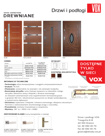 DRZWI ZEWNĘTRZNE DREWNIANE EXCLUSIVE CENNIK SIMPLE cena NETTO cena BRUTTO (VAT 23%) Wkladka patentowa 41/56 2031,71 PLN 2275,60 PLN 1869,11 PLN 1869,11 PLN 26,10 PLN 2499,00 PLN 2799,00 PLN 2299,00 PLN 2299,00 PLN 33,90 PLN Wkladka patentowa 41/56 z gałką 31,50 PLN 40,90 PLN Drzwi* SLIM EXCLUSIVE SIMPLE ARC ARC WYMIARY wys. 2090 mm SLIM szer. 800/900 mm DOSTĘPNA KOLORYSTYKA dąb złoty * W komplecie są: skrzydło drzwiowe, ościeżnica grub. skrzydła 75 mm DOSTĘPNE TYLKO W SIECI VOX orzech INFORMACJE TECHNICZNE • Technologia: płyta kompozytowa z wręgiem antywyważeniowym zawias regulowany drewno klejone • Grubość: 75 mm w 3 płaszczyznach warstwowo • Otwieranie: uniwersalne na zewnątrz i do wewnątrz budynku • Konstrukcja skrzydła: rama stalowa spawana na obwodzie całego skrzydła, obłożona ramą z klejonki z drewna sosnowego ze stelażem wewnętrznym oraz wypełnieniem termoizolacyjnym przemyk rama antywłamaniowy stalowa o grubości 60 mm i obustronnym poszyciem ze sklejki wodoodpornej uszczelka w wykończeniu dębowym • Ościeżnica: wykonana z klejonki z drewna sosnowego, oklejona naturalnym fornirem z zastosowaniem aluminiowego progu z uszczelką • Przeszklenie: zestawy trzyszybowe w zespoleniu • Wymiary: „90” sz = 1000 x Hz = 2080 sklejka frezowana ozdobnie wypełnienie termoizolacyjne o grubości 60 mm DEDYKOWANE KLAMKI (ceny kompletów z rozetą) KLAMKA TUPAI 2732 Q nikiel szczotkowany 219,00 PLN (brutto) KLAMKA TUPAI 3044 Q nikiel szczotkowany 219,00 PLN (brutto) KLAMKA M6/M9 SPACE mosiądz 104,55 PLN (brutto) Drzwi i podłogi VOX Traugutta 6-8 44-100 Gliwice tel. 32 330 40 70 fax 32 330 40 75 [email protected]