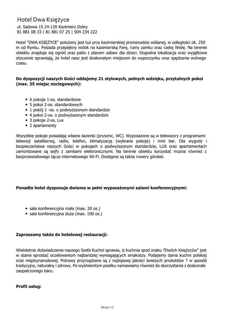 Hotel Dwa Księżyce ul. Sadowa 15 24-120 Kazimierz Dolny 81 881 08 33 | 81 881 07 25 | 504 234 222 Hotel "DWA KSIĘŻYCE" położony jest tuż przy kazimierskiej promenadzie wiślanej, w odległości ok. 250 m od Rynku. Posiada przepiękny widok na kazimierską Farę, ruiny zamku oraz rzekę Wisłę. Na terenie obiektu znajduje się ogród oraz patio z placem zabaw dla dzieci. Dogodna lokalizacja oraz wyjątkowe otoczenie sprawiają, że hotel nasz jest doskonałym miejscem do wypoczynku oraz spędzania wolnego czasu. Do dyspozycji naszych Gości oddajemy 21 stylowych, pełnych wdzięku, przytulnych pokoi (max. 35 miejsc noclegowych): 6 5 1 4 3 2 pokoje 1-os. standardowe pokoi 2-os. standardowych pokój 1 -os. o podwyższonym standardzie pokoi 2-os. o podwyższonym standardzie pokoje 2-os. Lux apartamenty Wszystkie pokoje posiadają własne łazienki (prysznic, WC). Wyposażone są w telewizory z programami telewizji satelitarnej, radio, telefon, klimatyzację (wybrane pokoje) i mini bar. Dla wygody i bezpieczeństwa naszych Gości w pokojach o podwyższonym standardzie, LUX oraz apartamentach zamontowane są sejfy z zamkami elektronicznymi. Na terenie obiektu korzystać można również z bezprzewodowego łącza internetowego Wi-Fi. Dostępne są także rowery górskie. Ponadto hotel dysponuje dwiema w pełni wyposażonymi salami konferencyjnymi: sala konferencyjna mała (max. 20 os.) sala konferencyjna duża (max. 100 os.) Zapraszamy także do hotelowej restauracji: Wieloletnie doświadczenie naszego Szefa Kuchni sprawia, iż kuchnia spod znaku ?Dwóch Księżyców" jest w stanie sprostać oczekiwaniom najbardziej wymagających smakoszy. Podajemy dania kuchni polskiej oraz międzynarodowej. Potrawy przyrządzane są z najlepszej jakości świeżych produktów ? w sposób tradycyjny, naturalny i zdrowy. Po wyśmienitym posiłku namawiamy również do skorzystania z doskonale zaopatrzonego baru. Profil usług: Strona 1/2 pobyty indywidualne; rodzinne pakiety świąteczne oraz weekendowe; konferencje, szkolenia, sympozja; bankiety i przyjęcia okolicznościowe - wesela, komunie, chrzciny, zjazdy absolwentów; obiady dla grup zorganizowanych; grill i ognisko na patio hotelowym (zadaszenie); wycieczki z przewodnikiem po Puławach - Kazimierzu Dolnym ? Nałęczowie; przejażdżki jeepami, bryczkami, rejsy statkiem po Wiśle; W hotelu prowadzona jest sprzedaż i ekspozycja obrazów znanych malarzy polskich, a w szczególności kazimierskich Strona 2/2 Powered by TCPDF (www.tcpdf.org)