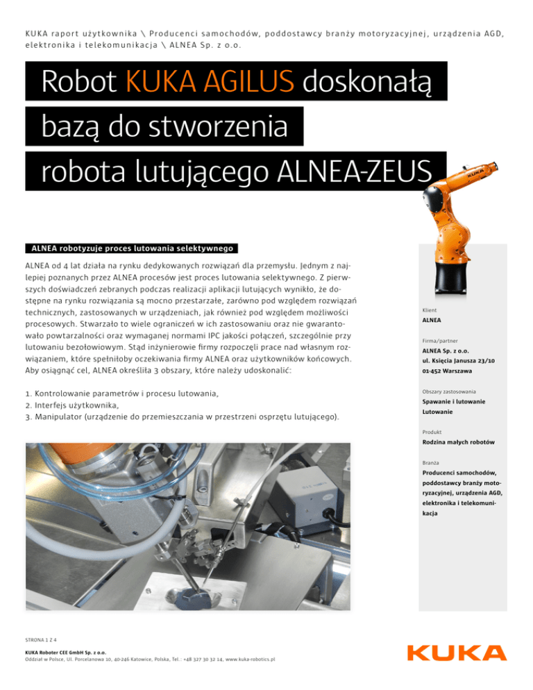 KUKA rapor t uży tkownika \ Producenci samochodów, poddostawcy branży motor yzacyjnej, urządzenia AGD, elektronika i telekomunikacja \ ALNEA Sp. z o.o. Robot KUKA AGILUS doskonałą bazą do stworzenia robota lutującego ALNEA-ZEUS ALNEA robotyzuje proces lutowania selektywnego ALNEA od 4 lat działa na rynku dedykowanych rozwiązań dla przemysłu. Jednym z najlepiej poznanych przez ALNEA procesów jest proces lutowania selektywnego. Z pierwszych doświadczeń zebranych podczas realizacji aplikacji lutujących wynikło, że dostępne na rynku rozwiązania są mocno przestarzałe, zarówno pod względem rozwiązań technicznych, zastosowanych w urządzeniach, jak również pod względem możliwości procesowych. Stwarzało to wiele ograniczeń w ich zastosowaniu oraz nie gwarantowało powtarzalności oraz wymaganej normami IPC jakości połączeń, szczególnie przy lutowaniu bezołowiowym. Stąd inżynierowie firmy rozpoczęli prace nad własnym rozwiązaniem, które spełniłoby oczekiwania firmy ALNEA oraz użytkowników końcowych. Aby osiągnąć cel, ALNEA określiła 3 obszary, które należy udoskonalić: 1. Kontrolowanie parametrów i procesu lutowania, 2. Interfejs użytkownika, 3. Manipulator (urządzenie do przemieszczania w przestrzeni osprzętu lutującego). Klient ALNEA Firma/partner ALNEA Sp. z o.o. ul. Księcia Janusza 23/10 01-452 Warszawa Obszary zastosowania Spawanie i lutowanie Lutowanie Produkt Rodzina małych robotów Branża Producenci samochodów, poddostawcy branży motoryzacyjnej, urządzenia AGD, elektronika i telekomunikacja STRONA 1 Z 4 KUKA Roboter CEE GmbH Sp. z o.o. Oddział w Polsce, Ul. Porcelanowa 10, 40-246 Katowice, Polska, Tel.: +48 327 30 32 14, www.kuka-robotics.pl KUKA rapor t uży tkownika \ Producenci samochodów, poddostawcy branży motor yzacyjnej, urządzenia AGD, elektronika i telekomunikacja \ ALNEA Sp. z o.o. Sytuacja wyjściowa / określenie zadań: Pierwszym problemem, na który napotkała się firma, był brak możliwości synchronicznego (jednoczesnego) sterowania wszystkimi parametrami procesu, takimi jak: temperatura grzania, moc grzania, pomiar temperatury on-line, kierunek i prędkość podawania cyny, przemieszczanie grota lutującego w dowolnym czasie i w dowolnym kierunku. Były to dość duże bariery procesowe, które znacznie ograniczały możliwości automatyzacji procesu lutowania selektywnego. Ponadto brak możliwości np. pre-heatingu stwarzał problemy przy lutowaniu stopami bezołowiowymi, które wymagają wyższej temperatury oraz lepszej kontroli nad procesem. Drugim problemem był interfejs użytkownika, który do automatyzacji procesu wymagał użycia sterownika PLC, panela operatorskiego HMI, kontrolera lutującego i w przypadku użycia robota lutującego: kontrolera i panela operatorskiego robota. Powodowało to, oprócz podniesienia kosztów realizacji automatycznych aplikacji lutujących, także wymóg zatrudniania inżynierów: procesu, automatyka i robotyka. Trzecim problemem była kwestia mobilności narzędzi, a w szczególności możliwość używania ich w różnych płaszczyznach, z różną prędkością i z możliwością ich przemieszczania i obracania w trakcie lutowania, czego nie zapewniały rozwiązania na układach kartezjańskich oraz na robotach typu SCARA. Sterowniki Układ sterowania KR C4 compact (sterownik robota) Implementacja 2015 STRONA 2 Z 4 KUKA Roboter CEE GmbH Sp. z o.o. Oddział w Polsce, Ul. Porcelanowa 10, 40-246 Katowice, Polska, Tel.: +48 327 30 32 14, www.kuka-robotics.pl KUKA rapor t uży tkownika \ Producenci samochodów, poddostawcy branży motor yzacyjnej, urządzenia AGD, elektronika i telekomunikacja \ ALNEA Sp. z o.o. Realizacja / rozwiązanie: Wszystkie te problemy udało się rozwiązać przy użyciu specjalnie zaprojektowanego do tego celu kontrolera lutującego ALNEA - ZEUS oraz 6 osiowego robota KUKA Agilus. W prototypowej aplikacji wykorzystano model KR 6 R900 SIXX, ale równie dobrze można użyć Agilusa o zasięgu 706 mm lub 1101 mm, jak również przy mniej wymagających aplikacjach 5 osiową wersję Agilusa (4 oś robota zastąpiona regulowanym uchwytem mocującym głowicę lutującą do flanszy robota). Ponadto na kontroler robota KUKA KR C4 Compact, który wyróżnia się otwartą architekturą, został napisany i wgrany pakiet komend sterujących procesem lutowania. Komendy są wywoływane z poziomu panela operatorskiego robota, a następnie są wysyłane poprzez warstwę Ethernetową do kontrolera lutującego ZEUS. Kontroler lutujący poprzez swój dedykowany software i hardware steruje oprzyrządowaniem: głowicą lutującą, podajnikiem cyny, generatorem azotu oraz czyścikami. Całość zrealizowana została bez użycia sterownika PLC, panela operatorskiego HMI i dodatkowych interfejsów komunikacyjnych. Wideo: Rozwiązanie z dziedziny automatyzacji ALNEA Sp. z o.o. Komponenty systemu: § Kontroler lutujący ALNEA ZEUS-100 v.2 z pakietem softwarowym ZEUS-100ZK.1 v2, § Oprzyrządowanie lutujące: podajnik cyny, głowica lutująca, czyścik mechaniczny szczotkowy, generator azotu, § Robot 6 osiowy KR 6 R900 SIXX (KUKA Agilus), § Kontroler robota KR C4 Compact, § Panel operatorski KUKA smartPAD, § softwarowy pakiet lutujący ALNEA ZEUS-100K.1 v.1 (soldering packet for KUKA). Cały pakiet dostosowany do zabudowania w linii produkcyjnej lub stanowisku typu „Stand Alone”. Możliwość komunikacji z dowolnymi systemami zewnętrznymi, poprzez: PROFINET, EtherNet/IP, PROFIBUS, DeviceNet, EtherCAT. STRONA 3 Z 4 KUKA Roboter CEE GmbH Sp. z o.o. Oddział w Polsce, Ul. Porcelanowa 10, 40-246 Katowice, Polska, Tel.: +48 327 30 32 14, www.kuka-robotics.pl KUKA rapor t uży tkownika \ Producenci samochodów, poddostawcy branży motor yzacyjnej, urządzenia AGD, elektronika i telekomunikacja \ ALNEA Sp. z o.o. Rezultat / korzyść: Zestaw kontroler ALNEA - ZEUS i robot KUKA AGILUS dysponuje pełnym dostępem do wszystkich parametrów procesowych, bezpośred