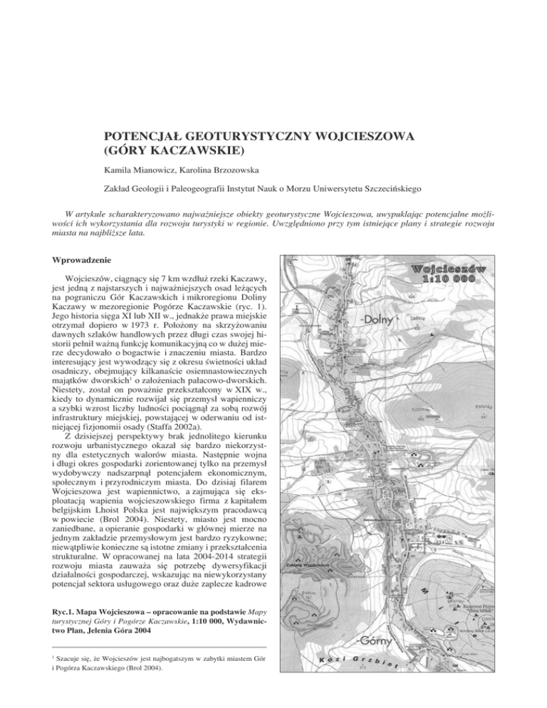 POTENCJAŁ GEOTURYSTYCZNY WOJCIESZOWA (GÓRY KACZAWSKIE) Kamila Mianowicz, Karolina Brzozowska Zakład Geologii i Paleogeografii Instytut Nauk o Morzu Uniwersytetu Szczecińskiego W artykule scharakteryzowano najważniejsze obiekty geoturystyczne Wojcieszowa, uwypuklając potencjalne możliwości ich wykorzystania dla rozwoju turystyki w regionie. Uwzględniono przy tym istniejące plany i strategie rozwoju miasta na najbliższe lata. Wprowadzenie Wojcieszów, ciągnący się 7 km wzdłuż rzeki Kaczawy, jest jedną z najstarszych i najważniejszych osad leżących na pograniczu Gór Kaczawskich i mikroregionu Doliny Kaczawy w mezoregionie Pogórze Kaczawskie (ryc. 1). Jego historia sięga XI lub XII w., jednakże prawa miejskie otrzymał dopiero w 1973 r. Położony na skrzyżowaniu dawnych szlaków handlowych przez długi czas swojej historii pełnił ważną funkcję komunikacyjną co w dużej mierze decydowało o bogactwie i znaczeniu miasta. Bardzo interesujący jest wywodzący się z okresu świetności układ osadniczy, obejmujący kilkanaście osiemnastowiecznych majątków dworskich1 o założeniach pałacowo-dworskich. Niestety, został on poważnie przekształcony w XIX w., kiedy to dynamicznie rozwijał się przemysł wapienniczy a szybki wzrost liczby ludności pociągnął za sobą rozwój infrastruktury miejskiej, powstającej w oderwaniu od istniejącej fizjonomii osady (Staffa 2002a). Z dzisiejszej perspektywy brak jednolitego kierunku rozwoju urbanistycznego okazał się bardzo niekorzystny dla estetycznych walorów miasta. Następnie wojna i długi okres gospodarki zorientowanej tylko na przemysł wydobywczy nadszarpnął potencjałem ekonomicznym, społecznym i przyrodniczym miasta. Do dzisiaj filarem Wojcieszowa jest wapiennictwo, a zajmująca się eksploatacją wapienia wojcieszowskiego firma z kapitałem belgijskim Lhoist Polska jest największym pracodawcą w powiecie (Brol 2004). Niestety, miasto jest mocno zaniedbane, a opieranie gospodarki w głównej mierze na jednym zakładzie przemysłowym jest bardzo ryzykowne; niewątpliwie konieczne są istotne zmiany i przekształcenia strukturalne. W opracowanej na lata 2004-2014 strategii rozwoju miasta zauważa się potrzebę dywersyfikacji działalności gospodarczej, wskazując na niewykorzystany potencjał sektora usługowego oraz duże zaplecze kadrowe Ryc.1. Mapa Wojcieszowa – opracowanie na podstawie Mapy turystycznej Góry i Pogórze Kaczawskie, 1:10 000, Wydawnictwo Plan, Jelenia Góra 2004 Szacuje się, że Wojcieszów jest najbogatszym w zabytki miastem Gór i Pogórza Kaczawskiego (Brol 2004). 1 20 Problemy turystyki i rekreacji – tom 2 (Sztando 2004).Według danych Powiatowego Urzędu Pracy w Złotoryi stopa bezrobocia na koniec czerwca 2004 roku wynosiła na terenie powiatu 34,2%. Najliczniejszą grupę stanowią bezrobotni w wieku 18-24 lat oraz 25-34 lat (Brol 2004). Wśród zdefiniowanych celów strategicznych duże znaczenie ma wspieranie rozwoju turystyki (Sztando 2004). Niewątpliwie w realizacji zamierzeń pomocne jest wciągnięcie Gór i Pogórza Kaczawskiego na listę Europejskiej Sieci Ekologicznej Natura 2000 jako Specjalnego Obszaru Ochrony. Wcześniejsze próby zorientowania gospodarki Wojcieszowa na turystykę obejmowały szereg działań promocyjnych, organizacyjnych i infrastrukturalnych. Z powstałych wówczas obiektów rekreacyjnych i wypoczynkowych do dnia dzisiejszego funkcjonuje jedynie jeden pensjonat: „Adalbertus” (dawniej „Agat”) oraz basen. Pozostałe – w tym pole namiotowe, stanica wodna, wyciąg orczykowy na górę Miłek, tor saneczkowy – nie spełniły pokładanych w nich oczekiwań i szybko zaczęły niszczeć (Staffa 2002). Można przypuszczać, że u podstaw niepowodzenia leżał źle zogniskowany program rozwoju turystyki, a przede wszystkim brak jednoznacznie określonej grupy docelowej turystów i błędne oszacowanie potencjalnych walorów turystycznych. Niepowodzeniem skończyła się m.in. próba ożywienia narciarstwa, bowiem w Górach Kaczawskich nie istnieją dogodne warunki do uprawiania tego sportu ze względu na ciepłe i stosunkowo krótkie zimy (pokrywa śnieżna utrzymuje się 45-50 dni, ale nie jest wystarczająco gruba, za: Słowińska 2006, wg Prusiewicz R. 2004, Program ochrony środowiska dla miasta Wojcieszów. Opracowanie AK NOVA Sp. z o.o. z Odolanowa. Wojcieszów). Obecna strategia rozwoju Wojcieszowa zakłada położenie nacisku na turystykę zrównoważoną oraz ekoturystykę, zgodnie ze standardami zrównoważonego rozwoju (Sztando 2004). Wdrażanie ekoturystyki, w połączeniu z promowaniem niewątpliwych walorów przyrodniczych okolic miasta, daje duże możliwości rozwoju różnorodnych rodzajów turystyki kwalifikowanej i specjalistycznej, skierowanej do wymagającego i świadomego odbiorcy. Jedną z najbardziej interesujących opcji, które mogą być realizowane na bazie istniejącej infrastruktury, jest geoturystyka. Jednocześnie władze miasta planują rozwiązanie problemu niewystarczającej, zdewastowanej i zdekapitalizowanej infrastruktury turystycznej. Planuje się szereg działań prowadzących do zmiany w strukturze użytkowania terenu, do których należą: (1) prawne i infrastrukturalne przygotowanie terenów pod nowe pola namiotowe i camping; (2) wsparcie udostępnienia turystycznego jaskiń Góry Połom; (3) utworzenie i udostępnienie turystyczne „Szlaku Kopalnianego” obejmującego starą kopalnię wapieni i szyb „Luiza; (4) wsparcie udostępnienia turystycznego byłego kamieniołomu „Gruszka”; (5) wytyczenie szeregu ścieżek rowerowych i szlaków turystycznych oraz (6) prawne i infrastrukturalne przygotowanie nieruchomości gruntowych pod budownictwo letniskowe (Brol 2004, Szando 2004). Wszystkie te działania mają na celu zmianę wizerunku miasta, stanowiącego do tej pory bazę wypadową w inne rejony Gór i Pogórza Kaczawskiego. Niezwykle bogate i interesujące zaplecze przyrody nieożywionej 