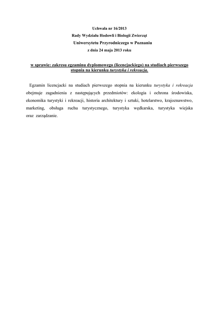 Uchwała nr 16/2013 Rady Wydziału Hodowli i Biologii Zwierząt Uniwersytetu Przyrodniczego w Poznaniu z dnia 24 maja 2013 roku w sprawie: zakresu egzaminu dyplomowego (licencjackiego) na studiach pierwszego stopnia na kierunku turystyka i rekreacja. Egzamin licencjacki na studiach pierwszego stopnia na kierunku turystyka i rekreacja obejmuje zagadnienia z następujących przedmiotów: ekologia i ochrona środowiska, ekonomika turystyki i rekreacji, historia architektury i sztuki, hotelarstwo, krajoznawstwo, marketing, obsługa oraz zarządzanie. ruchu turystycznego, turystyka wędkarska, turystyka wiejska Załącznik nr 1 do Uchwały nr 16/2013 Rady Wydziału Hodowli i Biologii Zwierząt Uniwersytetu Przyrodniczego w Poznaniu z dnia 24 maja 2013 roku w sprawie: zakresu egzaminu dyplomowego (licencjackiego) na studiach pierwszego stopnia na kierunku turystyka i rekreacja. Merytoryczne uzasadnienie wyboru zestawu przedmiotów stanowiących zakres egzaminu licencjackiego: Marketing, Zarządzanie Treści realizowane w ramach wskazanych przedmiotów mają charakter podstawowy. Ich specyfika powoduje jednak, że są przydatne niezależnie od rodzaju podejmowanej aktywności zawodowej i ułatwiają odnalezienie się na rynku pracy. Stanowią one również punkt wyjścia dla przedmiotów kierunkowych realizowanych na studiach drugiego stopnia. Stąd uzasadnione jest ich uwzględnienie wśród problematyki egzaminu licencjackiego Ekonomika turystyki i rekreacji Turystyka i rekreacja zajmują istotne miejsce w strukturze gospodarek rynkowych krajów (w tym Polsce) o silnie rozwiniętej konsumpcji i równocześnie rosnącym czasie wolnym. Efekty gospodarcze przedsiębiorstw prowadzących działalność gospodarczą w tym zakresie dynamizują inne branże gospodarki, wpływają znacznie na efekty makroekonomiczne, które mierzone są udziałem turystyki i rekreacji w produkcie krajowym brutto i strukturze zatrudniania. Ekonomika turystyki i rekreacji, jako dyscyplina badawcza ekonomii, umożliwia badanie zjawisk, praw i prawidłowości, które zachodzą na rynku usług turystycznych i rekreacyjnych. Turystyka wiejska Polska wieś posiada niezwykły potencjał turystyczny, który może być alternatywą dla działalności rolniczej. Z drugiej strony turyści zmęczeni hałaśliwymi kurortami poszukują możliwości spędzania urlopu na łonie przyrody z dala od zgiełku współczesnego świata. Przedmiot turystyka wiejska wyposaża studentów w podstawowe wiadomości dotyczące miejsca agroturystyki i turystyki wiejskiej w wielofunkcyjnym rozwoju wsi, zasad i możliwości ich funkcjonowania. Hotelarstwo, obsługa ruchu turystycznego Określenie stopnia znajomości zagadnień z obu w/w przedmiotów stanowi podstawę do ogólnej oceny sylwetki przyszłego absolwenta turystyki i rekreacji, na ile jest on merytorycznie przygotowany do pracy w sektorze usług turystycznych. Krajoznawstwo Znajomość atrakcyjności kulturowej, przyrodniczej i wypoczynkowej własnego kraju powinna pomóc odnajdywać walory w najbliższej okolicy potencjalnego organizatora usług turystycznych, które mogą zainteresować każdego turystę – ich różnorodność, kompleksowość i nieszablonowość może wyróżnić naszego absolwenta na rynku pracy. Ponadto znajomość podobnych atrakcji w innych miejscach Polski pozwoli także uniknąć błędów związanych z ich promocją, zarządzaniem i eksploatacją. Historia architektury i sztuki Znajomość podstawowych epok stylistycznych ułatwi absolwentowi zdobycie kwalifikacji w zawodach turystycznych pilota i przewodnika. Ponadto łatwiej będzie on mógł zrozumieć potrzeby turysty związane z poznawaniem atrakcji kulturowych. Turystyka wędkarska Turystyka wędkarska jest przykładem dynamicznie rozwijającej się dziedziny turystyki specjalizowanej. Wykorzystuje tzw. „niski sezon” turystyczny (wiosna i jesień – okresy, kiedy trudno o turystę na jeziorach, nad morzem). Jest źródłem dodatkowych dochodów dla osób wynajmujących domki i ośrodki wypoczynkowe, także dla gospodarstw agroturystycznych. Jej rozwój służy całej branży wędkarskiej (producenci sprzętu, przynęt, itp.). Poznanie i zrozumienie procesów zachodzących w środowisku wodnym jest konieczne dla realizacji potrzeb pasjonatów wędkarstwa. Niezbędne jest wyposażenie absolwenta w wiedzę i umiejętności praktyczne z zakresu organizacji łowisk komercyjnych, wypraw wędkarskich oraz możliwości uprawiania turystyki wędkarskiej w Polsce i na świecie. Ekologia i ochrona środowiska Różnorodność biologiczna na obszarach rolniczych jest w Polsce nadal bardzo wysoka, lecz zmiany w sposobie gospodarowania powodują, że wiele gatunków zwierząt i roślin jest zagrożonych wymarciem. Racjonalne zarządzanie takimi obszarami przez wykwalifikowanych absolwentów przyczyni sie do ochrony miejsc przyrodniczo cennych. Znajomość podstaw funkcjonowania przyrody jest niezbędna dla osób zajmujących się organizowaniem i zarządzaniem turystyki. Wiedza o metodach ochrony środowiska, o formach ochrony przyrody (parki narodowe, rezerwaty, obszary Natura 2000) jest przydatna dla organizator turystyki. Załącznik nr 2 do Uchwały nr 16/2013 Rady Wydziału Hodowli i Biologii Zwierząt Uniwersytetu Przyrodniczego w Poznaniu z dnia 24 maja 2013 roku w sprawie: zakresu egzaminu dyplomowego (licencjackiego) na studiach pierwszego stopnia na kierunku turystyka i rekreacja. Zagadnienia z przedmiotu: turystyka wiejska 1. Turystyka zrównoważona: przyczyny rozwoju, cele, wpływ jej rozwoju na środowiska przyrodnicze i kulturowe oraz społeczność lokalną obszarów wiejskich. 2. Specyfika turystyki wiejskiej: wiejski charakter obszarów, definicja turystyki wiejskiej, podstawowe cechy agroturystyki. 3. Miejsce agroturystyki w wielofunkcyjnym rozwoju obszarów wiejskich: rozwój wielofunkcyjny, warunki rozwoju przedsiębiorczości na terenach wiejskich, stan rozwoju agroturystyki w Polsce. 4. Aspek