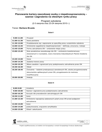 Planowanie kariery zawodowej osoby z niepełnosprawnością – szanse i zagroŜenia na otwartym rynku pracy Program szkolenia (2-3 sierpnia oraz 23-24 sierpnia 2010 r.) Trener: Barbara Bruzda Dzień I 9.00-11.00 Przyjazd 11.00-11.30 Kawa powitalna 11.30-12.00 Przedstawienie się i zapoznanie ze specyfiką pracy uczestników szkolenia 12.00-12.45 Omówienie zagadnienia niepełnosprawności – definicja, przyczyny, rodzaje 12.45-13.00 Formy zatrudniania ON – omówienie miejsc pracy 13.00-13.45 Rola poradnictwa zawodowego dla ON – omówienie kwestionariuszy stosowanych w wywiadzie, wzory tworzenia Indywidualnych Planów Działania dla ON 13.45-14.00 Kawa 14.00-14.30 Zadania trenera pracy 14.30-15.30 Bilans zasobów i ograniczeń przy podejmowaniu zatrudnienia przez ON 15.30-16.30 Obiad 16.30-18.45 Ćwiczenia – badanie predyspozycji zawodowych ON, sztuka przygotowywania dokumentów aplikacyjnych przez ON, przygotowanie do rozmowy kwalifikacyjnej 19.00-20.00 Kolacja Dzień II 8.00-9.00 śniadanie 9.00-10.00 Szanse i zagroŜenia przy podejmowaniu zatrudnienia 10.00-10.30 Korzyści dla pracodawców zatrudniających ON 10.30-11.00 kawa 11.00-12.30 Omówienie najczęściej zadawanych pytań przez ON przed podjęciem zatrudnienia 12.30-13.00 kawa 13.00-14.00 podsumowanie, wręczenie certyfikatów 14.00-15.00 Obiad i zakończenie Projekt współfinansowany ze środków Unii Europejskiej w ramach Europejskiego Funduszu Społecznego Program szkolenia (9-10 sierpnia i 11-12 sierpnia 2010 r.) Trener: Monika Zakrzewska DZIEŃ I 09.00-11.00 Przyjazd i kawa powitalna 11.00-11.30 Typowe sposoby planowania kariery. Siedem kroków planowania kariery. 11.30-13.45 Ocena wstępna kandydata do zatrudnienia i stworzenie Indywidualnego Planu Działania (IPD). 13.45-14.00 Kawa 14.00-15.30 Marketing zatrudnienia wspomaganego w kontaktach z pracodawcami. 15.30-16.30 Obiad 16.30-18.45 Pierwszy kontakt z pracodawcą. Przygotowanie do rozmowy kwalifikacyjnej. Szanse i zagroŜenia wynikające z zatrudnienia na otwartym rynku pracy. 19.00-20.00 Kolacja DZIEŃ II 08.00-09.00 Śniadanie 09.00-10.30 Instrumenty rynku pracy dla osób niepełnosprawnych, finansowane z środków PFRON. 10.30-11.00 Kawa 11.00-12.30 Rola organizacji pozarządowych w procesie rehabilitacji osób niepełnosprawnych. 12.30-13.00 Kawa 13.00-14.00 Podsumowanie, wręczenie certyfikatów 14.00-15.00 Obiad i zakończenie Projekt współfinansowany ze środków Unii Europejskiej w ramach Europejskiego Funduszu Społecznego