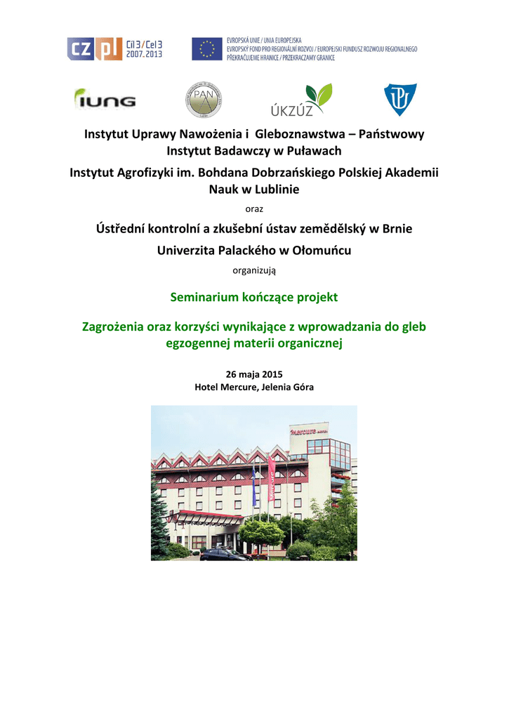 Instytut Uprawy Nawożenia i Gleboznawstwa – Państwowy Instytut Badawczy w Puławach Instytut Agrofizyki im. Bohdana Dobrzańskiego Polskiej Akademii Nauk w Lublinie oraz Ústřední kontrolní a zkušební ústav zemědělský w Brnie Univerzita Palackého w Ołomuńcu organizują Seminarium kończące projekt Zagrożenia oraz korzyści wynikające z wprowadzania do gleb egzogennej materii organicznej 26 maja 2015 Hotel Mercure, Jelenia Góra CEL I ZAKRES SEMINARIUM Głównym celem seminarium, jest zaprezentowanie wyników projektu realizowanego w ramach Programu Operacyjnego Współpracy Transgranicznej Republika Czeska Rzeczpospolita Polska 2007 – 2013, „Zagrożenia oraz korzyści wynikające z wprowadzania do gleb egzogennej materii organicznej”. Spadek zawartości materii organicznej w glebach, został zdefiniowany w Unijnej Strategii Ochrony Gleb jako jedno z głównych zagrożeń. Regionalna ocena zawartości w glebach wykazała, że jej poziom obniża się. Glebowa materia organiczna wpływa na wiele funkcji gleby: jej potencjał produkcyjny, zdolności retencyjne i buforowe, zachowanie bioróżnorodności oraz filtrację zanieczyszczeń. Upraszczanie płodozmianu oraz specjalizacja rolnictwa (produkcja roślinna oddzielona od produkcji zwierzęcej), prowadzi do zmniejszenia dopływu materii organicznej do gleby. Celem projektu była ocena wpływu egzogennej materii organicznej na właściwości gleby oraz przygotowanie wytycznych dla jej bezpiecznego i efektywnego wykorzystania w rolnictwie. Projekt skupiał się na bezpiecznym stosowaniu egzogennej materii organicznej, z uwzględnieniem warunków glebowo-środowiskowych występujących na pograniczu polsko – czeskim. Uzyskane dane zostaną zaprezentowane łącznie, co ukaże całościowy obraz zmian zachodzących we właściwościach gleby, a także środowiskowe skutki stosowania egzogennej materii organicznej. Uczestnikom Seminarium zostaną też udostępnione wytyczne do zrównoważonego stosowania egzogennej materii organicznej. Seminarium skierowane jest do rolników, doradców rolniczych, producentów glebowych dodatków organicznych (kompostów, pofermentu itp.), przedstawicieli lokalnej i krajowej administracji państwowej, odpowiedzialnych za rolnictwo i ochronę środowiska oraz naukowców zajmujących się problematyką materii organicznej w glebie. Podczas Seminarium zostaną również przedstawione uwarunkowania prawne dotyczące stosowania niektórych typów egzogennej materii organicznej. Liczymy też, że Seminarium, będzie okazją do spotkania środowisk naukowych z rolnikami, producentami dodatków organicznych i przedstawicielami organów państwa, co stworzy platformę do dyskusji nt. problemów związanych ze spadkiem zawartości materii organicznej w glebie i możliwości stosowania różnych dodatków organicznych w celu przeciwdziałania temu procesowi. Tematyka seminarium obejmować będzie: Obecny stan materii organicznej w glebach oraz jej przewidywane zmiany Egzogenna materia organiczna jako źródło składników pokarmowych dla roślin a także ryzyko potencjalnego zanieczyszczenia Wpływ materii organicznej na właściwości fizyczne gleby Aktywność mikrobiologiczna gleb poddanych działaniu egzogennej materii organicznej RAMOWY PROGRAM SEMINARIUM 9:00 – 9:30 – Otwarcie seminarium 9:30 – 11:00 – Wykłady 11:00 – 11:30 – Przerwa kawowa 11:30 – 13:00 – Obiad 14:00 – 16:00 – Wykłady 16:00 – 16:30 – Zakończenie seminarium MIEJSCE SEMINARIUM Seminarium odbędzie się Jeleniej Górze. Dokładny adres miejsca seminarium to: Hotel Mercure Jelenia Góra ul. Sudecka 63 58-500 Jelenia Góra UDZIAŁ W SEMINARIUM, OPŁATY, WAŻNE DATY Dzięki wsparciu Europejskiego Funduszu Rozwoju Regionalnego w ramach Programu Operacyjnego Współpracy Transgranicznej Republika Czeska - Rzeczpospolita Polska 2007 – 2013, udział w seminarium jest bezpłatny. Uczestnicy pokrywają jedynie koszty dojazdu oraz ewentualnego noclegu, który należy zapewnić sobie we własnym zakresie. Organizatorzy zapewniają: - ciekawe wykłady - obiad - przerwy kawowe - materiały seminaryjne Maksymalna ilość uczestników wynosi 60 osób. O udziale decyduje kolejność zgłoszeń. Rejestracji uczestnictwa można dokonać, wypełniając załączony formularz rejestracyjny i przysyłając go pocztą elektroniczną na adres: [email protected], faksem na numer +81 744 50 67 lub pocztą tradycyjną na adres: Instytut Agrofizyki im. Bohdana Dobrzańskiego Polskiej Akademii Nauk Zakład Badań Systemu Gleba-Roślina mgr Agata Gryta ul. Doświadczalna 4 20-290 Lublin Termin zgłoszeń upływa 20 maja 2015 roku KOMITET NAUKOWY dr Stanislav Malý - Ústřední kontrolní a zkušební ústav zemědělský w Brnie dr Grzegorz Siebielec – Instytut Uprawy Nawożenia i Gleboznawstwa – Państwowy Instytut Badawczy dr hab. Magdalena Frąc, prof. IA PAN - Instytut Agrofizyki im. Bohdana Dobrzańskiego Polskiej Akademii Nauk w Lublinie dr Ladislav Čáp - Univerzita Palackého w Ołomuńcu KOMITET ORGANIZACYJNY dr Grzegorz Siebielec – Instytut Uprawy Nawożenia i Gleboznawstwa – Państwowy Instytut Badawczy dr hab. Magdalena Frąc, prof. IA PAN - Instytut Agrofizyki im. Bohdana Dobrzańskiego Polskiej Akademii Nauk w Lublinie dr Jacek Niedźwiecki - Instytut Uprawy Nawożenia i Gleboznawstwa – Państwowy Instytut Badawczy SEKRETARIAT SEMINARIUM mgr Agata Gryta Instytut Agrofizyki im. Bohdana Dobrzańskiego Polskiej Akademii Nauk Zakład Badań Systemu Gleba-Roślina ul. Doświadczalna 4 20-290 Lublin email: [email protected] tel.: +81 744 50 61 wew. 177 fax: +81 744 50 67 FORMULARZ REJESTRACYJNY Seminarium Zagrożenia oraz korzyści wynikające z wprowadzania do gleb egzogennej materii organicznej 26 maja 2015 Hotel Mercure, Jelenia Góra Proszę wypełnić i przesłać na adres: mgr Agata Gryta Instytut Agrofizyki im. Bohdana Dobrzańskiego Polskiej Akademii Nauk Zakład Badań Systemu Gleba-Roślina ul. Do