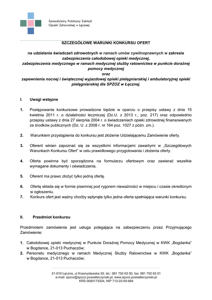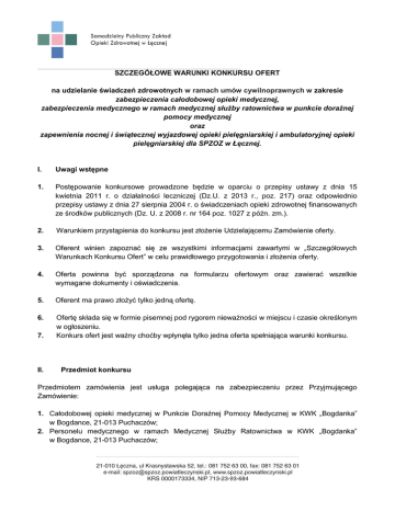SZCZEGÓŁOWE WARUNKI KONKURSU OFERT na udzielanie świadczeń zdrowotnych w ramach umów cywilnoprawnych w zakresie zabezpieczenia całodobowej opieki medycznej, zabezpieczenia medycznego w ramach medycznej służby ratownictwa w punkcie doraźnej pomocy medycznej oraz zapewnienia nocnej i świątecznej wyjazdowej opieki pielęgniarskiej i ambulatoryjnej opieki pielęgniarskiej dla SPZOZ w Łęcznej. I. Uwagi wstępne 1. Postępowanie konkursowe prowadzone będzie w oparciu o przepisy ustawy z dnia 15 kwietnia 2011 r. o działalności leczniczej (Dz.U. z 2013 r., poz. 217) oraz odpowiednio przepisy ustawy z dnia 27 sierpnia 2004 r. o świadczeniach opieki zdrowotnej finansowanych ze środków publicznych (Dz. U. z 2008 r. nr 164 poz. 1027 z późn. zm.). 2. Warunkiem przystąpienia do konkursu jest złożenie Udzielającemu Zamówienie oferty. 3. Oferent winien zapoznać się ze wszystkimi informacjami zawartymi w „Szczegółowych Warunkach Konkursu Ofert” w celu prawidłowego przygotowania i złożenia oferty. 4. Oferta powinna być sporządzona na formularzu ofertowym oraz zawierać wszelkie wymagane dokumenty i oświadczenia. 5. Oferent ma prawo złożyć tylko jedną ofertę. 6. Ofertę składa się w formie pisemnej pod rygorem nieważności w miejscu i czasie określonym w ogłoszeniu. Konkurs ofert jest ważny choćby wpłynęła tylko jedna oferta spełniająca warunki konkursu. 7. II. Przedmiot konkursu Przedmiotem zamówienia jest usługa polegająca na zabezpieczeniu przez Przyjmującego Zamówienie: 1. Całodobowej opieki medycznej w Punkcie Doraźnej Pomocy Medycznej w KWK „Bogdanka” w Bogdance, 21-013 Puchaczów; 2. Personelu medycznego w ramach Medycznej Służby Ratownictwa w KWK „Bogdanka” w Bogdance, 21-013 Puchaczów; 3. Nocnej i świątecznej wyjazdowej opieki pielęgniarskiej w domu ubezpieczonego w przypadku nagłego zachorowania lub pogorszenia stanu zdrowia; 4. Nocnej i świątecznej ambulatoryjnej opieki pielęgniarskiej w SPZOZ w Łęcznej, ul. Krasnystawska 52. Szacunkowa liczba osób ubezpieczonych i uprawnionych do świadczeń wynika z umowy zawartej przez Udzielającego Zamówienie z KWK „Bogdanka” w Bogdance oraz umów zawartych z NFZ. Liczba osób uprawnionych do świadczenia zdrowotnego nie jest wiążąca dla Udzielającego Zamówienie. III. Termin związania ofertą oraz czas wykonania umowy 1. 2. Oferent będzie związany ofertą w ciągu 30 dni od dnia upływu terminu do składania ofert. Umowa na realizację zadań w zakresie objętym zamówieniem zostanie zawarta na okres od dnia 1 lutego 2014 r. do dnia 31 grudnia 2014 r. IV. Opis sposobu przygotowanie oferty 1. Oferent składa ofertę zgodnie z wymaganiami określonymi w Szczegółowych Warunkach Konkursu Ofert. Oferenci ponoszą wszelkie koszty związane z przygotowaniem i złożeniem oferty. Oferta powinna zawierać wszelkie kserokopie dokumentów oraz załączniki wymagane w Szczegółowych Warunkach Konkursu Ofert. Ofertę oraz wszystkie załączniki należy sporządzić w języku polskim pod rygorem odrzucenia oferty, z wyłączeniem pojęć medycznych. Brak jakiegokolwiek wymaganego dokumentu lub załącznika w złożonej ofercie spowoduje jej odrzucenie. Ofertę oraz każdą z jej stron podpisuje Oferent. Oferent może wycofać złożoną ofertę powiadamiając pisemnie Udzielającego Zamówienie przed upływem terminu składania ofert. 2. 3. 4. 5. 6. 7. V. Oferta 1. Oferta powinna być złożona na formularzu ofertowym Udzielającego Zamówienie, zgodnie z dostępnym wzorem. Ponadto do ofert należy dołączyć: a. Oświadczenia Oferenta o zapoznaniu się z treścią ogłoszenia wraz z informacją, że nie zgłasza do niego żadnych zastrzeżeń, w formie Załącznika nr 1; b. Kserokopię dokumentów potwierdzających kwalifikacje do udzielania świadczeń zdrowotnych, takich jak: dyplom, specjalizacje, prawo wykonywania zawodu. c. Polisę ubezpieczeniową od odpowiedzialności cywilnej za szkody wyrządzone w związku z udzielaniem świadczeń zdrowotnych zgodnie z obowiązującymi w tym 2. 2 3. VI. zakresie przepisami, lub oświadczenie oferenta o zawarciu takiej polisy z obowiązkiem przedłożenia jej w dniu ewentualnego podpisywania umowy; d. wydruk z Centralnej Ewidencji i Informacji o Działalności Gospodarczej (CEDiG) lub z KRS; lub kopię wpisu do rejestru podmiotów prowadzących działalność leczniczą (księga rejestrowa) wraz z dokumentami potwierdzającymi nadanie numeru NIP i REGON; e. proponowaną kwotę należności za realizację zamówienia z ewentualną kalkulacją elementów należności; f. kopię aktualnego orzeczenia lekarskiego do celów sanitarno-epidemiologicznych; g. oświadczenie o niekaralności za przestępstwa i za przestępstwa w związku z wykonywanym zawodem lekarza oraz o braku toczących się postępowań karnych przeciwko oferentowi, w formie Załącznika nr 2. Oferty należy składać wraz z Załącznikami w zamkniętych kopertach opatrzonych napisem „Konkurs ofert na udzielanie świadczeń zdrowotnych w zakresie zabezpieczenia całodobowej opieki medycznej, zabezpieczenia medycznego w ramach Medycznej Służby Ratownictwa oraz zapewnienia nocnej i świątecznej wyjazdowej opieki pielęgniarskiej i ambulatoryjnej opieki pielęgniarskiej” Kryteria oceny ofert Dokonując wyboru najkorzystniejszych ofert Komisja konkursowa kieruje się następującymi kryteriami: - kwalifikacje; - doświadczenie; - cena za udzielanie świadczeń. VII. Miejsce i termin składania ofert 1. Ofertę należy złożyć w terminie do dnia 28 stycznia 2014 r. do godz. 10°° w Sekretariacie SPZOZ w Łęcznej, przy ul. Krasnystawskiej 52. 2. Wszystkie oferty złożone po terminie zostaną zwrócone bez otwierania. VIII. Miejsce i termin otwarcia ofert oraz przebieg konkursu 1. 2. Otwarcie złożonych ofert nastąpi w dniu 28 stycznia 2014 r. o godz. 11°° w siedzibie Udzielającego Zamówienie w Dziale Kontrolingu Samodzielnego Publicznego Zakładu Opieki