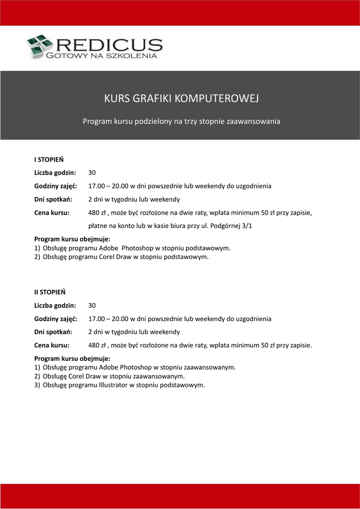KURS GRAFIKI KOMPUTEROWEJ Program kursu podzielony na trzy stopnie zaawansowania I STOPIEŃ Liczba godzin: 30 Godziny zajęć: 17.00 – 20.00 w dni powszednie lub weekendy do uzgodnienia Dni spotkań: 2 dni w tygodniu lub weekendy Cena kursu: 480 zł , może być rozłożone na dwie raty, wpłata minimum 50 zł przy zapisie, płatne na konto lub w kasie biura przy ul. Podgórnej 3/1 Program kursu obejmuje: 1) Obsługę programu Adobe Photoshop w stopniu podstawowym. 2) Obsługę programu Corel Draw w stopniu podstawowym. II STOPIEŃ Liczba godzin: 30 Godziny zajęć: 17.00 – 20.00 w dni powszednie lub weekendy do uzgodnienia Dni spotkań: 2 dni w tygodniu lub weekendy Cena kursu: 480 zł , może być rozłożone na dwie raty, wpłata minimum 50 zł przy zapisie. Program kursu obejmuje: 1) Obsługę programu Adobe Photoshop w stopniu zaawansowanym. 2) Obsługę Corel Draw w stopniu zaawansowanym. 3) Obsługę programu Illustrator w stopniu podstawowym. III STOPIEŃ Liczba godzin: 30 Godziny zajęć: 17.00 – 20.00 w dni powszednie lub weekendy do uzgodnienia Dni spotkań: 2 dni w tygodniu lub weekendy Cena kursu: 480 zł , może być rozłożone na dwie raty, wpłata minimum 50 zł przy zapisie. Program kursu obejmuje: 1) Obsługę programu Photoshop. 2) Obsługę programu Illustrator w stopniu zaawansowanym.