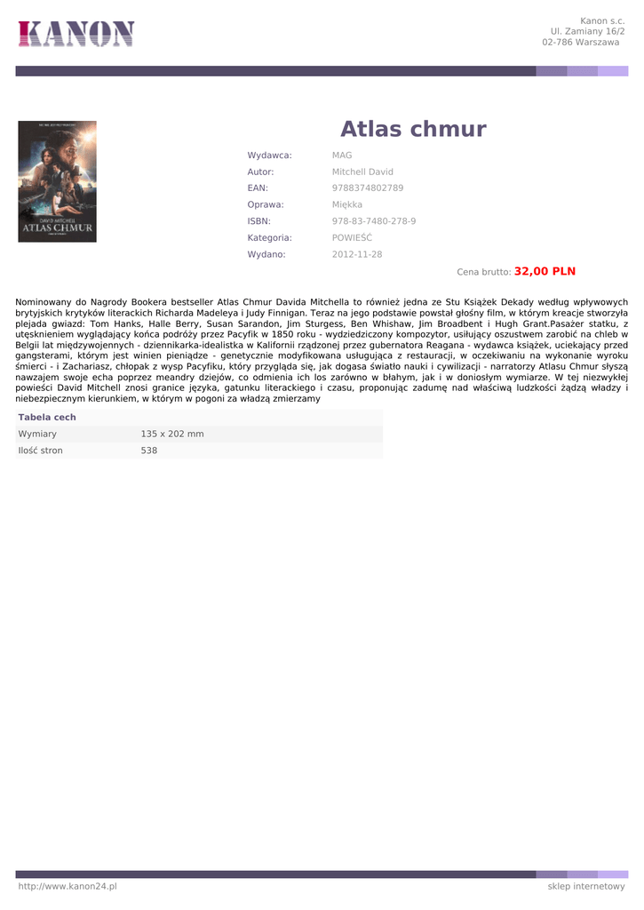 Kanon s.c. Ul. Zamiany 16/2 02-786 Warszawa Atlas chmur Wydawca: MAG Autor: Mitchell David EAN: 9788374802789 Oprawa: Miękka ISBN: 978-83-7480-278-9 Kategoria: POWIEŚĆ Wydano: 2012-11-28 Cena brutto: 32,00 PLN Nominowany do Nagrody Bookera bestseller Atlas Chmur Davida Mitchella to również jedna ze Stu Książek Dekady według wpływowych brytyjskich krytyków literackich Richarda Madeleya i Judy Finnigan. Teraz na jego podstawie powstał głośny film, w którym kreacje stworzyła plejada gwiazd: Tom Hanks, Halle Berry, Susan Sarandon, Jim Sturgess, Ben Whishaw, Jim Broadbent i Hugh Grant.Pasażer statku, z utęsknieniem wyglądający końca podróży przez Pacyfik w 1850 roku - wydziedziczony kompozytor, usiłujący oszustwem zarobić na chleb w Belgii lat międzywojennych - dziennikarka-idealistka w Kalifornii rządzonej przez gubernatora Reagana - wydawca książek, uciekający przed gangsterami, którym jest winien pieniądze - genetycznie modyfikowana usługująca z restauracji, w oczekiwaniu na wykonanie wyroku śmierci - i Zachariasz, chłopak z wysp Pacyfiku, który przygląda się, jak dogasa światło nauki i cywilizacji - narratorzy Atlasu Chmur słyszą nawzajem swoje echa poprzez meandry dziejów, co odmienia ich los zarówno w błahym, jak i w doniosłym wymiarze. W tej niezwykłej powieści David Mitchell znosi granice języka, gatunku literackiego i czasu, proponując zadumę nad właściwą ludzkości żądzą władzy i niebezpiecznym kierunkiem, w którym w pogoni za władzą zmierzamy Tabela cech Wymiary 135 x 202 mm Ilość stron 538 http://www.kanon24.pl sklep internetowy