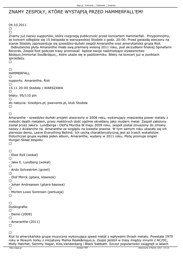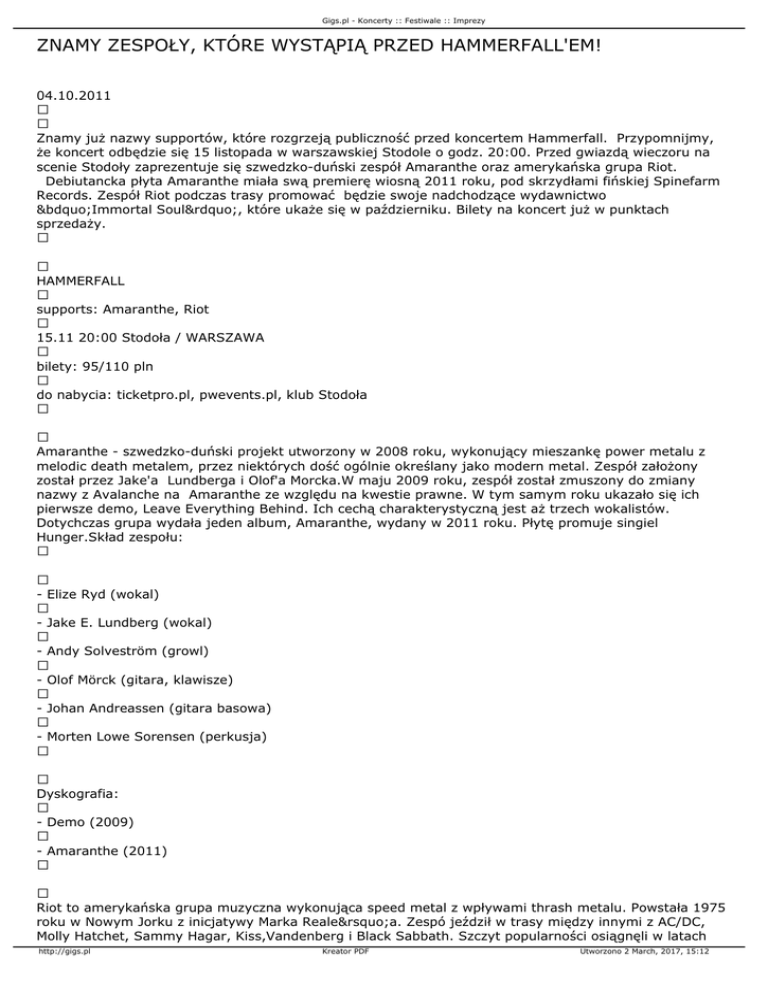 Gigs.pl - Koncerty :: Festiwale :: Imprezy ZNAMY ZESPOŁY, KTÓRE WYSTĄPIĄ PRZED HAMMERFALL'EM! 04.10.2011 Znamy już nazwy supportów, które rozgrzeją publiczność przed koncertem Hammerfall. Przypomnijmy, że koncert odbędzie się 15 listopada w warszawskiej Stodole o godz. 20:00. Przed gwiazdą wieczoru na scenie Stodoły zaprezentuje się szwedzko-duński zespół Amaranthe oraz amerykańska grupa Riot. Debiutancka płyta Amaranthe miała swą premierę wiosną 2011 roku, pod skrzydłami fińskiej Spinefarm Records. Zespół Riot podczas trasy promować będzie swoje nadchodzące wydawnictwo „Immortal Soul”, które ukaże się w październiku. Bilety na koncert już w punktach sprzedaży. HAMMERFALL supports: Amaranthe, Riot 15.11 20:00 Stodoła / WARSZAWA bilety: 95/110 pln do nabycia: ticketpro.pl, pwevents.pl, klub Stodoła Amaranthe - szwedzko-duński projekt utworzony w 2008 roku, wykonujący mieszankę power metalu z melodic death metalem, przez niektórych dość ogólnie określany jako modern metal. Zespół założony został przez Jake'a Lundberga i Olof'a Morcka.W maju 2009 roku, zespół został zmuszony do zmiany nazwy z Avalanche na Amaranthe ze względu na kwestie prawne. W tym samym roku ukazało się ich pierwsze demo, Leave Everything Behind. Ich cechą charakterystyczną jest aż trzech wokalistów. Dotychczas grupa wydała jeden album, Amaranthe, wydany w 2011 roku. Płytę promuje singiel Hunger.Skład zespołu: - Elize Ryd (wokal) - Jake E. Lundberg (wokal) - Andy Solveström (growl) - Olof Mörck (gitara, klawisze) - Johan Andreassen (gitara basowa) - Morten Lowe Sorensen (perkusja) Dyskografia: - Demo (2009) - Amaranthe (2011) Riot to amerykańska grupa muzyczna wykonująca speed metal z wpływami thrash metalu. Powstała 1975 roku w Nowym Jorku z inicjatywy Marka Reale’a. Zespó jeździł w trasy między innymi z AC/DC, Molly Hatchet, Sammy Hagar, Kiss,Vandenberg i Black Sabbath. Szczyt popularności osiągnęli w latach http://gigs.pl Kreator PDF Utworzono 2 March, 2017, 15:12 Gigs.pl - Koncerty :: Festiwale :: Imprezy 80, a ich najlepiej sprzedającym się albumem był Fire Down Under. Obecny skład zespołu: Mike Tirelli - śpiew Mark Reale - gitara elektryczna Mike Flyntz - gitara elektryczna Pete Perez - gitara basowa Frank Gilchrist - instrumenty perkusyjne Wydane albumy: * Rock City (1977) * Narita (1979) * Fire Down Under (1981) * Restless Breed (1982) * Born In America (1983) * Thundersteel (1988) * The Privilege of Power (1990) * Nightbreaker (1993) * Brethren of the Long House (1996) * Inishmore (1998) * Sons of Society (1999) * Through the Storm (2002) http://gigs.pl Kreator PDF Utworzono 2 March, 2017, 15:12 Gigs.pl - Koncerty :: Festiwale :: Imprezy http://gigs.pl Kreator PDF Utworzono 2 March, 2017, 15:12