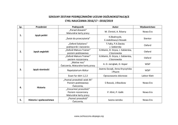 SZKOLNY ZESTAW PODRĘCZNIKÓW LICEUM OGÓLNOKSZTAŁCĄCE CYKL NAUCZANIA 2016/17 –2018/2019 Lp. 1. Przedmiot Język polski Podręcznik „Ponad słowami” Maturalne karty pracy „Świat do przeczytania” 2. 3. 4. 5. Język angielski Język niemiecki Historia Historia i społeczeostwo „Oxford Solutions” podręcznik i dwiczenia „Oxford Matura Trainer” poziom podstawowy „Oxford Matura Trainer” poziom rozszerzony „Motive neu” Dwiczenia, Maturalne karty pracy Autor Wydawnictwo M. Chmiel, A. Równy Nowa Era K.Biedrzycki, E.Jaskółowa,E.Nowak T.Falla, P.A.Davies J. Sobierska G.Manin, D. Gryca, J. Sobierska, J.Sosnowska G.Manin, D. Gryca, J. Sobierska, J.Sosnowska Stentor Oxford Oxford Oxford A. D. Jarząbek, D. Koper WSiP Repetytorium Abitur Joanna Szczęk, Anna Kryczyoska –Pharm WSiP Exact fur dich 1,2,3 Opracowanie zbiorowe Lektor Klett S Raszuk, J.Kłaczkow Nowa Era P. Klint, P. Galik Nowa Era Iwona Janicka Nowa Era „Poznad przeszłośd wiek XX” Poziom podstawowy Dwiczenia, „Zrozumied przeszłośd” Poziom rozszerzony Maturalne karty pracy „Poznad przeszłośd” Dwiczenia, www.zschoszczno.edupage.org 6. Wiedza o społeczeostwie „W centrum uwagi” A. Janicki Nowa Era 7. Historia wojskowości „Wojna i wojskowośd” Karty pracy J. Centek Nowa Era 8. Wiedza o kulturze „Spotkania z kulturą” M. Bokiniec, B. Forysiewicz, J, Michałowski Nowa Era W. Babioski, L. Chaoko, D. Ponczek Nowa Era 9. Matematyka 10. Fizyka 11. Chemia „MaTeMatyka 1” Zbiór zadao, Dwiczenia, Zbiór zadao i zestawów maturalnych, Arkusze maturalne Matematyka Arkusze maturalne Materiały uzupełniające „Odkryd fizykę” – poziom podstawowy „Zrozumied fizykę” – poziom rozszerzony Zbiór zadao, Dwiczenia, Zbiór zadao i zestawów maturalnych, Arkusze maturalne „To jest chemia” poziom podstawowy i poziom rozszerzony: Zbiór zadao i zestawów maturalnych, OPERON M.Braun, W.Śliwa Nowa Era R.Hassa, A.Mrzigod, J.Mrzigod K. Pazdro Nowa Era O.E. Pazdro www.zschoszczno.edupage.org 12. Biologia Arkusze maturalne Po prostu Poziom podstawowy Poziom rozszerzony: Biologia na czasie 1,2,3 Dwiczenia pt. Maturalne karty pracy K.Archacka, R .Archacki, K. Spalik, J. Stocka Cz. 1 M. Guzik i inni Cz.2 i 3 F. Dubert i inni 13. Przyroda Przyroda cz. 1 i 2 M. Galikowski, R. Hassa M. Kaczmarzyk, A. Mrzigod J. Mrzigod, M. Wiąckowski 14. Podstawy przedsiębiorczości „Krok w przedsiębiorczośd” Zeszyt dwiczeo Z.Makieła,T.Rachwał 15. Geografia „Oblicza geografii” Karty pracy ucznia „Oblicza geografii 1” Maturalne karty pracy 1 „Oblicza geografii 2” „Oblicza geografii 3” 16. Informatyka 17. Edukacja dla bezpieczeostwa 18. Religia Wychowanie do życia w rodzinie 19. R.Uliszak, K.Wiederman J. Brożyoska, M. Kubik, M. Nikołajew – Banaszewska R. Malarz, M. Więckowski WSiP Nowa Era Nowa Era Nowa Era Nowa Era Informatyka .Po prostu Edukacja dla bezpieczeostwa Dwiczenia, W blasku Bożej prawdy Zdzisław Nowakowski M. Goniewicz, A. W. Nowak, Z. Smutek T. Śmiech, E. Kondrak WSiP Jednośd Wychowanie do życia w rodzinie M. Ryś Rubikon Operon Zaleca się korzystanie z pomocy w formie repetytoriów, słowników, atlasów, opracowao, zbiorów zadao, wzorów pism, faktur itp. dopuszczonych przez Ministerstwo Oświaty. www.zschoszczno.edupage.org