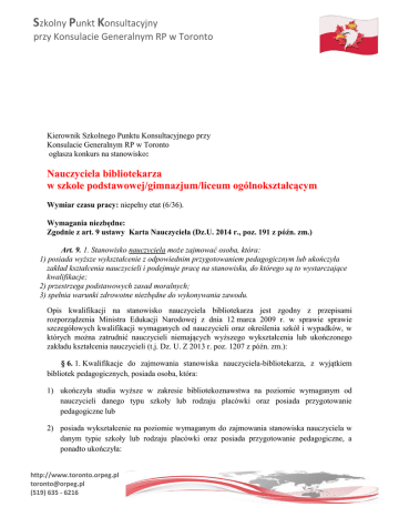 Szkolny Punkt Konsultacyjny przy Konsulacie Generalnym RP w Toronto Kierownik Szkolnego Punktu Konsultacyjnego przy Konsulacie Generalnym RP w Toronto ogłasza konkurs na stanowisko: Nauczyciela bibliotekarza w szkole podstawowej/gimnazjum/liceum ogólnokształcącym Wymiar czasu pracy: niepełny etat (6/36). Wymagania niezbędne: Zgodnie z art. 9 ustawy Karta Nauczyciela (Dz.U. 2014 r., poz. 191 z późn. zm.) Art. 9. 1. Stanowisko nauczyciela może zajmować osoba, która: 1) posiada wyższe wykształcenie z odpowiednim przygotowaniem pedagogicznym lub ukończyła zakład kształcenia nauczycieli i podejmuje pracę na stanowisku, do którego są to wystarczające kwalifikacje; 2) przestrzega podstawowych zasad moralnych; 3) spełnia warunki zdrowotne niezbędne do wykonywania zawodu. Opis kwalifikacji na stanowisko nauczyciela bibliotekarza jest zgodny z przepisami rozporządzenia Ministra Edukacji Narodowej z dnia 12 marca 2009 r. w sprawie sprawie szczegółowych kwalifikacji wymaganych od nauczycieli oraz określenia szkół i wypadków, w których można zatrudnić nauczycieli niemających wyższego wykształcenia lub ukończonego zakładu kształcenia nauczycieli (t.j. Dz. U. Z 2013 r. poz. 1207 z późn. zm.): § 6. 1. Kwalifikacje do zajmowania stanowiska nauczyciela-bibliotekarza, z wyjątkiem bibliotek pedagogicznych, posiada osoba, która: 1) ukończyła studia wyższe w zakresie bibliotekoznawstwa na poziomie wymaganym od nauczycieli danego typu szkoły lub rodzaju placówki oraz posiada przygotowanie pedagogiczne lub 2) posiada wykształcenie na poziomie wymaganym do zajmowania stanowiska nauczyciela w danym typie szkoły lub rodzaju placówki oraz posiada przygotowanie pedagogiczne, a ponadto ukończyła: http://www.toronto.orpeg.pl [email protected] (519) 635 - 6216 Szkolny Punkt Konsultacyjny przy Konsulacie Generalnym RP w Toronto a) studia pierwszego stopnia w zakresie bibliotekoznawstwa lub zakład kształcenia nauczycieli w specjalności bibliotekoznawstwo lub b) studia podyplomowe lub kurs kwalifikacyjny w zakresie bibliotekoznawstwa, lub c) pomaturalne studium bibliotekarskie. 2. Kwalifikacje do zajmowania stanowiska nauczyciela-bibliotekarza w szkołach podstawowych posiada również osoba, która ukończyła zakład kształcenia nauczycieli w specjalności bibliotekoznawstwo. Wymagania dodatkowe: Legalny pobyt wraz z pozwoleniem na pracę na terenie Kanady. Wymagane dokumenty: list motywacyjny i CV kopie dokumentów potwierdzających posiadane kwalifikacje i ukończone formy doskonalenia zawodowego kopia aktu nadania stopnia awansu zawodowego (jeśli dotyczy) zaświadczenie lekarskie o braku przeciwwskazań zdrowotnych do wykonywania pracy na stanowisku nauczyciela Oświadczenie kandydata o: - posiadaniu pełnej zdolności do czynności prawnych i korzystaniu z pełni praw publicznych niekaralności za przestępstwo popełnione umyślnie - niekaralności karą dyscyplinarną, o której mowa w art. 76 ust. 1 ustawy z dnia 26 stycznia 1982 r. – Karta Nauczyciela (t.j. Dz. U. z 2014 r. poz. 191, z późn. zm.) - wyrażeniu zgody na przetwarzanie danych osobowych, zgodnie z ustawą z dnia 29 sierpnia 1997 r. o ochronie danych osobowych (t.j. Dz. U. z 2014 r. poz. 1182 z późn. zm.) w celach przeprowadzenia postępowania. Dokumenty przedkładane w formie kopii powinny być potwierdzone przez kandydata klauzulą „za zgodność z oryginałem”. Osoba, która wygra konkurs będzie zobowiązana przed podpisaniem umowy do dostarczenia zaświadczenia o niekaralności z Krajowego Rejestru Karnego i wykonania badań lekarskich. http://www.toronto.orpeg.pl [email protected] (519) 635 - 6216 Szkolny Punkt Konsultacyjny przy Konsulacie Generalnym RP w Toronto Wszystkie dokumenty w formacie PDF należy przesłać pocztą elektroniczną do dnia 31 stycznia, 2017 roku na adres: [email protected]. W temacie wiadomości należy wpisać: konkurs na stanowisko nauczyciela bibliotekarza. Kandydaci zakwalifikowani do postępowania konkursowego zostaną powiadomieni drogą mailową o terminie rozmowy kwalifikacyjnej. Oferty odrzucone zostaną komisyjnie zniszczone. http://www.toronto.orpeg.pl [email protected] (519) 635 - 6216