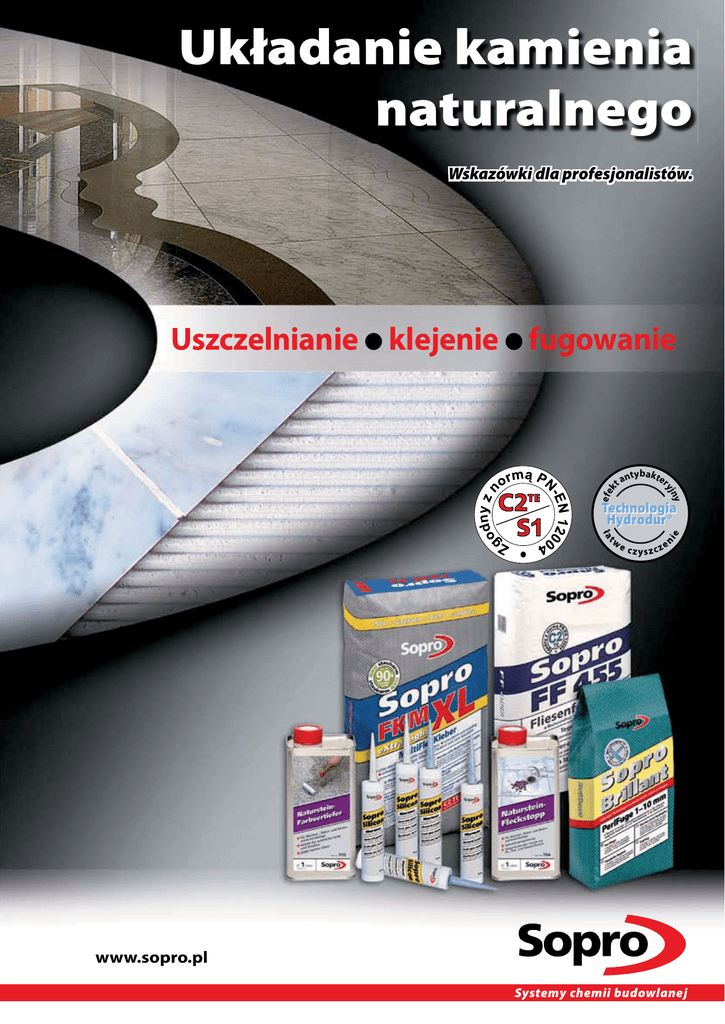 Układanie kamienia naturalnego Wskazówki dla profesjonalistów. ta ntybakter y yjn efe k Uszczelnianie ● klejenie ● fugowanie Technologia Hydrodur® www.sopro.pl Systemy chemii budowlanej Kamień naturalny bez przebarwień Najczęstsze przyczyny przebarwień kamieni naturalnych: ● uaktywnienie się niektórych związków chemicznych zawartych w kamieniu pod wpływem zbyt długo oddziałującej wilgoci ● zanieczyszczenia z podłoża i zaprawy, np. opiłki metali, substancje organiczne (drewno, niedopałki, odchody zwierzęce itp.) ● niewłaściwie użyte zaprawy i fugi (zalecana jest metoda pełnego przylegania płytki do podłoża) ● zanieczyszczenia eksploatacyjne (np. czerwone wino rozlane na jasnym marmurze, dobór niewłaściwych środków lub metod czyszczenia) ● niewłaściwa technologia pracy (np. wystające, rdzewiejące zbrojenie, zanieczyszczenia kruszywa) ● powstawanie wykwitów i wycieków wapiennych w miejscach wydostawania się wody i wilgoci na zewnątrz Przebarwienia na powierzchni Przebarwienia w strefie fug Wykwity wapienne na powierzchni płytki Zabrudzenie krawędzi płytki poprzez zastosowanie nieodpowiednich silikonów Metoda grubowarstwowa układania płyt W tradycyjnej metodzie układania wskazane jest stosowanie spoiwa cementowego z dużą zawartością trasu oraz kruszywa bez zanieczyszczeń. Dopełnieniem systemu jest zastosowanie specjalnych zapraw kontaktowych (szlamów sczepnych) odcinających płyty od wilgoci oraz zanieczyszczeń od spodu oraz uniemożliwiających powstawanie wykwitów i radykalnie zwiększających przyczepność. W niektórych obszarach zastosowań (schody, tarasy, parkingi) zalecana jest zaprawa drenażowa Sopro DM 610 o szczególnych właściwościach antykapilarnych. Dzięki wodoprzepuszczalności i zawartości trasu zaprawa zapobiega powstawaniu wykwitów z odparowujących zanieczyszczeń oraz uszkodzeniom związanym z ujemnymi temperaturami. 1 Elastyczna zaprawa Sopro HSF 748 zwiększająca przyczepność 2 Wewnątrz zaprawa średnio i grubowarstwowa z trasem Sopro MDM 888, na zewnątrz zaprawa drenażowa Sopro DM 610 3 Zaprawa Sopro MAS 418* jako warstwa uszczelniająca i sczepna do kamieni naturalnych, wrażliwych na przebarwienia. Opcjonalnie, do kamieni naturalnych niewrażliwych na przebarwienia: Sopro HSF 748 5 N 3 4 Spoinowanie zaprawą do fugowania Sopro Saphir® M Opcjonalnie, przy dużych obciążeniach: fuga wąska 2-8 mm wysokowytrzymała SoproDur HF 8 2 1 B 5 Fuga silikonowa – Sopro MarmorSilicon B Podłoże betonowe N Okładzina kamienna * produkt dostępny na zamówienie 4 Kamień naturalny bez przebarwień Metoda średniowarstwowa układania płyt W przypadku okładzin o zróżnicowanej grubości, ciosanych, łupanych, o nierównych spodach lub przy lekkich nierównościach podłoża należy zastosować zaprawę klejową średniowarstwową, umożliwiającą przyklejanie warstwą do 20 mm. Zależnie od ilości czynników krytycznych (format płytek, wrażliwość na przebarwienia, ogrzewanie podłogowe itp.) wpływających na pracę okładziny, także w zależności od stopnia skomplikowania wzorów okładziny - należy dokonać wyboru jednej z zapraw z trasem z oferty Sopro Polska: wiążącej szybko lub normalnie, elastycznej lub sztywnej, bądź też na bazie białego cementu. Zaprawy klejowe cienkowarstwowe przeznaczone są do cienkich, kalibrowanych okładzin. Najlepsze z nich cechuje: ● zawartość białego cementu, eliminującego prześwity zaprawy oraz przebarwienia spowodowane obecnością tlenku żelaza w cemencie szarym ● zawartość trasu (tuf wulkaniczny), który wchodząc w reakcje krystalizuje wapń i jednocześnie uszczelnia zaprawy, co jest najskuteczniejszym sposobem uniknięcia powstawania wykwitów wapiennych ● właściwości szybkowiążące, przez co do minimum zostaje skrócony czas penetracji wody w strukturze kamieni ● dobra przyczepność i elastyczność ● specjalne właściwości rozpływne w przypadku zapraw do podłóg 4 3 N 2 1 U 1 Preparat gruntujący Sopro GD 749 2 Zaprawa cienkowarstwowa: Kamień naturalny wrażliwy na przebarwienia = elastyczna zaprawa klejowa do kamieni naturalnych Sopro MFK 446 (do powierzchni poziomych i pionowych). Elastyczna zaprawa klejowa do kamieni naturalnych Sopro VF 411 (do podłóg) Zaprawa średniowarstwowa: Kamień naturalny wrażliwy na przebarwienia = elastyczna zaprawa klejowa do marmuru szybkowiążąca Sopro MDM 885* Kamień naturalny niewrażliwy na przebarwienia = zaprawa klejowa elastyczna z trasem Sopro TR 414 3 Fuga perłowa do kamieni naturalnych Sopro Saphir® M (opcjonalnie, przy dużych obciążeniach: fuga wąska 2-8 mm - wysokowytrzymała SoproDur HF 8) 4 Fuga silikonowa do kamieni naturalnych – Sopro MarmorSilicon N Okładzina kamienna U Podłoże: beton / jastrych cementowy * produkt dostępny na zamówienie Fugowanie należy wykonać specjalnymi zaprawami do kamieni naturalnych oraz silikonami sieciującymi neutralnie, co pozwoli uniknąć przebarwień w strefie siatki spoin. Kamień naturalny bez przebarwień System materiałów do granitu Układanie Fugowanie Sopro HSF 748 Sopro TR 414 Sopro No.1 Sopro FKM XL Sopro Saphir® M Sopro Brillant® Sopro MarmorSilicon System materiałów do marmuru Układanie Fugowanie Sopro FF 455 Sopro Sopro MFK 446 No.1 (997) Sopro Saphir® M Sopro Brillant® Sopro MarmorSilicon System materiałów do wapienia Układanie Fugowanie Sopro HSF 748 Sopro MFK 446 Sopro FF 451 Sopro FKM XL Sopro Saphir® M Sopro Brillant® Sopro MarmorSilicon JAK POSTĘPOWAĆ W TRUDNYCH PRZYPADKACH ZWIĄZANYCH Z UKŁADANIEM KAMIENI NATURALNYCH Układanie kamienia z efektem drenażu W celu zapewnienia szybkiego odprowadzania wody z konstrukcji wykonanych z okładzin z kamienia naturalnego, a tym samym zminimalizowania ryzyka powstawania wykwitów i przebarwień, zalecamy stosowanie zaprawy drenażowej Sopro DM 610. Dzięki specyficznej krzywej przesiewu zaprawa wykazuje dużą przepuszczalność