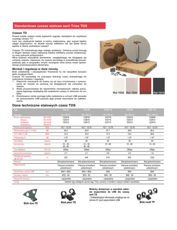 Standardowe czasze stalowe serii Triax TDS Czasze TD Prawie każda czasza może zapewnić sygnały niezbędne do uzyskania czystego obrazu TV. Lecz czy użytkownik będzie w końcu zadowolony, gdy sygnał będzie ulegał pogorszeniu na skutek korozji reflektora lub też jeżeli burza będzie w stanie uszkadzać czaszę? Czasze TD minimalizują tego rodzaju problemy. Ochronę przed korozją w długim okresie czasu zapewnia bardzo dokładny proces antykorozyjny oraz pokrycie polistyrenem. Silna budowa wszystkich elementów, uwzględniając nie ślizgające się uchwyty masztu, zapewnia, że czasze pozostają w prawidłowej pozycji, podczas gdy w przypadku innych rozwiązań silna burza może spowodować przemieszczenie elementów. Montaż i regulacja w dwie minuty Brak problemów i oszczędności finansowe to nie wszystkie korzyści jakie uzyskuje klient. Czasze TD pozwalają na znaczącą redukcję czasu potrzebnego do wykonania montażu i regulacji: 1. Wsporniki mocowane do ściany są od razu zmontowane i zamocowane do masztu za pomocą nie ślizgających się uchwytów do masztu. 2. Skala przymocowana do wsporników montażowych ułatwia precyzyjną regulację niezbędną dla ustawienia czaszy w stosunku do satelity. 3. Zmontowane ramię wymaga tylko rozłożenia a uchwyt LNB pozwala na zamocowanie LNB poprzez jego proste nasunięcie do zablokowania. Dane techniczne stalowych czasz TDS Typ Rozmiar Nr art. (Jasnoszary) (Szary) (Antracyt) (Czerwony) Pasmo przenoszenia Wzmocnieine @ 11.7 GHz G/T LNB 0.7 dB Ral 7035 Ral 7030 Ral 7016 Ral 8012 GHz dBi TDS 54 TDS 64 STDS 78 TDS 88 TDS 110 50 x 56 cm 122518 122510 122512 60 x 65 cm 122618 122610 122612 70 x 78 cm 123718 122710 123712 85 x 95 cm 122818 122810 122812 100 x 105 cm 122908 122912 122910 10.7 - 12.75 34.2 10.7 - 12.75 35.8 10.7 - 12.75 37.1 10.7 - 12.75 38.8 10.7 - 12.75 40.2 dB/K 14.2 16.0 17.3 19.2 20.6 Polaryzacja X dB > 27 > 27 > 27 > 27 > 27 Kąt offsetu Kąt wzniosu stopnie stopnie 26 10 - 60 26 10 - 60 F/D 0.6 26 10 – 50 45 - 80 Offset 26 10 - 60 Typ reflektora 26 10 – 50 45 - 80 Offset Offset Offset Offset Szerokość promienia Obciążenie wiatrem @ 42 m/s Materiał Wykończenie stopnie 3.7 3.1 2.6 2.0 1.8 N 323 445 619 902 1222 Stal galwanizowana Stal galwanizowana Stal galwanizowana Stal galwanizowana Stal galwanizowana Pokrycie proszkiem poliestrowym Pokrycie proszkiem poliestrowym Pokrycie proszkiem poliestrowym Pokrycie proszkiem poliestrowym Pokrycie proszkiem poliestrowym Ø40 + Ø25 Ø40 + Ø25 Ø40 Ø40 Ø40 Ø32 - 60 Ø32 - 60 Ø40 - 95 Ø40 - 95 Aluminiowy uchwyt LNB mm Wymiary masztu mm Wsporniki ścienne Uwagi Blok duo TD - opcjonalne - opcjonalne - opcjonalne - opcjonalne - niektóre typy dostępne są bez logo Triax, prosimy o kontakt z naszym działem sprzedaży Blok plexi TD Możemy dostarczyć w szerokim zakresie wsporników do LNB dla czaszy serii TD - Dokładniejsze informacje znajdują się na stronie 91 pod wspornikiem LNB Ø40 - 95 - opcjonalne Blok multi TP