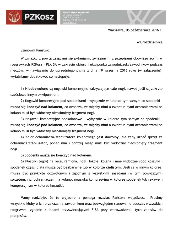 Polski Związek Koszykówki ul. Erazma Ciołka 10 01-402 Warszawa Tel./fax. +48 22 836 38 00 www.pzkosz.pl ______________________________________________________________________________________________________________________________________________________________________________ Warszawa, 05 października 2016 r. wg rozdzielnika Szanowni Państwo, W związku z powtarzającymi się pytaniami, związanymi z przepisami obowiązującymi w rozgrywkach PZKosz i PLK SA w zakresie ubioru i ekwipunku zawodniczek/zawodników podczas meczów, w nawiązaniu do uprzedniego pisma z dnia 19 września 2016 roku (w załączeniu), wyjaśniamy dodatkowo, co następuje: 1) Niedozwolone są nogawki kompresyjne zakrywające całe nogi, nawet jeśli są zakryte częściowo innym ekwipunkiem. 2) Nogawki kompresyjne pod spodenkami - wyłącznie w kolorze tym samym co spodenki muszą się kończyć nad kolanem, co oznacza, że między nimi a ewentualnymi ochraniaczami na kolano musi być widoczny nieosłonięty fragment nogi. 3) Nogawki kompresyjne podkolanowe - wyłącznie w kolorze tym samym co spodenki muszą się kończyć pod kolanem, co oznacza, że między nimi a ewentualnymi ochraniaczami na kolano musi być widoczny nieosłonięty fragment nogi. 4) Kolor ochraniacza/stabilizatora kolanowego jest dowolny, ale żeby uznać sprzęt za ochraniacz/stabilizator, ponad nim i poniżej niego musi być widoczny nieosłonięty fragment nogi. 5) Spodenki muszą się kończyć nad kolanem. 6) Plastry (tejpy) na ręce, ramiona, nogi, łokcie, kolana i inne widoczne spod koszulki i spodenek części ciała muszą być bezbarwne lub w kolorze cielistym. Jeśli są w innym kolorze, muszą być przykryte dozwolonym i zgodnym z wszystkimi zasadami (w tym powyższymi) sprzętem, np. ochraniaczem na kolano, nogawką kompresyjną w kolorze spodenek lub rękawem kompresyjnym w kolorze koszulki. Mamy nadzieję, że te wyjaśnienia pomogą rozwiać Państwa wątpliwości. Prosimy wszystkie kluby o ich przekazanie zawodnikom oraz bezwzględne stosowanie podczas wszystkich rozgrywek, zgodnie z ideami przyświecającymi FIBA przy wprowadzeniu tych zapisów do przepisów. Polski Związek Koszykówki ul. Erazma Ciołka 10 01-402 Warszawa Tel./fax. +48 22 836 38 00 www.pzkosz.pl ______________________________________________________________________________________________________________________________________________________________________________ Przypominamy, że zgodnie z ustaleniami z władzami sędziowsko-komisarskimi oczekujemy od sędziów i komisarzy działania zgodnie z Oficjalnymi Przepisami Gry w Koszykówkę, a także wytycznymi zawartymi w piśmie z 19 września 2016 roku oraz powyżej. Z poważaniem, Otrzymują: 1) 2) 3) 4) 5) 6) 7) 8) 9) kluby rozgrywek centralnych PZKosz, kluby rozgrywek PLK SA, Wojewódzkie Związki Koszykówki, Przewodniczący Komisji Rozgrywek PZKosz, Wydział Sędziowski PZKosz, Zarząd PLK SA, Dyrektor Wydziału Sędziowsko-Komisarskiego PLK SA Pełnomocnik Zarządu PZKosz ds. Komisarzy Komisarze i sędziowie rozgrywek PLK SA i PZKosz