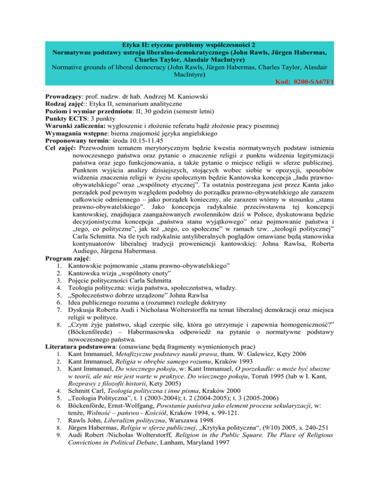 Etyka II: etyczne problemy współczesności 2 Normatywne podstawy ustroju liberalno-demokratycznego (John Rawls, Jürgen Habermas, Charles Taylor, Alasdair MacIntyre) Normative grounds of liberal democracy (John Rawls, Jürgen Habermas, Charles Taylor, Alasdair MacIntyre) Kod: 0200-SA67F1 Prowadzący: prof. nadzw. dr hab. Andrzej M. Kaniowski Rodzaj zajęć:: Etyka II, seminarium analityczne Poziom i wymiar przedmiotu: II; 30 godzin (semestr letni) Punkty ECTS: 3 punkty Warunki zaliczenia: wygłoszenie i złożenie referatu bądź złożenie pracy pisemnej Wymagania wstępne: bierna znajomość języka angielskiego Proponowany termin: środa 10.15-11.45 Cel zajęć: Przewodnim tematem merytorycznym będzie kwestia normatywnych podstaw istnienia nowoczesnego państwa oraz pytanie o znaczenie religii z punktu widzenia legitymizacji państwa oraz jego funkcjonowania, a także pytanie o miejsce religii w sferze publicznej. Punktem wyjścia analizy dzisiejszych, stojących wobec siebie w opozycji, sposobów widzenia znaczenia religii w życiu społecznym będzie Kantowska koncepcja „ładu prawnoobywatelskiego” oraz „wspólnoty etycznej”. Ta ostatnia postrzegana jest przez Kanta jako porządek pod pewnym względem podobny do porządku prawno-obywatelskiego ale zarazem całkowicie odmiennego – jako porządek konieczny, ale zarazem wtórny w stosunku „stanu prawno-obywatelskiego”. Jako koncepcja radykalnie przeciwstawna tej koncepcji kantowskiej, znajdująca zaangażowanych zwolenników dziś w Polsce, dyskutowana będzie decyzjonistyczna koncepcja „państwa stanu wyjątkowego” oraz pojmowanie państwa i „tego, co polityczne”, jak też „tego, co społeczne” w ramach tzw. „teologii politycznej” Carla Schmitta. Na tle tych radykalnie antyliberalnych poglądów omawiane będą stanowiska kontynuatorów liberalnej tradycji proweniencji kantowskiej: Johna Rawlsa, Roberta Audiego, Jürgena Habermasa. Program zajęć: 1. Kantowskie pojmowanie „stanu prawno-obywatelskiego” 2. Kantowska wizja „wspólnoty cnoty” 3. Pojęcie polityczności Carla Schmitta 4. Teologia polityczna: wizja państwa, społeczeństwa, władzy. 5. „Społeczeństwo dobrze urządzone” Johna Rawlsa 6. Idea publicznego rozumu a (rozumne) rozległe doktryny 7. Dyskusja Roberta Audi i Nicholasa Wolterstorffa na temat liberalnej demokracji oraz miejsca religii w polityce. 8. „Czym żyje państwo, skąd czerpie siłę, która go utrzymuje i zapewnia homogeniczność?” (Böckenförede) – Habermasowska odpowiedź na pytanie o normatywne podstawy nowoczesnego państwa. Literatura podstawowa: (omawiane będą fragmenty wymienionych prac) 1. Kant Immanuel, Metafizyczne podstawy nauki prawa, tłum. W. Galewicz, Kęty 2006 2. Kant Immanuel, Religia w obrębie samego rozumu, Kraków 1993 3. Kant Immanuel, Do wiecznego pokoju, w: Kant Immanuel, O porzekadle: o może być słuszne w teorii, ale nic nie jest warte w praktyce. Do wiecznego pokoju, Toruń 1995 (lub w I. Kant, Rozprawy z filozofii historii, Kety 2005) 4. Schmitt Carl, Teologia polityczna i inne pisma, Kraków 2000 5. „Teologia Polityczna”, t. 1 (2003-2004); t. 2 (2004-2005); t. 3 (2005-2006) 6. Böckenförde, Ernst-Wolfgang, Powstanie państwa jako element procesu sekularyzacji, w: tenże, Wolność – pańswo - Kościół, Kraków 1994, s. 99-121. 7. Rawls John, Liberalizm polityczna, Warszawa 1998 8. Jürgen Habermas, Religia w sferze publicznej, „Krytyka polityczna“, (9/10) 2005, s. 240-251 9. Audi Robert /Nicholas Wolterstorff, Religion in the Public Square. The Place of Religious Convictions in Political Debate, Lanham, Maryland 1997 10. Weithman P. J., Religion and the Obligations of Citizenship, Cambridge Univ. Press, 2002.