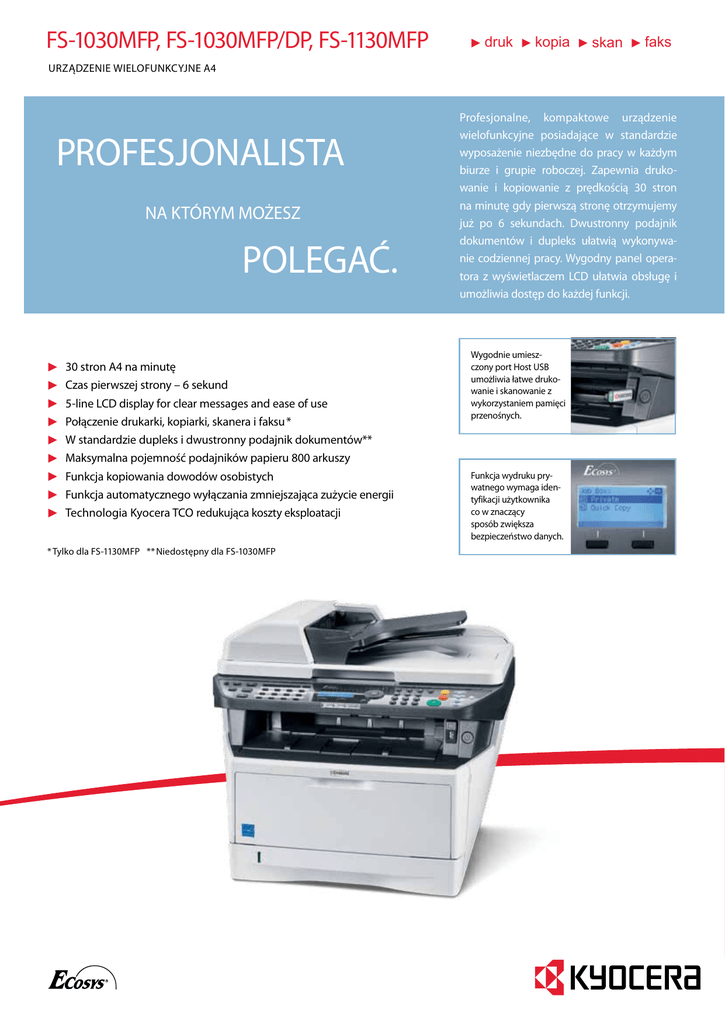 FS-1030MFP, FS-1030MFP/DP, FS-1130MFP druk kopia skan faks URZĄDZENIE WIELOFUNKCYJNE A4 ProfesJonalista na którym możesz polegać. 30 stron A4 na minutę Czas pierwszej strony – 6 sekund 5-line LCD display for clear messages and ease of use Połączenie drukarki, kopiarki, skanera i faksu * W standardzie dupleks i dwustronny podajnik dokumentów** Maksymalna pojemność podajników papieru 800 arkuszy Funkcja kopiowania dowodów osobistych Funkcja automatycznego wyłączania zmniejszająca zużycie energii Technologia Kyocera TCO redukująca koszty eksploatacji * Tylko dla FS-1130MFP ** Niedostępny dla FS-1030MFP Profesjonalne, kompaktowe urządzenie wielofunkcyjne posiadające w standardzie wyposażenie niezbędne do pracy w każdym biurze i grupie roboczej. Zapewnia drukowanie i kopiowanie z prędkością 30 stron na minutę gdy pierwszą stronę otrzymujemy już po 6 sekundach. Dwustronny podajnik dokumentów i dupleks ułatwią wykonywanie codziennej pracy. Wygodny panel operatora z wyświetlaczem LCD ułatwia obsługę i umożliwia dostęp do każdej funkcji. Wygodnie umieszczony port Host USB umożliwia łatwe drukowanie i skanowanie z wykorzystaniem pamięci przenośnych. Funkcja wydruku prywatnego wymaga identyfikacji użytkownika co w znaczący sposób zwiększa bezpieczeństwo danych. FS-1030MFP, FS-1030MFP/DP, FS-1130MFP URZĄDZENIE WIELOFUNKCYJNE A4 PRESCRIBE IIe Prescribe IIe jest zarówno językiem sterującym jak i językiem opisu strony we wszystkich drukarkach Kyocera Mita. To dzięki niemu możliwe jest drukowanie kompleksowej grafiki, logo oraz formularzy pod każdym systemem operacyjnym. Formularze mogą zostać na stałe zapisane w urządzeniu i natychmiast drukowane na żądanie użytkownika z panelu sterowania, co znacznie zmniejsza ruch w sieci komputerowej. KM NetViewer KM NetViewer umożliwia monitorowanie i kontrolowanie wszystkich drukarek ECOSYS i cyfrowych urządzeń wielofunkcyjnych KYOCERA z dowolnego komputera pod kontrolą systemu Windows© PC zapewniając doskonałą administrację w sieci z wykorzystaniem standardowego protokołu SNMP. Status Monitor i Command Center Monitor Statusu pokazuje aktualny stan drukarki i umożliwia bezpośreni dostęp do Command Center w celu modyfikacji ustawień, do których nie ma dostępu z poziomu sterownika (np. ustawienia sieciowe, regulacja stanu uśpienia czy blokowanie panela operatora). Interfejs Host USB dla pamięci Flash USB Pliki PDF mogą być drukowane bezpośrednio z pamięci USB Flash (np. USB Pendrive) poprzez interfejs USB host. Dokumenty są wybierane z panelu operatora. INFORMACJE OGÓLNE DRUKOWANIE Wybieranie 1-przyciskowe: 22 numery Technologia: KYOCERA ECOSYS Laser Język kontrolera: PRESCRIBE IIe Książka adresowa: 100 pozycji Wyświetlacz: 5-liniowy ekran LCD Emulacje: PCL6 (5c/XL), KPDL 3 (zgodna z PostScript 3), Line Printer, IBM Proprinter X24E, Epson LQ-850, Diablo 630, wydruk bezpośredni PDF i XPS (wymaga dodatkowej pamięci) Gęstość skanowania w trybie normal: 8 pkt/mm x 3,85 linii/mm w trybie fine: 8 pkt/mm x 7,7 linii/mm w trybie superfine: 8 pkt/mm x 15,4 linii/mm w trybie ultrafine: 16 pkt/mm x 15,4 linii/mm Prędkość (druk/kopia): 30 stron A4 na minutę Rozdzielczość: 1200 dpi (1800 x 800 dpi, druk), 600 x 600 dpi w 256 odcieniach (skan/kopia) Maksymalna wydajność: 20 000 stron miesięcznie Czas nagrzewania: ok. 20 sekund Czas pierwszego wydruku: ok. 6 sekund Czas pierwszej kopii: ok. 6,9 sekundy Procesor: PowerPC 440/667 MHz Pamięć: Standard 256 MB, maks. 768 MB Interfejsy: USB 2.0 (Hi-Speed), USB Host, Fast Ethernet 10/100Base-TX, gniazdo karty CompactFlash®, gniazdo drugiej karty sieciowej (tylko FS-1035MFP i DP) Konta użytkowników: 20 Wymiary (szer x głęb x wys): FS-1030MFP: 494 x 410 x 366 mm FS-1030MFP/DP, FS-1130MFP: 494 x 430 x 448 mm Obsługiwane systemy operacyjne: wszystkie aktualne wersje Microsoft Windows, MAC OS X wersja 10.4 lub wyższa, Unix, Linux oraz inne według potrzeb Czcionki/kody kreskowe: 93 czcionki konturowe (PCL6, zgodność z HP) + 8 (Windows Vista), 101 (KPDL3), 1 czcionka bitmapowa, 45 typów kodów 1-wymiarowych, 1 kod 2-wymiarowy (PDF417) Funkcje: druk bezpośredni PDF z szyfrowaniem, druk IPP, tryb drukowania e-mail, druk WSD, druk bezpieczny przez SSL, IPsec, SNMPv3 i druk prywatny (wymaga dodatkowej pamięci) KOPIOWANIE Maksymalny format oryginału: A4/Legal Kopiowanie ciągłe: 1–999 Zakres zoom: 25–400% co 1% Stałe współczynniki zoom: 7 zmniejszeń/5 powiększeń Waga: FS-1030MDP: ok. 15 kg Tryby ekspozycji: Automatyczny i ręczny (7-stopniowy) FS-1030MFP/DP, FS-1130MFP: ok. 18 kg Wybór typu oryginału: Tekst + foto, tekst, foto Zasilanie: AC 220 ~ 240 V, 50/60 Hz Funkcje: Skanuj-raz-drukuj-wielokrotnie, sorter elektroniczZużycie energii FS-1030MFP FS-1030/DP/1130MFP ny, kopia 2w1, 4w1, kopiowanie dowodu osobistego, rezerKopia/druk: 480 W 482 W wacja pracy, ważny wydruk, program, funkcja auto-dupleks, Tryb gotowości: 78 W 83 W kopia dzielona, kontynuacja skanowania, automatyczna Tryb uśpienia: 7,8 W 10,6 W zmiana kasety, kontrola gęstości kopii Tryb auto-wyłączenia: 0,5 W 0,5 W SKANOWANIE Hałas (ISO 7779 / ISO 9296): Kopia/druk: 54 dB(A) Tryb gotowości: 30 dB(A) Funkcjonalność: Skcan-do-e-mail, Skan-do-FTP (FTP przez SSL), do-SMB, do USB Host, TWAIN (USB), WSD (WIA) Standardy bezpieczeństwa: TÜV/GS, CE To urządzenie jest produkowane zgodnie z normą jakości ISO 9001 oraz normą ochrony środowiska ISO 14001. Prędkość: 35 obrazów (300 dpi, A4, cz/b), 14 obrazów (300 dpi, A4, kolor) OBSŁUGA PAPIERU Max. scan size: A4, Legal Wszystkie podane pojemności dotyczą papieru o grubości maks. 0.11 mm. Zaleca się stosowanie papieru polecanego przez KYOCERA w normalnych warunkach otoczenia. Rozpoznawanie oryginału: Tekst, foto, tekst + foto, OCR Pojemność wejściowa: 50-kartkowa taca wielofunkcyjna, 60–220 g/m2, A4, A5, A6, B5, Letter, Legal, Folio, koperty, inne (od 70 x 148 do 216 x 356 mm), 250-k
