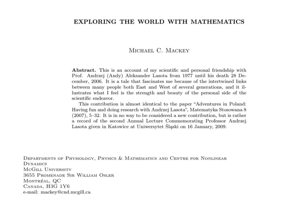 EXPLORING THE WORLD WITH MATHEMATICS Michael C. Mackey Abstract. This is an account of my scientific and personal friendship with Prof. Andrzej (Andy) Aleksander Lasota from 1977 until his death 28 December, 2006. It is a tale that fascinates me because of the intertwined links between many people both East and West of several generations, and it illustrates what I feel is the strength and beauty of the personal side of the scientific endeavor. This contribution is almost identical to the paper “Adventures in Poland: Having fun and doing research with Andrzej Lasota”, Matematyka Stosowana 8 (2007), 5–32. It is in no way to be considered a new contribution, but is rather a record of the second Annual Lecture Commemorating Professor Andrzej Lasota given in Katowice at Uniwersytet Śląski on 16 January, 2009. Departments of Physiology, Physics & Mathematics and Centre for Nonlinear Dynamics McGill University 3655 Promenade Sir William Osler Montréal, QC Canada, H3G 1Y6 e-mail: [email protected]
