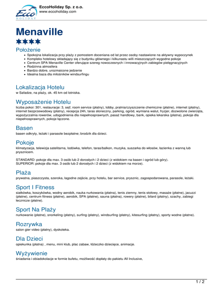 EccoHoliday Sp. z o.o. www.eccoholiday.com Menaville Położenie Spokojna lokalizacja przy plaży z pomostem doceniana od lat przez osoby nastawione na aktywny wypoczynek Kompleks hotelowy składający się z budynku głównego i kilkunastu willi mieszczących wygodne pokoje Centrum SPA Menaville Center oferujące szereg nowoczesnych i innowacyjnych zabiegów pielęgnacyjnych Rodzinna atmosfera Bardzo dobre, urozmaicone jedzenie Idealna baza dla miłośników windsurfingu Lokalizacja Hotelu w Safadze, na plaży, ok. 45 km od lotniska. Wyposażenie Hotelu liczba pokoi: 301, restauracje: 3, sejf, room service (płatny), lobby, pralnia/czyszczenie chemiczne (płatne), internet (płatny), internet bezprzewodowy (płatny), recepcja 24h, taras słoneczny, parking, ogród, wymiana walut, fryzjer, dozwolone zwierzęta, wypożyczalnia rowerów, udogodnienia dla niepełnosprawnych, pasaż handlowy, bank, opieka lekarska (płatna), pokoje dla niepełnosprawnych, pokoje łączone. Basen basen odkryty, leżaki i parasole bezpłatne; brodzik dla dzieci. Pokoje klimatyzacja, telewizja satelitarna, lodówka, telefon, taras/balkon, muzyka, suszarka do włosów, łazienka z wanną lub prysznicem. STANDARD: pokoje dla max. 3 osób lub 2 dorosłych i 2 dzieci (z widokiem na basen i ogród lub góry). SUPERIOR: pokoje dla max. 3 osób lub 2 dorosłych i 2 dzieci (z widokiem na morze). Plaża prywatna, piaszczysta, szeroka, łagodne zejście, przy hotelu, bar service, prysznic, zagospodarowana, parasole, leżaki. Sport I Fitness siatkówka, koszykówka, wodny aerobik, nauka nurkowania (płatna), tenis ziemny, tenis stołowy, masaże (płatne), jacuzzi (płatne), centrum fitness (płatne), aerobik, SPA (płatne), sauna (płatna), rowery (płatne), bilard (płatny), szachy, zabiegi lecznicze (płatne). Sport Na Plaży nurkowanie (płatne), snorkeling (płatny), surfing (płatny), windsurfing (płatny), kitesurfing (płatny), sporty wodne (płatne). Rozrywka salon gier video (płatny), dyskoteka. Dla Dzieci opiekunka (płatna) , menu, mini klub, plac zabaw, łóżeczko dziecięce, animacje. Wyżywienie śniadania i obiadokolacje w formie bufetu, możliwość dopłaty do pakietu All Inclusive, 1/2 EccoHoliday Sp. z o.o. www.eccoholiday.com Dopłaty do kolacji w dniach 24/12 i 31/12 są obowiązkowe! All Inclusive Zawiera śniadania, lunch i obiadokolację w formie bufetu w głównej restauracji. W ciągu dnia w trzech barach oferowane są: ciepłe i zimne napoje bezalkoholowe, soft drinki oraz lokalne alkohole (piwo, wino, whisky, gin, brandy, wódka, rum). Oferta: Wylot 01.01.1970 Powrót 01.01.1970 godz. godz. Zakwaterowanie -() Dni dni Cena os. dorosła 2/2 Powered by TCPDF (www.tcpdf.org)