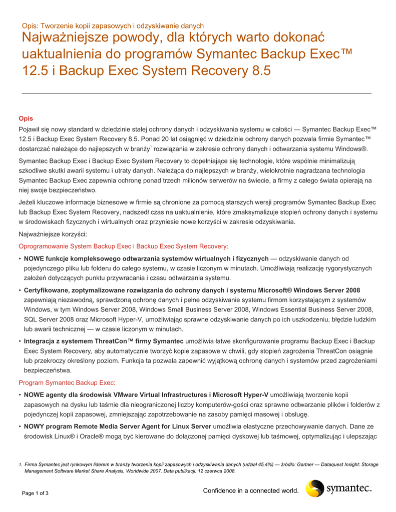 Opis: Tworzenie kopii zapasowych i odzyskiwanie danych Najważniejsze powody, dla których warto dokonać uaktualnienia do programów Symantec Backup Exec™ 12.5 i Backup Exec System Recovery 8.5 Opis Pojawił się nowy standard w dziedzinie stałej ochrony danych i odzyskiwania systemu w całości — Symantec Backup Exec™ 12.5 i Backup Exec System Recovery 8.5. Ponad 20 lat osiągnięć w dziedzinie ochrony danych pozwala firmie Symantec™ dostarczać należące do najlepszych w branży1 rozwiązania w zakresie ochrony danych i odtwarzania systemu Windows®. Symantec Backup Exec i Backup Exec System Recovery to dopełniające się technologie, które wspólnie minimalizują szkodliwe skutki awarii systemu i utraty danych. Należąca do najlepszych w branży, wielokrotnie nagradzana technologia Symantec Backup Exec zapewnia ochronę ponad trzech milionów serwerów na świecie, a firmy z całego świata opierają na niej swoje bezpieczeństwo. Jeżeli kluczowe informacje biznesowe w firmie są chronione za pomocą starszych wersji programów Symantec Backup Exec lub Backup Exec System Recovery, nadszedł czas na uaktualnienie, które zmaksymalizuje stopień ochrony danych i systemu w środowiskach fizycznych i wirtualnych oraz przyniesie nowe korzyści w zakresie odzyskiwania. Najważniejsze korzyści: Oprogramowanie System Backup Exec i Backup Exec System Recovery: • NOWE funkcje kompleksowego odtwarzania systemów wirtualnych i fizycznych — odzyskiwanie danych od pojedynczego pliku lub folderu do całego systemu, w czasie liczonym w minutach. Umożliwiają realizację rygorystycznych założeń dotyczących punktu przywracania i czasu odtwarzania systemu. • Certyfikowane, zoptymalizowane rozwiązania do ochrony danych i systemu Microsoft® Windows Server 2008 zapewniają niezawodną, sprawdzoną ochronę danych i pełne odzyskiwanie systemu firmom korzystającym z systemów Windows, w tym Windows Server 2008, Windows Small Business Server 2008, Windows Essential Business Server 2008, SQL Server 2008 oraz Microsoft Hyper-V, umożliwiając sprawne odzyskiwanie danych po ich uszkodzeniu, błędzie ludzkim lub awarii technicznej — w czasie liczonym w minutach. • Integracja z systemem ThreatCon™ firmy Symantec umożliwia łatwe skonfigurowanie programu Backup Exec i Backup Exec System Recovery, aby automatycznie tworzyć kopie zapasowe w chwili, gdy stopień zagrożenia ThreatCon osiągnie lub przekroczy określony poziom. Funkcja ta pozwala zapewnić wyjątkową ochronę danych i systemów przed zagrożeniami bezpieczeństwa. Program Symantec Backup Exec: • NOWE agenty dla środowisk VMware Virtual Infrastructures i Microsoft Hyper-V umożliwiają tworzenie kopii zapasowych na dysku lub taśmie dla nieograniczonej liczby komputerów-gości oraz sprawne odtwarzanie plików i folderów z pojedynczej kopii zapasowej, zmniejszając zapotrzebowanie na zasoby pamięci masowej i obsługę. • NOWY program Remote Media Server Agent for Linux Server umożliwia elastyczne przechowywanie danych. Dane ze środowisk Linux® i Oracle® mogą być kierowane do dołączonej pamięci dyskowej lub taśmowej, optymalizując i ulepszając 1. Firma Symantec jest rynkowym liderem w branży tworzenia kopii zapasowych i odzyskiwania danych (udział 45,4%) — źródło: Gartner — Dataquest Insight: Storage Management Software Market Share Analysis, Worldwide 2007. Data publikacji: 12 czerwca 2008. Page 1 of 3 Confidence in a connected world. Opis: Tworzenie kopii zapasowych i odzyskiwanie danych Najważniejsze powody, dla których warto dokonać uaktualnienia do programów Symantec Backup Exec™ 12.5 i proces tworzenia kopii zapasowych w systemie Linux. • NOWY menedżer infrastruktury jest oparty na jednej z najlepszych na rynku technologii Altiris i umożliwia administratorom łatwą inwentaryzację środowiska programu Backup Exec pozwalającą na szybkie znajdowanie chronionych i niechronionych systemów, instalację nowych składników programu Backup Exec w niechronionych systemach oraz łatwe uaktualnianie składników programu Backup Exec do ich najnowszej wersji. • Udoskonalone odzyskiwanie danych na dowolnym poziomie szczegółowości w środowiskach Exchange, Active Directory i agentach SharePoint umożliwia administratorom odtwarzanie pojedynczych wiadomości e-mail, preferencji użytkownika, dokumentów i elementów list z kopii zapasowej tworzonej jednoprzebiegowo. Ponadto funkcja odzyskiwania danych na dowolnym poziomie szczegółowości dla programu Exchange eliminuje potrzebę wykonywania czasochłonnych kopii zapasowych całych skrzynek pocztowych. • NOWY program Backup Exec Agent for Symantec Enterprise Vault™ zapewnia wykonywanie kopii zapasowych i łatwe przywracanie cennych archiwów, oferując kompleksową ochronę danych i uproszczone zarządzanie odtwarzaniem archiwów programu Enterprise Vault, co pozwala na stałą dostępność kluczowych informacji biznesowych. • NOWE funkcje integracji z technologią Symantec Online Storage™2 zapewniają ekonomiczne i łatwe w zarządzaniu miejsce do przechowywania danych poza siedzibą firmy — w sieci Symantec Protection Network. Integracja z technologią Symantec Online Storage umożliwia użytkownikom wybór zewnętrznej lokalizacji kopii zapasowej za pomocą konsoli Backup Exec i dostęp do nowej możliwości ochrony danych w lokalizacji zewnętrznej lub zastępuje pochłaniające znaczne ilości zasobów taśmy. • Rozbudowany moduł NDMP umożliwia elastyczne tworzenie kopii zapasowych chroniących urządzenia NAS wykorzystujące protokół Network Data Management (NDMP). Obsługa tworzenia kopii zapasowych zdalnych urządzeń wykorzystujących protokół NDMP w serwerze nośników Backup Exec obejmuje współużytkowane środowiska pamięci masowych pomiędzy serwerami nośników a urządzeniami NDMP. Program Symantec Backup Exec System Recovery: • Udoskonalone mechanizmy konwersji do środowisk wirtualny