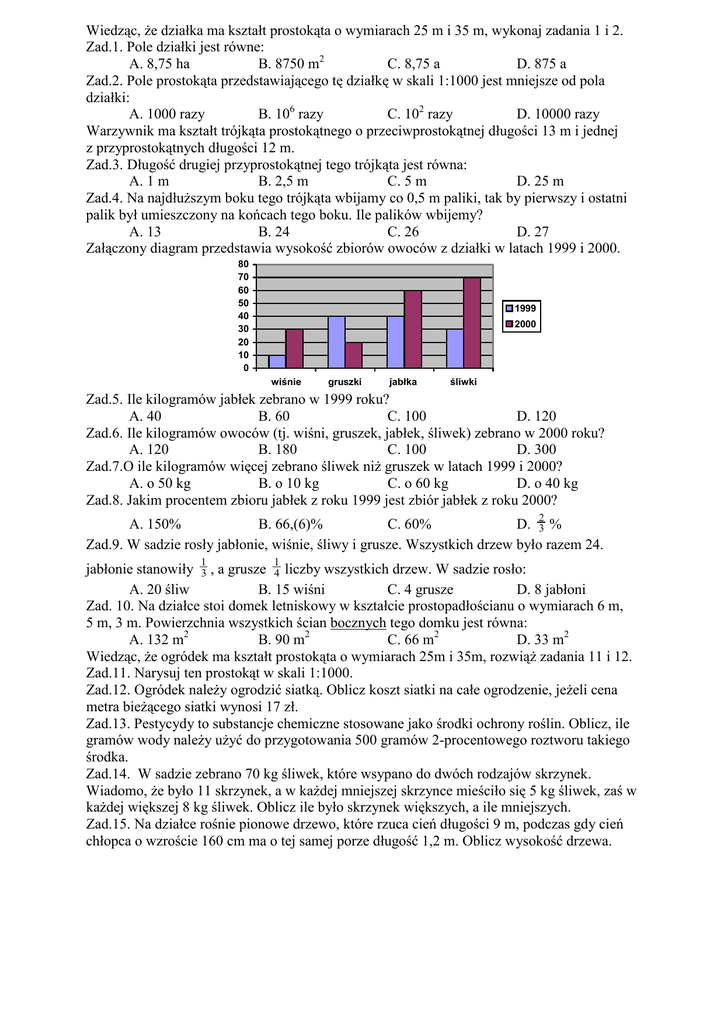 Wiedząc, Ŝe działka ma kształt prostokąta o wymiarach 25 m i 35 m, wykonaj zadania 1 i 2. Zad.1. Pole działki jest równe: A. 8,75 ha B. 8750 m2 C. 8,75 a D. 875 a Zad.2. Pole prostokąta przedstawiającego tę działkę w skali 1:1000 jest mniejsze od pola działki: C. 102 razy D. 10000 razy A. 1000 razy B. 106 razy Warzywnik ma kształt trójkąta prostokątnego o przeciwprostokątnej długości 13 m i jednej z przyprostokątnych długości 12 m. Zad.3. Długość drugiej przyprostokątnej tego trójkąta jest równa: A. 1 m B. 2,5 m C. 5 m D. 25 m Zad.4. Na najdłuŜszym boku tego trójkąta wbijamy co 0,5 m paliki, tak by pierwszy i ostatni palik był umieszczony na końcach tego boku. Ile palików wbijemy? A. 13 B. 24 C. 26 D. 27 Załączony diagram przedstawia wysokość zbiorów owoców z działki w latach 1999 i 2000. 80 70 60 50 40 30 20 10 0 1999 2000 wiśnie gruszki jabłka śliwki Zad.5. Ile kilogramów jabłek zebrano w 1999 roku? A. 40 B. 60 C. 100 D. 120 Zad.6. Ile kilogramów owoców (tj. wiśni, gruszek, jabłek, śliwek) zebrano w 2000 roku? A. 120 B. 180 C. 100 D. 300 Zad.7.O ile kilogramów więcej zebrano śliwek niŜ gruszek w latach 1999 i 2000? A. o 50 kg B. o 10 kg C. o 60 kg D. o 40 kg Zad.8. Jakim procentem zbioru jabłek z roku 1999 jest zbiór jabłek z roku 2000? 2 A. 150% B. 66,(6)% C. 60% D. 3 % Zad.9. W sadzie rosły jabłonie, wiśnie, śliwy i grusze. Wszystkich drzew było razem 24. 1 1 jabłonie stanowiły 3 , a grusze 4 liczby wszystkich drzew. W sadzie rosło: A. 20 śliw B. 15 wiśni C. 4 grusze D. 8 jabłoni Zad. 10. Na działce stoi domek letniskowy w kształcie prostopadłościanu o wymiarach 6 m, 5 m, 3 m. Powierzchnia wszystkich ścian bocznych tego domku jest równa: A. 132 m2 B. 90 m2 C. 66 m2 D. 33 m2 Wiedząc, Ŝe ogródek ma kształt prostokąta o wymiarach 25m i 35m, rozwiąŜ zadania 11 i 12. Zad.11. Narysuj ten prostokąt w skali 1:1000. Zad.12. Ogródek naleŜy ogrodzić siatką. Oblicz koszt siatki na całe ogrodzenie, jeŜeli cena metra bieŜącego siatki wynosi 17 zł. Zad.13. Pestycydy to substancje chemiczne stosowane jako środki ochrony roślin. Oblicz, ile gramów wody naleŜy uŜyć do przygotowania 500 gramów 2-procentowego roztworu takiego środka. Zad.14. W sadzie zebrano 70 kg śliwek, które wsypano do dwóch rodzajów skrzynek. Wiadomo, Ŝe było 11 skrzynek, a w kaŜdej mniejszej skrzynce mieściło się 5 kg śliwek, zaś w kaŜdej większej 8 kg śliwek. Oblicz ile było skrzynek większych, a ile mniejszych. Zad.15. Na działce rośnie pionowe drzewo, które rzuca cień długości 9 m, podczas gdy cień chłopca o wzroście 160 cm ma o tej samej porze długość 1,2 m. Oblicz wysokość drzewa.