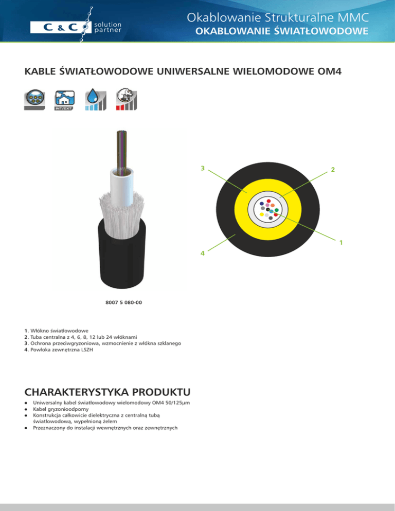 Okablowanie Strukturalne MMC OKABLOWANIE ŚWIATŁOWODOWE KABLE ŚWIATŁOWODOWE UNIWERSALNE WIELOMODOWE OM4 3 2 1 4 8007 5 080-00 1. Włókno światłowodowe 2. Tuba centralna z 4, 6, 8, 12 lub 24 włóknami 3. Ochrona przeciwgryzoniowa, wzmocnienie z włókna szklanego 4. Powłoka zewnętrzna LSZH CHARAKTERYSTYKA PRODUKTU l l l l Uniwersalny kabel światłowodowy wielomodowy OM4 50/125µm Kabel gryzonioodporny Konstrukcja całkowicie dielektryczna z centralną tubą światłowodową, wypełnioną żelem Przeznaczony do instalacji wewnętrznych oraz zewnętrznych Okablowanie Strukturalne MMC OKABLOWANIE ŚWIATŁOWODOWE PARAMETRY TECHNICZNE Liczba włókien szt Średnica kabla Waga Zalecane maks. obciążenie rozciągające 4 8 Zalecany promień gięcia - zainstalowany Odporność na zgniatanie mm 7 7 7 7.6 51 51 50 59 mm 140 140 140 150 mm 105 105 105 115 1600 N/dm 1500 Zakres temp. pracy 0 -30/+70 Zakres temp. instalacji 0 -10/+50 Zakres temp. magazynowania 0 -30/+70 C C C INFORMACJE DOTYCZĄCE ZAMÓWIENIA Numer katalogowy Nazwa 8007 5 078-00 Kabel światłowodowy uniwersalny OM4 50/125 U-DQ(ZN)BH, 4G, 1.6 kN 8007 5 412-00 Kabel światłowodowy uniwersalny OM4 50/125 U-DQ(ZN)BH, 6G, 1.6 kN 8007 5 079-00 Kabel światłowodowy uniwersalny OM4 50/125 U-DQ(ZN)BH, 8G, 1.6 kN 8007 5 080-00 Kabel światłowodowy uniwersalny OM4 50/125 U-DQ(ZN)BH, 12G, 1.6 kN 8007 5 081-00 Kabel światłowodowy uniwersalny OM4 50/125 U-DQ(ZN)BH, 24G, 1.6 kN C&C Partners Sp. z o.o. ul. 17 Stycznia 119, 121 64-100 Leszno Infolinia: 65 525 55 00 C&C Partners Sp. z o.o. ul. Polanki 67c 80-302 Gdańsk e-mail: [email protected] 24 kg/km N Zalecany promień gięcia - podczas instalacji 12 C&C Partners Sp. z o.o. ul. Malinowa 8 40-692 Katowice www.ccpartners.pl C&C Partners Sp. z o.o. Ursynów Business Park ul. Puławska 303 wejście B 02-785 Warszawa www.b2b-ccpartners.pl