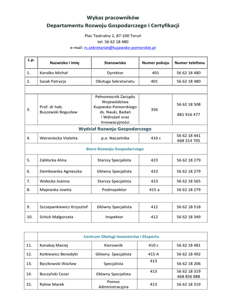 Wykaz pracowników Departamentu Rozwoju Gospodarczego i Certyfikacji Plac Teatralny 2, 87-100 Toruń tel. 56 62 18 480 e-mail: [email protected] L.p. Nazwisko i imię Stanowisko Numer pokoju Numer telefonu 1. Korolko Michał Dyrektor 401 56 62 18 480 2. Sasak Patrycja Obsługa Sekretariatu 401 56 62 18 480 Pełnomocnik Zarządu Województwa Kujawsko-Pomorskiego ds. Nauki, Badań i Wdrożeń oraz Innowacyjności 356 3. Prof. dr hab. Buszewski Bogusław 56 62 18 508 881 916 477 Wydział Rozwoju Gospodarczego 4. Weroniecka Violetta p.o. Naczelnika 410 c 56 62 18 441 668 314 705 Biuro Rozwoju Gospodarczego 5. Zabłocka Alina Starszy Specjalista 423 56 62 18 279 6. Dembowska Agnieszka Główny Specjalista 423 56 62 18 279 7. Wałecka Joanna Starszy Specjalista 423 56 62 18 565 8. Majewska Jowita Podinspektor 415 a 56 62 18 279 9. Szczepankiewicz Krzysztof Główny Specjalista 412 56 62 18 518 10. Schick Małgorzata Inspektor 412 56 62 18 349 Centrum Obsługi Inwestorów i Eksportu 11. Kanabaj Maciej Kierownik 410 c 56 62 18 481 12. Kotkiewicz Benedykt Główny Specjalista 415 A 56 62 18 492 13. Byczkowski Wacław Specjalista 14. Buczyński Cezar 15. Ryłow Marek Główny Specjalista Pomoc Administracyjna 413 56 62 18 206 413 56 62 18 319 668 856 888 413 56 62 18 319 16. Tyszkiewicz Tatjana Główny Specjalista 415 A 56 62 18 443 Kierownik 357 56 62 18 495 Agenda Nauki i Innowacyjności 17. Dolecka Marta 18. Charycka Karolina Podinspektor 358 56 62 18 508 19. Draspa Anna Maria Główny Specjalista 357 56 62 18 495 20. Mazurska Dorota Podinspektor 358 56 62 18 508 21. Rozpłoch Marek Młodszy Referent 358 56 62 18 508 Wydział Certyfikacji RPO ul. M. Skłodowskiej-Curie 73, 87-100 Toruń tel. 56 656 11 30, tel.kom. 664 036 145, fax. 56 656 11 29 e-mail: [email protected] Lp. 22. 23. Nazwisko i imię Sąsiadek–Chuchra Anna Kaźmierczak Agata Stanowisko Nr pokoju Nr telefonu Zastępca Dyrektora Departamentu 17 56 656 11 30 Stanowisko ds. organizacji pracy departamentu 17 56 656 11 30 664-036-145 Wydział Certyfikacji RPO 24. Hejenkowska Danuta Naczelnik Wydziału 21 602-381-056 Starszy Specjalista 3B 571-293-029 Biuro ds. certyfikacji 25. Ałtyn Justyna 26. Domagalski Rafał Inspektor 5 571-293-002 27. Gross Katarzyna Specjalista 3 608-453-898 28. Jabłońska Agnieszka Inspektor 3B 797-304-101 29. Karwowska Marta Podinspektor 5 797-304-113 30. Zawałkiewicz Karolina Podinspektor 3 795-164-357