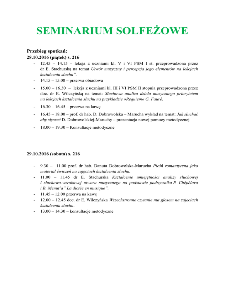 SEMINARIUM SOLFEŻOWE Przebieg spotkań: 28.10.2016 (piątek) s. 216 - - 12.45 – 14.15 – lekcja z uczniami kl. V i VI PSM I st. przeprowadzona przez dr E. Stachurską na temat Utwór muzyczny i percepcja jego elementów na lekcjach kształcenia słuchu”. 14.15 – 15.00 – przerwa obiadowa - 15.00 – 16.30 – lekcja z uczniami kl. III i VI PSM II stopnia przeprowadzona przez doc. dr E. Wilczyńską na temat: Słuchowa analiza dzieła muzycznego priorytetem na lekcjach kształcenia słuchu na przykładzie »Requiem« G. Fauré. - 16.30 – 16.45 – przerwa na kawę - 16.45 – 18.00 – prof. dr hab. D. Dobrowolska – Marucha wykład na temat: Jak słuchać aby słyszeć D. Dobrowolskiej-Maruchy – prezentacja nowej pomocy metodycznej - 18.00 – 19.30 – Konsultacje metodyczne 29.10.2016 (sobota) s. 216 - - 9.30 – 11.00 prof. dr hab. Danuta Dobrowolska-Marucha Pieśń romantyczna jako materiał ćwiczeń na zajęciach kształcenia słuchu. 11.00 – 11.45 dr E. Stachurska Kształcenie umiejętności analizy słuchowej i słuchowo-wzrokowej utworu muzycznego na podstawie podręcznika P. Chépélova i B. Menut’a” La dictée en musique”. 11.45 – 12.00 przerwa na kawę 12.00 – 12.45 doc. dr E. Wilczyńska Wszechstronne czytanie nut głosem na zajęciach kształcenia słuchu. 13.00 – 14.30 – konsultacje metodyczne