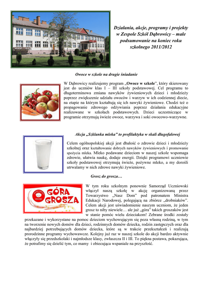 Działania, akcje, programy i projekty w Zespole Szkół Dąbrowicy – małe podsumowanie na koniec roku szkolnego 2011/2012 Owoce w szkole na drugie śniadanie W Dąbrowicy realizujemy program „Owoce w szkole”, który skierowany jest do uczniów klas I – III szkoły podstawowej. Cel programu to długoterminowa zmiana nawyków żywieniowych dzieci i młodzieży poprzez zwiększenie udziału owoców i warzyw w ich codziennej diecie, na etapie na którym kształtują się ich nawyki żywieniowe. Chodzi też o propagowanie zdrowego odżywiania poprzez działania edukacyjne realizowane w szkołach podstawowych. Dzieci uczestniczące w programie otrzymują świeże owoce, warzywa i soki owocowo-warzywne. Akcja „Szklanka mleka” to profilaktyka w skali długofalowej Celem ogólnopolskiej akcji jest dbałość o zdrowie dzieci i młodzieży szkolnej oraz kształtowanie dobrych nawyków żywieniowych i promowanie spożycia mleka. Mleko podawane dzieciom w naszej szkole wspomaga zdrowie, ułatwia naukę, dodaje energii. Dzięki programowi uczniowie szkoły podstawowej otrzymują świeże, pożywne mleko, a my dorośli utrwalamy w nich zdrowe nawyki żywieniowe. Grosz do grosza… W tym roku szkolnym ponownie Samorząd Uczniowski włączył naszą szkołę w akcję organizowaną przez Towarzystwo „Nasz Dom” pod patronatem Ministra Edukacji Narodowej, polegającą na zbiórce „drobniaków”. Celem akcji jest uświadomienie naszym uczniom, że jeden grosz to niby niewiele… ale już „góra” takich groszaków jest w stanie pomóc wielu dzieciakom! Zebrane środki zostały przekazane i wykorzystane na pomoc dzieciom wychowującym się poza własną rodziną, w tym na tworzenie nowych domów dla dzieci, rodzinnych domów dziecka, rodzin zastępczych oraz dla najbardziej potrzebujących domów dziecka, które są w trakcie przekształceń i realizują prorodzinne programy wychowawcze. Kolejny już raz w naszej szkole do akcji bardzo aktywnie włączyły się przedszkolaki i najmłodsze klasy, zwłaszcza II i III. To piękna postawa, pokazująca, że potrafimy się dzielić tym, co mamy i obiecująca wspaniale na przyszłość. Zbiórka surowców wtórnych Uczestniczyliśmy w konkursie powiatowym „Z Ekologią na Ty” organizowanym w ramach 10 jubileuszowej edycji przez Miejski Zakład Komunalny w Leżajsku wspólnie z Powiatowym Szkolnym Związkiem Sportowym w Leżajsku. Konkurs prowadzony pod hasłem: „Zbieramy surowce wtórne chroniąc naturalne środowisko człowieka” uczy dzieci i młodzież prawidłowego postępowania z odpadami, w tym także ich „domowej” segregacji. W tym roku do akcji przystąpiło 21 szkół z terenu powiatu leżajskiego. Dzięki ogromnemu zaangażowaniu uczniów i rodziców nasza szkoła w podsumowaniu uzbierała 31,00 kg surowca w przeliczeniu na 1 ucznia i zdobyła V miejsce. Otrzymaliśmy sprzęt sportowy do wspólnego użytkowania na zajęciach rekreacyjnych, a uczniowie klas gimnazjalnych uczestniczyli w dwudniowym powiatowym rajdzie rowerowym na podsumowanie działań konkursowych. W naszej szkole podejmujemy wiele cyklicznych inicjatyw, które korzystnie wpływają na nasze najbliższe otoczenie, promują ekologiczny styl życia, a tym samym czynią naszą Ziemię czystszą i piękniejszą. Wszystko, co dajesz innym, dajesz samemu sobie Z okazji Dnia Dziecka wspólnie z Gminnym Ośrodkiem Kultury zorganizowaliśmy zbiórkę zabawek, artykułów spożywczych oraz przemysłowych i w ten sposób pomagaliśmy Podkarpackiemu Hospicjum w zorganizowaniu paczek dla Pacjentów placówki i ich rodzeństwa z okazji Dnia Dziecka. Przed końcem roku 2011 nasi uczniowie tworzyli kartki i życzenia świąteczne adresowane do małych pacjentów. Podkarpackie Hospicjum dla Dzieci jest jedyną tego typu, specjalistyczną organizacją działającą na terenie województwa podkarpackiego, jest powołane, aby obejmować opieką domową dzieci i młodzież z chorobami nowotworowymi oraz innymi nieuleczalnymi i postępującymi schorzeniami. „Wszystko, co dajesz innym, dajesz samemu sobie” - te słowa Brunona Ferraro mają dla naszych uczniów głęboki sens; dajemy, czyli dzielimy się tym, co mamy. Sprawiamy radość innym, bo chcemy, bo tego potrzebują, a tym samym radujemy samych sobie… nasze serca. Ratujemy i uczymy ratować Dzieci narażone są na wiele niebezpieczeństw, które niesie z sobą postęp cywilizacyjny. Naszym zadaniem jest przygotowanie ich do bezpiecznego przebywania w otaczającym środowisku, radzenia sobie w sytuacjach zagrożenia i wyrobienie umiejętności udzielenia pierwszej pomocy poszkodowanemu w realnej sytuacji wypadku. W Zespole Szkół w Dąbrowicy realizowany jest edukacyjny Program Ratujemy i Uczymy Ratować objęty honorowym patronatem Minister Edukacji Narodowej RP. Po specjalistycznym przeszkoleniu przez wolontariuszy Pokojowego Patrolu Wielkiej Orkiestry Świątecznej Pomocy program od 2011 roku wdrażany jest wśród uczniów klas I – III szkoły podstawowej przez panie Lucynę Pietrychę i Beatę Kamińską z wykorzystaniem otrzymanych pomocy edukacyjnych (podręczniki dla nauczycieli i uczniów, tablica poglądowa, fantomy). Uczniowie nabywają wiedzę i umiejętności z zakresu: bezpieczeństwa, sprawdzania przytomności, wzywania pomocy, sprawdzania oddechu, ustalania nieprzytomnego w pozycji bocznej, oddechów ratowniczych i uciskania klatki piersiowej oraz łańcucha przeżycia. Efekty prowadzonych działań to niezaprzeczalna wartość sama w sobie: wyposażenie dzieci w wiedzę i umiejętności z zakresu rozpoznawania zagrożeń, zasad udzielania pierwszej pomocy, przezwyciężenie lęku i obaw przed podejmowaniem działań w sytuacjach zagrożenia, wyrobienie nawyku wzywania pomocy i powiadamiania służb ratowniczych. Działania projektu są rozszerzane o szkolenia uczniów klas starszych. Z „Akademią Czystych Rąk Carex” uczymy jak prawidłowo myć ręce Nasza szkoła bierze udział w projekcie 