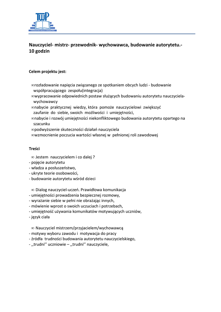 Nauczyciel- mistrz- przewodnik- wychowawca, budowanie autorytetu.10 godzin Celem projektu jest: • rozładowanie napięcia związanego ze spotkaniem obcych ludzi - budowanie współpracującego zespołu(integracja) • wypracowanie odpowiednich postaw służących budowaniu autorytetu nauczycielawychowawcy • nabycie praktycznej wiedzy, która pomoże nauczycielowi zwiększyć zaufanie do siebie, swoich możliwości i umiejętności, • nabycie i rozwój umiejętności niekonfliktowego budowania autorytetu opartego na szacunku • podwyższenie skuteczności działań nauczyciela • wzmocnienie poczucia wartości własnej w pełnionej roli zawodowej Treści • Jestem nauczycielem i co dalej ? - pojęcie autorytetu - władza a posłuszeństwo, - ukryte teorie osobowości, - budowanie autorytetu wśród dzieci • Dialog nauczyciel-uczeń. Prawidłowa komunikacja - umiejętności prowadzenia bezpiecznej rozmowy, - wyrażanie siebie w pełni nie obrażając innych, - mówienie wprost o swoich uczuciach i potrzebach, - umiejętność używania komunikatów motywujących uczniów, - język ciała • Nauczyciel mistrzem/przyjacielem/wychowawcą - motywy wyboru zawodu i motywacja do pracy - źródła trudności budowania autorytetu nauczycielskiego, - ,,trudni’’ uczniowie – ,,trudni’’ nauczyciele,
