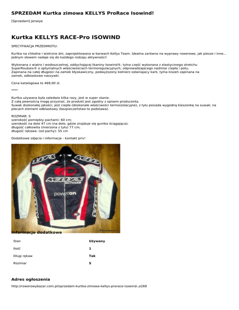 SPRZEDAM Kurtka zimowa KELLYS ProRace Isowind! [Sprzedam] Jerseye Kurtka KELLYS RACE-Pro ISOWIND SPECYFIKACJA PRZEDMIOTU: Kurtka na chłodne i wietrzne dni, zaprojektowana w barwach Kellys Team. Idealna zarówno na wyprawy rowerowe, jak piesze i inne... jednym słowem nadaje się do każdego rodzaju aktywności! Wykonana z wiatro i wodoszczelnej, oddychającej tkaniny Isowind®, tylna część wykonana z elastycznego stretchu SuperRoubaix® o optymalnych właściwościach termoregulacyjnych, odprowadzajacego nadmiar ciepła i potu. Zapinana na całej długości na zamek błyskawiczny, podwyższony kołnierz osłaniajacy kark, tylna kiszeń zapinana na zamek, odblaskowe naszywki. Cena katalogowa to 469,00 zł. **** Kurtka używana była zaledwie kilka razy, jest w super stanie. Z całą pewnością mogę przyznać, że produkt jest zgodny z opisem producenta. Suwak doskonałej jakości, jest ciepła (doskonałe właściwości termoizolacyjne), z tyłu posiada wygodną kieszonkę na suwak; na plecach element odblaskowy (bezpieczeństwo to podstawa). ROZMIAR: S szerokość pomiędzy pachami: 60 cm; szerokość na dole 47 cm (na dole, gdzie znajduje się gumka ściągająca); długość całkowita (mierzona z tyłu) 77 cm; długość rękawa: (od pachy): 55 cm Dodatkowe zdjęcia i informacje - kontakt priv! Informacje dodatkowe Stan Używany Ilość 1 Długi rękaw Tak Rozmiar S Adres ogłoszenia http://rowerowybazar.com.pl/sprzedam-kurtka-zimowa-kellys-prorace-isowind-,o269 Kontakt Mail: [email protected] Telefon: Lokalizacja , pruszków Mazowieckie (Polska) Ogłoszenie dodano: 2014-12-04 08:32:17 Ogłoszenie wygasa: 2015-07-07 19:56:57 Powered by TCPDF (www.tcpdf.org)