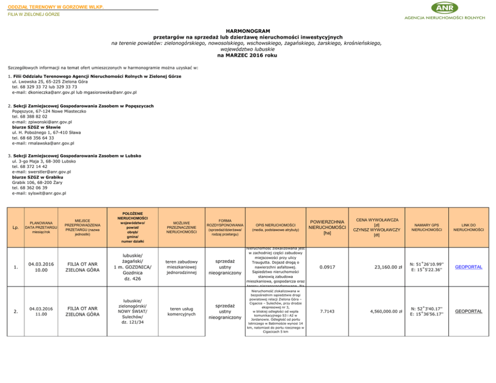 ODDZIAŁ TERENOWY W GORZOWIE WLKP. FILIA W ZIELONEJ GÓRZE HARMONOGRAM przetargów na sprzedaż lub dzierżawę nieruchomości inwestycyjnych na terenie powiatów: zielonogórskiego, nowosolskiego, wschowskiego, żagańskiego, żarskiego, krośnieńskiego, województwo lubuskie na MARZEC 2016 roku Szczegółowych informacji na temat ofert umieszczonych w harmonogramie można uzyskać w: 1. Filii Oddziału Terenowego Agencji Nieruchomości Rolnych w Zielonej Górze ul. Lwowska 25, 65-225 Zielona Góra tel. 68 329 33 72 lub 329 33 73 e-mail: [email protected] lub [email protected] 2. Sekcji Zamiejscowej Gospodarowania Zasobem w Popęszycach Popęszyce, 67-124 Nowe Miasteczko tel. 68 388 82 02 e-mail: [email protected] biurze SZGZ w Sławie ul. H. Pobożnego 1, 67-410 Sława tel. 68 68 356 64 33 e-mail: [email protected] 3. Sekcji Zamiejscowej Gospodarowania Zasobem w Lubsko ul. 3-go Maja 3, 68-300 Lubsko tel. 68 372 14 42 e-mail: [email protected] biurze SZGZ w Grabiku Grabik 106, 68-200 Żary tel. 68 362 06 39 e-mail: [email protected] Lp. 1. 2. PLANOWANA DATA PRZETARGU miesiąc/rok 04.03.2016 10.00 04.03.2016 11.00 MIEJSCE PRZEPROWADZENIA PRZETARGU (nazwa jednostki) FILIA OT ANR ZIELONA GÓRA FILIA OT ANR ZIELONA GÓRA POŁOŻENIE NIERUCHOMOŚCI województwo/ powiat/ obręb/ gmina/ numer działki lubuskie/ żagański/ 1 m. GOZDNICA/ Gozdnica dz. 426 lubuskie/ zielonogórski/ NOWY ŚWIAT/ Sulechów/ dz. 121/34 MOŻLIWE PRZEZNACZENIE NIERUCHOMOŚCI teren zabudowy mieszkaniowej jednorodzinnej teren usług komercyjnych FORMA ROZDYSPONOWANIA (sprzedaż/dzierżawa/ rodzaj przetargu) OPIS NIERUCHOMOŚCI (media, podstawowe atrybuty) POWIERZCHNIA NIERUCHOMOŚCI [ha] sprzedaż ustny nieograniczony Nieruchomość zlokalizowana jest w zachodniej części zabudowy miejscowości przy ulicy Traugutta. Dojazd drogą o nawierzchni asfaltowej. Sąsiedztwo nieruchomości stanowią zabudowa mieszkaniowa, gospodarcza oraz tereny niezagospodarowane. Na 0.0917 sprzedaż ustny nieograniczony Nieruchomość zlokalizowana w bezpośrednim sąsiedztwie drogi powiatowej relacji Zielona Góra – Cigacice – Sulechów, przy drodze ekspresowej nr 3, w bliskiej odległości od węzła komunikacyjnego S3 i A2 w Jordanowie. Odległość od portu lotniczego w Babimoście wynosi 14 km, natomiast do portu rzecznego w Cigacicach 5 km 7.7143 CENA WYWOŁAWCZA [zł] CZYNSZ WYWOŁAWCZY [dt] NAMIARY GPS NIERUCHOMOŚCI LINK DO NIERUCHOMOŚCI 23,160.00 zł N: 51˚26'10.99'' E: 15˚5'22.36'' GEOPORTAL 4,560,000.00 zł N: 52˚3'40.17'' E: 15˚36'56.17'' GEOPORTAL 3. 4. 5. 6. 04.03.2016 11.30 09.03.2016 10.00 18.03.2016 10.00 18.03.2016 10.30 FILIA OT ANR ZIELONA GÓRA lubuskie/ zielonogórski/ NOWY ŚWIAT/ Sulechów/ dz. 121/37 FILIA OT ANR ZIELONA GÓRA lubuskie/ nowosolski/ NOWE MIASTECZKO obręb 1/ Nowe Miasteczko/ dz. 330/21, 330/24 FILIA OT ANR ZIELONA GÓRA FILIA OT ANR ZIELONA GÓRA RAZEM lubuskie/ zielonogórski/ ŁĘŻYCA/ Zielona Góra/ dz. 308/2 lubuskie/ zielonogórski/ ŁĘŻYCA/ Zielona Góra/ dz. 308/18 teren usług komercyjnych niezabudowana nierolna zabudowa mieszkaniowa jednorodzinna zabudowa mieszkaniowa jednorodzinna sprzedaż ustny nieograniczony Nieruchomość zlokalizowana w bezpośrednim sąsiedztwie drogi powiatowej relacji Zielona Góra – Cigacice – Sulechów, przy drodze ekspresowej nr 3, w bliskiej odległości od węzła komunikacyjnego S3 i A2 w Jordanowie. Odległość od portu lotniczego w Babimoście wynosi 14 km, natomiast do portu rzecznego w Cigacicach 5 km 16.6675 sprzedaż ustny nieograniczony Nieruchomości usytuowane w bezpośrednim sąsiedztwie byłej suszarni pasz. Media w sąsiedztwie nieruchomości pozwalają na realizację zamierzeń budowlanych zgodnych z przeznaczeniem nieruchomości. 1.3600 sprzedaż ustny nieograniczony Nieruchomość zlokalizowana w otoczeniu nowopowstającej zabudowy mieszkaniowej jednorodzinnej. Działka znajduje się na terenie umożliwiającym podłączenie do sieci energetycznej, wodnej i kanalizacyjnej. Aktualnie nieruchomość nieużytkowana porośnięta samosiewami drzew iglastych. 0.1144 sprzedaż ustny nieograniczony Nieruchomość zlokalizowana w otoczeniu nowopowstającej zabudowy mieszkaniowej jednorodzinnej. Działka znajduje się na terenie umożliwiającym podłączenie do sieci energetycznej, wodnej i kanalizacyjnej. Aktualnie nieruchomość nieużytkowana porośnięta samosiewami drzew iglastych. 0.1011 26.0490 N: 52˚3'40.11'' E: 15˚36'38.49'' GEOPORTAL N: 51˚41'1.05'' E: 15˚43'30.47'' GEOPORTAL 153,780.00 zł N: 51˚58'13.75' E: 15˚29.5.64'' GEOPORTAL 136,100.00 zł N: 51˚58'13.75' E: 15˚29.5.64'' GEOPORTAL 9,845,000.00 zł 549,500.00 zł 15,267,540.00 zł Informacje zawarte w niniejszym harmonogramie nie stanowią oferty w rozumieniu przepisów ustawy z dnia 19 października 1991 r. o gospodarowaniu nieruchomościami rolnymi Skarbu Państwa (j.t. Dz. U. z 2015 r., poz. 1014 z późn. zm.) Informacje o przetargach stanowiące ofertę zawarte są w ogłoszeniach publikowanych w miejscach zwyczajowo przyjętych oraz na stronie internetowej www.anr.gov.pl Pisemne zgłoszenia dotyczące nieruchomości wystawianych do sprzedaży lub dzierżawy zgłaszać należy na adres jednostki terenowej: OT ANR w Gorzowie Wlkp., Filia w Zielonej Górze ul. Lwowska 25, 65-225 Zielona Góra a także drogą elektroniczną na adres e-mail: [email protected]