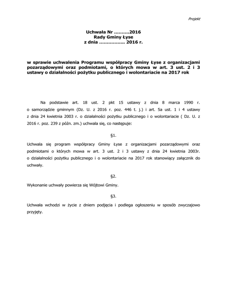 Projekt Uchwała Nr ……….2016 Rady Gminy Łyse z dnia …………….. 2016 r. w sprawie uchwalenia Programu współpracy Gminy Łyse z organizacjami pozarządowymi oraz podmiotami, o których mowa w art. 3 ust. 2 i 3 ustawy o działalności pożytku publicznego i wolontariacie na 2017 rok Na podstawie art. 18 ust. 2 pkt 15 ustawy z dnia 8 marca 1990 r. o samorządzie gminnym (Dz. U. z 2016 r. poz. 446 t. j.) i art. 5a ust. 1 i 4 ustawy z dnia 24 kwietnia 2003 r. o działalności pożytku publicznego i o wolontariacie ( Dz. U. z 2016 r. poz. 239 z późn. zm.) uchwala się, co następuje: §1. Uchwala się program współpracy Gminy Łyse z organizacjami pozarządowymi oraz podmiotami o których mowa w art. 3 ust. 2 i 3 ustawy z dnia 24 kwietnia 2003r. o działalności pożytku publicznego i o wolontariacie na 2017 rok stanowiący załącznik do uchwały. §2. Wykonanie uchwały powierza się Wójtowi Gminy. §3. Uchwała wchodzi w życie z dniem podjęcia i podlega ogłoszeniu w sposób zwyczajowo przyjęty. Projekt Załącznik do uchwały Nr …/2016 Rady Gminy Łyse z dnia ……… 2016 r. PROGRAM WSPÓŁPRACY GMINY ŁYSE Z ORGANIZACJAMI POZARZĄDOWYMI ORAZ PODMIOTAMI, O KTÓRYCH MOWA W ART. 3 UST. 2 i 3 USTAWY O DZIAŁALNOŚCI POŻYTKU PUBLICZNEGO I WOLONTARIACIE NA 2017 ROK. Wstęp W demokratycznym społeczeństwie organizacje pozarządowe stanowią znakomitą bazę dla rozwoju lokalnych społeczności, gdyż skupiają najaktywniejszych i najbardziej wrażliwych na sprawy społeczne obywateli danego środowiska. Niezbędne jest włączenie podmiotów pozarządowych w system funkcjonowania gminy na zasadzie równoprawnego partnerstwa. Konstytucyjna zasada pomocniczości oraz wynikające z innych ustaw kompetencje jednostek samorządu terytorialnego stanowią podstawę rozwoju wzajemnych relacji między administracją publiczną a organizacjami pozarządowymi. Wiele dziedzin życia nie mogło by już dziś sprawnie funkcjonować bez aktywności organizacji pozarządowych. Prowadzenie działalności pożytku publicznego przez organizacje pozarządowe i korzystanie z tej działalności przez organy administracji publicznej w celu wykonywania zadań publicznych oraz warunki wykonywania świadczeń przez wolontariuszy reguluje ustawa z dnia 24 kwietnia 2003r. o działalności pożytku publicznego i wolontariacie (Dz. U. z 2016 r. poz. 239 z późn. zm.) Rozdział I Postanowienia ogólne 1. Ilekroć w niniejszym programie współpracy jest mowa o: 1) ustawie – należy przez to rozumieć ustawę z dnia 24 kwietnia 2003 roku o działalności pożytku publicznego i o wolontariacie (Dz. U. z 2016 r. poz. 239 z późn. zm.) 2) rozporządzeniu – należy przez to rozumieć rozporządzenie Ministra Pracy i Polityki Społecznej z dnia 15 grudnia 2010 roku w sprawie wzoru oferty i ramowego wzoru umowy dotyczących realizacji zadania publicznego oraz wzoru sprawozdania z wykonania tego zadania (Dz. U. z 2011r. Nr 6, poz. 25). 3) organizacjach pozarządowych – należy przez to rozumieć organizacje pozarządowe, osoby prawne i jednostki organizacyjne, o których mowa w art. 3 ust. 2 i 3 ustawy, 4) programie współpracy – należy przez to rozumieć „Program współpracy Gminy Łyse z organizacjami pozarządowymi oraz podmiotami, o których mowa w art. 3 ust. 2 i 3 ustawy o działalności pożytku publicznego i wolontariacie na 2017 rok”. 2. Program współpracy stanowi element polityki gminy w zakresie społeczno-finansowym. 3. Program wskazuje cele, formy i zakres współpracy organów samorządowych z organizacjami pozarządowymi, jak również publiczne zadania priorytetowe, których realizacja związana będzie z udzieleniem pomocy publicznej w 2017 roku przez Gminę Łyse. Głównym celem programu jest skuteczne działanie na rzecz poprawy jakości życia mieszkańców poprzez rozwijanie współpracy samorządu gminnego z organizacjami pozarządowymi w szczególności dla podnoszenia efektywności działań podejmowanych w zakresie zlecenia realizacji zadań publicznych oraz wspólnego określania zasad, obszarów, kierunków i form wzajemnej współpracy. Cele szczegółowe to: 1) zapewnienie efektywnego wykonywania zadań publicznych Gminy, wynikających z przepisów, poprzez włączenie do ich realizacji organizacji pozarządowych i innych podmiotów, 2) otwarcie na innowacyjność i konkurencyjność, poprzez umożliwienie indywidualnego wystąpienia z ofertą w realizacji projektów konkretnych zadań publicznych, 3) poprawa jakości życia poprzez pełniejsze zaspokajanie potrzeb mieszkańców Gminy Łyse, 4) jak najbardziej racjonalne wykorzystanie publicznych środków finansowych, 5) wzmacnianie potencjału organizacji i innych podmiotów wymiennych oraz wspieranie rozwoju wolontariatu. Rozdział II Lista zadań publicznych przewidzianych do realizacji w roku 2017 Współpraca z organizacjami pozarządowymi dotyczy zadań określonych w art. 7 ust. 1 ustawy z dnia 8 marca 1990 r. o samorządzie gminnym, a w szczególności zadań własnych Gminy obejmujących następujące obszary: 1) kultura i ochrona dziedzictwa kulturowego a) wspieranie organizacji imprez kulturalnych dla mieszkańców Gminy Łyse, b) wspieranie działań mających na celu promocję tradycji i kultury regionalnej, 2) pomoc społeczna a) wspieranie działań mających na celu wyrównanie szans osób niepełnosprawnych i osób zagrożonych wykluczeniem społecznym, zwłaszcza dzieci, b) promocja zatrudnienia i aktywizacja bezrobotnych 3) kultura fizyczna a) wspieranie zajęć szkoleniowych w zakresie różnych dyscyplin sportu, mających na celu przygotowanie zawodników klubów i stowarzyszeń do rywalizacji sportowej, w tym do udziału w organizowanych przez związki sportowe rozgrywkach ligowych, turniejach i zawodach, b) wspieranie imprez sportowych, rekreacyjnych i turystycznych dla dzieci i młodzieży oraz mieszkańców Gminy, zarówno na terenie Gminy, jak i poza jej granicami, c) wspieranie o
