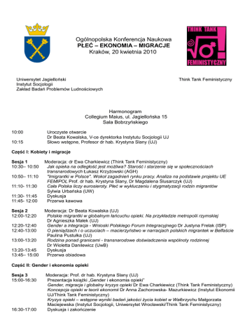 Ogólnopolska Konferencja Naukowa PŁEĆ – EKONOMIA – MIGRACJE Kraków, 20 kwietnia 2010 Uniwersytet Jagielloński bbbbbbbb bbbbbbbbbbbbbbbbbbbbbbbbbbb bbbbbbbThink Tank Feministyczny Instytut Socjologii Zakład Badań Problemów Ludnościowych Harmonogram Collegium Maius, ul. Jagiellońska 15 Sala Bobrzyńskiego 10:00 10:15 Uroczyste otwarcie Dr Beata Kowalska, V-ce dyrektorka Instytutu Socjologii UJ Słowo wstępne, Profesor dr hab. Krystyna Slany (UJ) Część I: Kobiety i migracje Sesja 1 10:30– 10:50 10:50– 11:10 11:10- 11:30 11:30- 11:45 11:45- 12:00 Sesja 2 12:00-12:20 12:20-12:40 12:40-13:00 13:00-13:20 13:20-13:45 13:45– 15:00 Moderacja: dr Ewa Charkiewicz (Think Tank Feministyczny) Jak opieka na odległość jest możliwa? Starość i starzenie się w społecznościach transnarodowych Łukasz Krzyżowski (AGH) "Imigrantki w Polsce". Wokoł zagadnień rynku pracy. Analiza na podstawie projektu UE FEMIPOL Prof. dr hab. Krystyna Slany, Dr Magdalena Ślusarczyk (UJ) Cała Polska liczy eurosieroty. Płeć w wykluczeniu i stygmatyzacji rodzin migrantów Sylwia Urbańska (UW) Dyskusja Przerwa kawowa Moderacja: Dr Beata Kowalska (UJ) Polskie migrantki w globalnym łańcuchu opieki. Na przykładzie metropolii rzymskiej Dr Agnieszka Małek (UJ) Gender a integracja - Wnioski Polskiego Forum Integracyjnego Dr Justyna Frelak (ISP) O pieniądzach i o uczuciach – macierzyństwo w narracjach polskich migrantek w Belfaście Paulina Pustułka (UJ) Rodzina ponad granicami - transnarodowe doświadczenia wspólnoty rodzinnej Dr Wioletta Danilewicz (UwB) Dyskusja Przerwa obiadowa Część II: Gender i ekonomia opieki Sesja 3 15:00-16:30 16:30-17:00 Moderacja: Prof. dr hab. Krystyna Slany (UJ) Prezentacja książki „Gender i ekonomia opieki” Gender, migracja i globalny kryzys opieki Dr Ewa Charkiewicz (Think Tank Feministyczny) Koncepcja opieki w teorii ekonomii Dr Anna Zachorowska- Mazurkiewicz (Instytut Ekonomii UJ/Think Tank Feministyczny) Kryzys opieki – wstępne wyniki badań jakości życia kobiet w Wałbrzychu Małgorzata Maciejewska (Instytut Socjologii, Uniwersytet Wrocławski/Think Tank Feministyczny) Dyskusja i zakończenie
