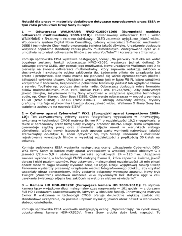 Notatki dla prasy — materiały dodatkowe dotyczące nagrodzonych przez EISA w tym roku produktów firmy Sony Europe: 1 — Odtwarzacz WALKMAN® NWZ-X1050/1060 (Europejski osobisty odtwarzacz multimedialny 2009-2010): Zaawansowany odtwarzacz MP3 i wideo WALKMAN® z 3-calowym ekranem dotykowym OLED zapewnia wyjątkową jakość wideo. Wbudowany system Digital Noise Cancelling, cyfrowy wzmacniacz S-Master, mechanizm DSEE i technologie Clear Audio gwarantują świetna jakość dźwięku. Urządzenie obsługuje wszystkie popularne standardy zapisu plików multimedialnych. Zintegrowane łącze Wi-Fi umoŜliwia natomiast odtwarzanie filmów z serwisu YouTube™ i korzystanie z Internetu. Komisja sędziowska EISA wystawiła następującą ocenę: „Na pierwszy rzut oka nie widać bogatego zestawu funkcji odtwarzacza NWZ-X1050, wystarczy jednak dotknąć 3calowego ekranu OLED, aby poznać jego moŜliwości. Nowe urządzenie Walkman serii X to pierwszy na świecie odtwarzacz multimedialny, który zapewnia redukcję zakłóceń w słuchawkach i skutecznie odcina zakłócenia tła. Ładowanie plików do urządzenia jest proste i przejrzyste. Bez trudu moŜna teŜ poruszać się wśród zgromadzonych plików i odtwarzać wybrane utwory. Urządzenie wyposaŜone jest w łącze Wi-Fi, które umoŜliwia korzystanie z Internetu, bezpośrednie pobieranie transmisji podcast lub oglądanie filmów z serwisu YouTube np. podczas słuchania radia. Odtwarzacz obsługuje wiele formatów plików multimedialnych, m.in. MP3, liniowe PCM i AVC (H.264/AVC). Aby podwyŜszyć jakość dźwięku, inŜynierowie firmy Sony wbudowali w urządzenie specjalne technologie audio, np. Clear Stereo, Clear Bass i DSEE. Obie wersje odtwarzacza — model z pamięcią 16 GB (NWZ-X1050) i 32 GB (NWZ-X1060) — oferują doskonały dźwięk, stylowy graficzny interfejs uŜytkownika i bardzo dobrą jakość wideo. Walkman X firmy Sony bez wątpienia zasługuje na nagrodę EISA!” 2 — Cyfrowy aparat Cyber-shot™ WX1 (Europejski aparat kompaktowy 200910): Ten zaawansowany cyfrowy aparat fotograficzny wyposaŜono w innowacyjną, wykonaną w technologii CMOS matrycę Exmor R™ o rozdzielczości 10,2 megapiksela, a takŜe w opracowany przez firmę Sony wydajny procesor BIONZ. Dzięki temu urządzenie gwarantuje szybką pracę oraz znakomite zdjęcia nawet w warunkach słabego oświetlenia. Wśród innych istotnych cech aparatu warto wymienić najwyŜszej jakości szerokokątny obiektyw G, zoom optyczny 5x, tryb Sweep Panorama i moŜliwość rejestrowania wyraźnych filmów w wysokiej rozdzielczości z prędkością 30 klatek na sekundę. Komisja sędziowska EISA wystawiła następującą ocenę: „Urządzenie Cyber-shot DSCWX1 firmy Sony to bardzo mały aparat wyposaŜony w wysokiej jakości obiektyw G o jasności f/2,4 — 5,9 i uŜytecznym zakresie ogniskowych 24 — 120 mm. Urządzenie zawiera wykonaną w technologii CMOS matrycę Exmor R, która zapewnia świetną jakość obrazu i niski poziom szumów. Przy ustawieniu maksymalnej rozdzielczości 10 mln pikseli aparat moŜe w ciągu sekundy wykonać serię 10 zdjęć. Dzięki wyjątkowej funkcji Sweep Panorama wystarczy przesunąć urządzenie wzdłuŜ fotografowanego obiektu, aby uzyskać wspaniały obraz panoramiczny, który zostanie połączony wewnątrz aparatu. Nowy tryb Twilight (Zmierzch) umoŜliwia nałoŜenie kilku wykonanych bez statywu ujęć w celu uzyskania świetnego zdjęcia bez zakłóceń nawet przy słabym oświetleniu”. 3 — Kamera HD HDR-XR520E (Europejska kamera HD 2009-2010): Ta stylowa kamera łączy wyjątkowo długi maksymalny czas nagrywania — 101 godzin — z obrazem Full HD i zestawem zaawamsowanych, łatwych w obsłudze funkcji. Innowacyjna matryca Exmor R wykonana w technologii CMOS oferuje dwukrotnie większą czułość niŜ standardowe urządzenia, co pozwala uzyskać wysokiej jakości obraz nawet w warunkach słabego oświetlenia. Komisja sędziowska EISA wystawiła następującą ocenę: „Wprowadzając na rynek nową, udoskonaloną kamerę HDR-XR520V, firma Sony zrobiła duŜy krok naprzód. To urządzenie Full HD jest wyposaŜone w bardzo czułą, wykonaną w technologii CMOS matrycę Exmor R o rozdzielczości 6 megapikseli oraz nowy, wysokiej jakości obiektyw G, który oferuje 12-krotny zoom optyczny i doskonale uzupełnia wysoką rozdzielczość matrycy Exmor nawet w ciemności. Dysk twardy o pojemności 240 GB oraz zaawansowany algorytm AVCHD umoŜliwiają zarejestrowanie 101 godzin wysokiej jakości wideo w rozdzielczości Full HD. Urządzenie wyposaŜono teŜ m.in. w funkcje rozpoznawania uśmiechu (Smile Shutter), automatycznego rozpoznawania twarzy z korektą odcienia skóry i bardzo skuteczny stabilizator obrazu. Dzięki wbudowanej technologii GPS kamera pozwala uŜytkownikom zapisywać lokalizacje rejestrowanych filmów w kaŜdym miejscu na świecie objętym systemem nawigacji satelitarnej”. 4 — Obiektyw G 70-400 mm F4-5,6 G SSM (Europejski obiektyw z zoomem optycznym 2009-2010): Ten wysokiej jakości teleobiektyw z zoomem optycznym został w najdrobniejszych szczegółach zaprojektowany pod kątem maksymalnej wydajności i komfortu obsługi. Elementy szklane wykonano ze szkła o bardzo niskiej dyspersji (ED), co zapewnia jasny, ostry obraz i mniejszą aberrację chromatyczną. Ultradźwiękowy napęd SSM (Super Sonic Wave Motor) o duŜym momencie obrotowym gwarantuje płynną, cichą pracę mechanizmu automatycznego ustawiania ostrości. Komisja sędziowska EISA wystawiła następującą ocenę: „Do zalet tego nowego obiektywu firmy Sony naleŜy solidna konstrukcja i elementy szklane wykonane ze szła o bardzo niskiej dyspersji (ED). UmoŜliwia to uzyskanie wysokiej jakości obrazu, do jakiej przyzwyczaili się uŜytkownicy profesjonalnych obiektywów G. WyposaŜono go w działający niemal bezszelestnie napęd SSM, dzięki któremu uŜytkownicy mogą błyskawicznie przełączać się między automatycznym i ręcznym sys