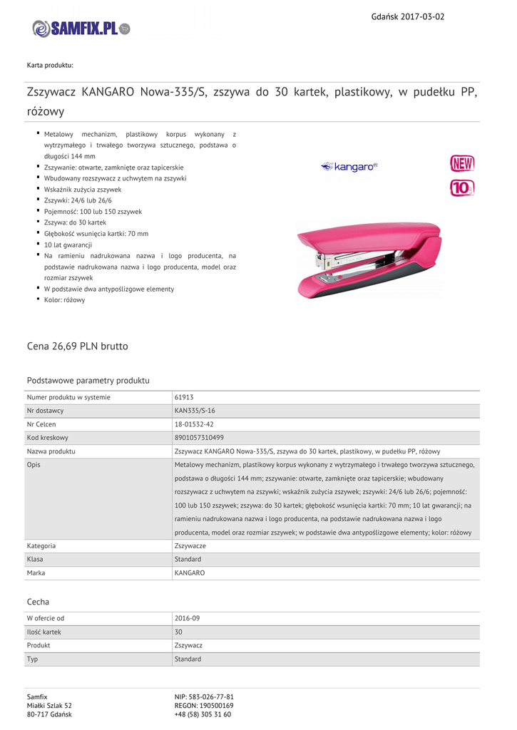 Gdańsk 2017-03-02 Karta produktu: Zszywacz KANGARO Nowa-335/S, zszywa do 30 kartek, plastikowy, w pudełku PP, różowy Metalowy mechanizm, plastikowy korpus wykonany z wytrzymałego i trwałego tworzywa sztucznego, podstawa o długości 144 mm Zszywanie: otwarte, zamknięte oraz tapicerskie Wbudowany rozszywacz z uchwytem na zszywki Wskaźnik zużycia zszywek Zszywki: 24/6 lub 26/6 Pojemność: 100 lub 150 zszywek Zszywa: do 30 kartek Głębokość wsunięcia kartki: 70 mm 10 lat gwarancji Na ramieniu nadrukowana nazwa i logo producenta, na podstawie nadrukowana nazwa i logo producenta, model oraz rozmiar zszywek W podstawie dwa antypoślizgowe elementy Kolor: różowy Cena 26,69 PLN brutto Podstawowe parametry produktu Numer produktu w systemie 61913 Nr dostawcy KAN335/S-16 Nr Celcen 18-01532-42 Kod kreskowy 8901057310499 Nazwa produktu Zszywacz KANGARO Nowa-335/S, zszywa do 30 kartek, plastikowy, w pudełku PP, różowy Opis Metalowy mechanizm, plastikowy korpus wykonany z wytrzymałego i trwałego tworzywa sztucznego, podstawa o długości 144 mm; zszywanie: otwarte, zamknięte oraz tapicerskie; wbudowany rozszywacz z uchwytem na zszywki; wskaźnik zużycia zszywek; zszywki: 24/6 lub 26/6; pojemność: 100 lub 150 zszywek; zszywa: do 30 kartek; głębokość wsunięcia kartki: 70 mm; 10 lat gwarancji; na ramieniu nadrukowana nazwa i logo producenta, na podstawie nadrukowana nazwa i logo producenta, model oraz rozmiar zszywek; w podstawie dwa antypoślizgowe elementy; kolor: różowy Kategoria Zszywacze Klasa Standard Marka KANGARO Cecha W ofercie od 2016-09 Ilość kartek 30 Produkt Zszywacz Typ Standard Samfix Miałki Szlak 52 80-717 Gdańsk NIP: 583-026-77-81 REGON: 190500169 +48 (58) 305 31 60 Gdańsk 2017-03-02 Karta katalogowa produktu cd. Zszywacz KANGARO Nowa-335/S, zszywa do 30 kartek, plastikowy, w pudełku PP, różowy Materiał Metal Wspólny słownik zamówień CPV 30197320-5 Zszywacze Certyfikaty Ilość lat gwarancji 10 Hit Standard Nowy produkt w ofercie Nowość Wymiary Gł. wsunięcia (mm) 70 Kolor Kolor Różowy Pozostałe zdjęcia produktu Serdecznie zapraszamy do współpracy Zespół Samfix. Samfix Miałki Szlak 52 80-717 Gdańsk NIP: 583-026-77-81 REGON: 190500169 +48 (58) 305 31 60