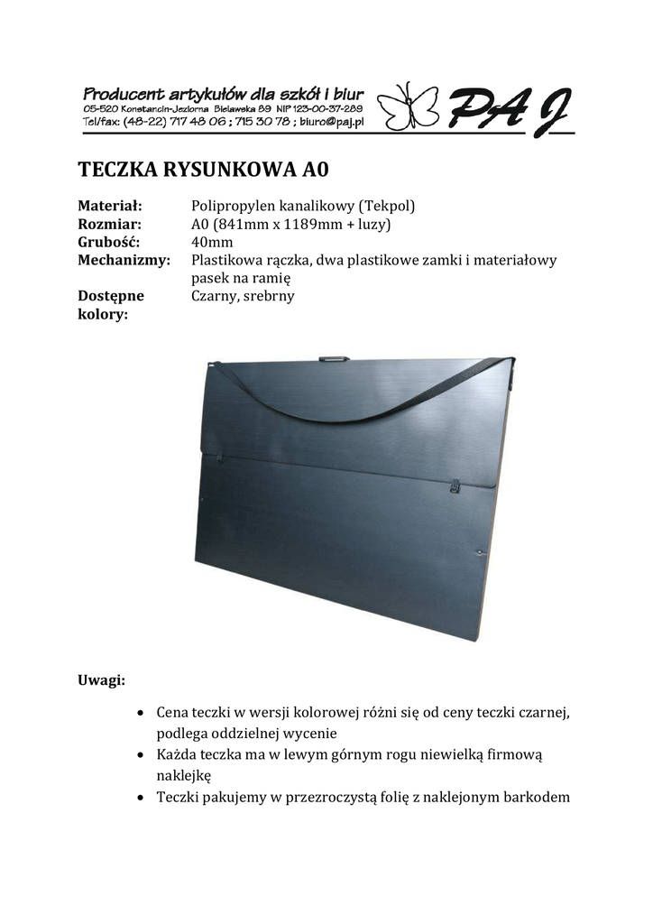 TECZKA RYSUNKOWA A0 Materiał: Rozmiar: Grubość: Mechanizmy: Dostępne kolory: Polipropylen kanalikowy (Tekpol) A0 (841mm x 1189mm + luzy) 40mm Plastikowa rączka, dwa plastikowe zamki i materiałowy pasek na ramię Czarny, srebrny Uwagi: Cena teczki w wersji kolorowej różni się od ceny teczki czarnej, podlega oddzielnej wycenie Każda teczka ma w lewym górnym rogu niewielką firmową naklejkę Teczki pakujemy w przezroczystą folię z naklejonym barkodem 40 116 385 50 866 120,26 1220
