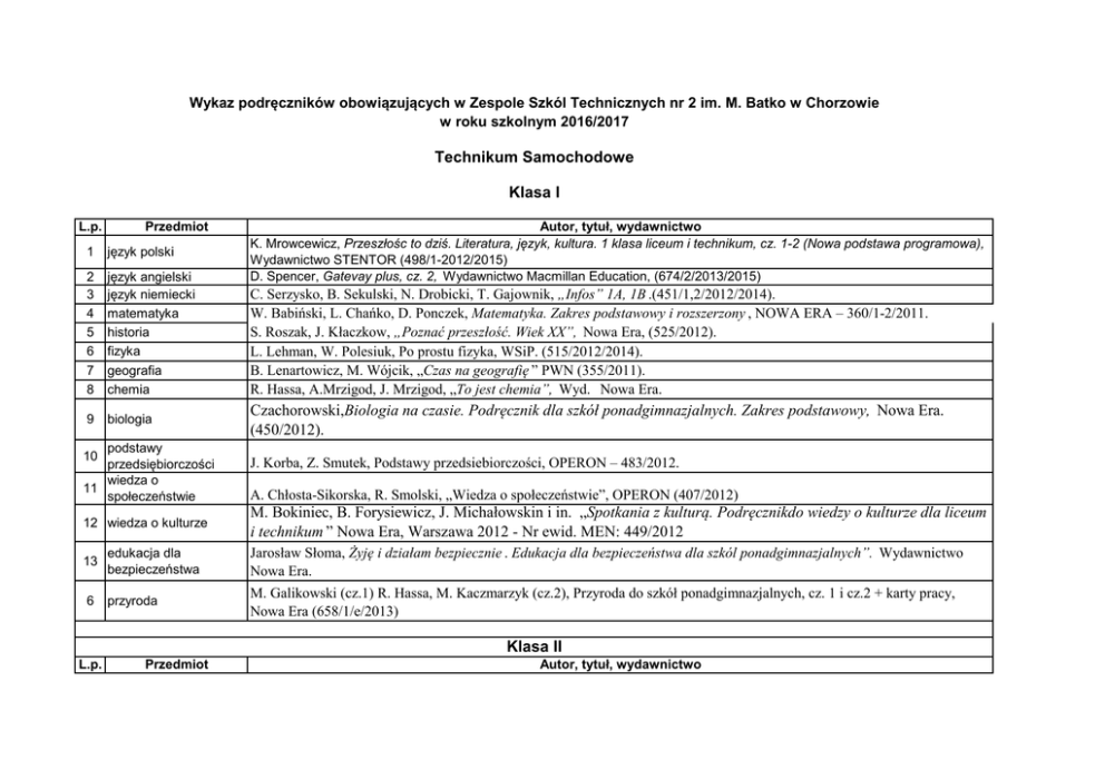 Wykaz podręczników obowiązujących w Zespole Szkól Technicznych nr 2 im. M. Batko w Chorzowie w roku szkolnym 2016/2017 Technikum Samochodowe Klasa I L.p. Przedmiot 1 język polski 2 3 4 5 6 7 8 język angielski język niemiecki matematyka historia fizyka geografia chemia 9 biologia podstawy przedsiębiorczości wiedza o 11 społeczeństwie 10 12 wiedza o kulturze 13 edukacja dla bezpieczeństwa 6 przyroda Autor, tytuł, wydawnictwo K. Mrowcewicz, Przeszłośc to dziś. Literatura, język, kultura. 1 klasa liceum i technikum, cz. 1-2 (Nowa podstawa programowa), Wydawnictwo STENTOR (498/1-2012/2015) D. Spencer, Gatevay plus, cz. 2, Wydawnictwo Macmillan Education, (674/2/2013/2015) C. Serzysko, B. Sekulski, N. Drobicki, T. Gajownik, „Infos” 1A, 1B .(451/1,2/2012/2014). W. Babiński, L. Chańko, D. Ponczek, Matematyka. Zakres podstawowy i rozszerzony , NOWA ERA – 360/1-2/2011. S. Roszak, J. Kłaczkow, „Poznać przeszłość. Wiek XX”, Nowa Era, (525/2012). L. Lehman, W. Polesiuk, Po prostu fizyka, WSiP. (515/2012/2014). B. Lenartowicz, M. Wójcik, „Czas na geografię ” PWN (355/2011). R. Hassa, A.Mrzigod, J. Mrzigod, „To jest chemia”, Wyd. Nowa Era. Czachorowski,Biologia na czasie. Podręcznik dla szkół ponadgimnazjalnych. Zakres podstawowy, Nowa Era. (450/2012). J. Korba, Z. Smutek, Podstawy przedsiebiorczości, OPERON – 483/2012. A. Chłosta-Sikorska, R. Smolski, „Wiedza o społeczeństwie”, OPERON (407/2012) M. Bokiniec, B. Forysiewicz, J. Michałowskin i in. „Spotkania z kulturą. Podręcznikdo wiedzy o kulturze dla liceum i technikum ” Nowa Era, Warszawa 2012 - Nr ewid. MEN: 449/2012 Jarosław Słoma, Żyję i działam bezpiecznie . Edukacja dla bezpieczeństwa dla szkól ponadgimnazjalnych”. Wydawnictwo Nowa Era. M. Galikowski (cz.1) R. Hassa, M. Kaczmarzyk (cz.2), Przyroda do szkół ponadgimnazjalnych, cz. 1 i cz.2 + karty pracy, Nowa Era (658/1/e/2013) Klasa II L.p. Przedmiot Autor, tytuł, wydawnictwo 1 2 3 4 5 język polski język angielski język niemiecki matematyka historia 6 przyroda K. Mrowcewicz, Przeszłośc to dziś. Literatura, język, kultura. 1 klasa liceum i technikum, cz. 2 oraz 2 klasa cz. 1-2 (Nowa D. Spencer, Gatevay plus, cz. 2, Wydawnictwo Macmillan Education, (674/2/2013/2015) C. Serzysko, B. Sekulski, N. Drobicki, T. Gajownik, „Infos” 1A, 1B .(451/1,2/2012/2014). W. Babiński, L. Chańko, D. Ponczek, Matematyka. Zakres podstawowy i rozszerzony , NOWA ERA – 360/1-2/2011. S. Roszak, J. Kłaczkow, „Poznać przeszłość. Wiek XX”, Nowa Era, (525/2012). M. Galikowski (cz.1) R. Hassa, M. Kaczmarzyk (cz.2), Przyroda do szkół ponadgimnazjalnych, cz. 1i cz.2 = karty pracy, Nowa Era (658/1/e/2013) Klasa III L.p. 1 2 3 4 5 6 Przedmiot język polski język angielski język niemiecki matematyka historia Autor, tytuł, wydawnictwo K. Mrowcewicz, Przeszłośc to dziś. Literatura, język, kultura. 2 klasa liceum i technikum, cz.2 oraz klasa 3 (Nowa podstawa D. Spencer, Gatevay plus, cz. 2, Wydawnictwo Macmillan Education, (674/2/2013/2015) przyroda M. Galikowski (cz.1) R. Hassa, M. Kaczmarzyk (cz.2), Przyroda do szkół ponadgimnazjalnych, cz. 1i cz.2 = karty pracy, Nowa Era (658/1/e/2013) C. Serzysko, B. Sekulski, N. Drobicki, T. Gajownik, „Infos” 1A, 1B .(451/1,2/2012/2014). W. Babiński, L. Chańko, D. Ponczek, Matematyka. Zakres podstawowy i rozszerzony , NOWA ERA – 360/1-2/2011. S. Roszak, J. Kłaczkow, „Poznać przeszłość. Wiek XX”, Nowa Era, (525/2012). Klasa IV L.p. 1 2 3 4 5 6 7 Przedmiot język polski język angielski język niemiecki język obcy zawodowy matematyka historia przyroda Autor, tytuł, wydawnictwo K. Mrowcewicz, Przeszłośc to dziś. Literatura, język, kultura. 3 klasa liceum i technikum, (Nowa podstawa programowa), D. Spencer, Gatevay plus, cz. 2, Wydawnictwo Macmillan Education, (674/2/2013/2015) C. Serzysko, B. Sekulski, N. Drobicki, T. Gajownik, „Infos” 1A, 1B .(451/1,2/2012/2014). J. Mastrolova, Intercar. Zawodowy język angielski dla branży samochodowej, Wyd. Print Group Sp. Z o.o. W. Babiński, L. Chańko, D. Ponczek, Matematyka. Zakres podstawowy i rozszerzony , NOWA ERA – 360/1-2/2011. S. Roszak, J. Kłaczkow, „Poznać przeszłość. Wiek XX”, Nowa Era, (525/2012). M. Galikowski (cz.1) R. Hassa, M. Kaczmarzyk (cz.2), Przyroda do szkół ponadgimnazjalnych, cz. 1i cz.2 = karty pracy, Nowa Zasadnicza Szkoła Zawodowa Klasa I L.p. 1 2 3 4 5 6 7 8 Przedmiot język polski język angielski język niemiecki matematyka historia fizyka geografia chemia Autor, tytuł, wydawnictwo J. Kusiak, B. Chuderska, „Język polski. Odkrywamy na nowo. Podręcznik dla ZSZ , cz. 1 i 2, Wyd. OPERON . M. Hobbs, J. Starr Kedle, “Real Life. Elementary” , Wyd. Macmillan. C. Serzysko, B. Sekulski, N. Drobicki, T. Gajownik, „Infos” 1A, 1B .(451/1,2/2012/2014). A. Konstantynowicz, B. Kiljańska, M. Pająk, G, Ukleja, „Matematyka. Podręcznik dla ZSZ” , Wyd. OPERON. B. Burda, B. Halczak,, R. Józefiak, , A. Roszak, M. Szymczak, „Historia. Odkrywamy na nowo”, Wyd. OPERON. L. Lehman, W. Polesiuk, Po prostu fizyka, WSiP. (515/2012/2014). B. Lenartowicz, M. Wójcik, „Czas na geografię ” PWN (355/2011). R. Hassa, A.Mrzigod, J. Mrzigod, „To jest chemia”, Wyd. Nowa Era. 9 biologia Czachorowski,Biologia na czasie. Podręcznik dla szkół ponadgimnazjalnych. Zakres podstawowy, Nowa Era. (450/2012). 10 wiedza o społeczeństwie A. Chłosta-Sikorska, R. Smolski, Wiedza o społeczeństwie , OPERON (407/2012). Klasa II L.p. 1 2 3 4 5 Przedmiot język polski język angielski język niemiecki matematyka historia Autor, tytuł, wydawnictwo J. Kusiak, B. Chuderska, „Język polski. Odkrywamy na nowo. Podręcznik dla ZSZ , cz. 2, Wyd. OPERON . M. Hobbs, J. Starr Kedle, “Real Life. Elementary” , Wyd. Macmillan. C. Serzysko, B. Sekulski, N. Drobicki, T. Gajownik, „Infos” 1A, 1B .(451/1,2/2012/2014). A. Konstantynowicz, B. Kiljańska, M. Pająk, G, Ukleja, „Matematyka. Podręcznik dla 