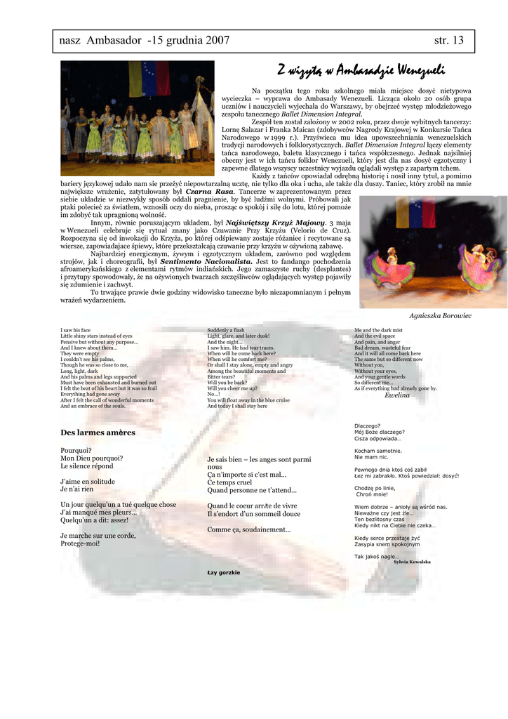 nasz Ambasador -15 grudnia 2007 str. 13 Z wizytą w Ambasadzie Wenezueli Na początku tego roku szkolnego miała miejsce dosyć nietypowa wycieczka – wyprawa do Ambasady Wenezueli. Licząca około 20 osób grupa uczniów i nauczycieli wyjechała do Warszawy, by obejrzeć występ młodzieżowego zespołu tanecznego Ballet Dimension Integral. Zespół ten został założony w 2002 roku, przez dwoje wybitnych tancerzy: Lornę Salazar i Franka Maican (zdobywców Nagrody Krajowej w Konkursie Tańca Narodowego w 1999 r.). Przyświeca mu idea upowszechniania wenezuelskich tradycji narodowych i folklorystycznych. Ballet Dimension Integral łączy elementy tańca narodowego, baletu klasycznego i tańca współczesnego. Jednak najsilniej obecny jest w ich tańcu folklor Wenezueli, który jest dla nas dosyć egzotyczny i zapewne dlatego wszyscy uczestnicy wyjazdu oglądali występ z zapartym tchem. Każdy z tańców opowiadał odrębną historię i nosił inny tytuł, a pomimo bariery językowej udało nam sie przeżyć niepowtarzalną ucztę, nie tylko dla oka i ucha, ale także dla duszy. Taniec, który zrobił na mnie największe wrażenie, zatytułowany był Czarna Rasa. Tancerze w zaprezentowanym przez siebie układzie w niezwykły sposób oddali pragnienie, by być ludźmi wolnymi. Próbowali jak ptaki polecieć za światłem, wznosili oczy do nieba, prosząc o spokój i siłę do lotu, której pomoże im zdobyć tak upragnioną wolność. Innym, równie poruszającym układem, był Najświętszy Krzyż Majowy. 3 maja w Wenezueli celebruje się rytuał znany jako Czuwanie Przy Krzyżu (Velorio de Cruz). Rozpoczyna się od inwokacji do Krzyża, po której odśpiewany zostaje różaniec i recytowane są wiersze, zapowiadajace śpiewy, które przekształcają czuwanie przy krzyżu w ożywioną zabawę. Najbardziej energicznym, żywym i egzotycznym układem, zarówno pod względem strojów, jak i choreografii, był Sentimento Nacionalista. Jest to fandango pochodzenia afroamerykańskiego z elementami rytmów indiańskich. Jego zamaszyste ruchy (desplantes) i przytupy spowodowały, że na ożywionych twarzach szczęśliwców oglądających występ pojawiły się zdumienie i zachwyt. To trwające prawie dwie godziny widowisko taneczne było niezapomnianym i pełnym wrażeń wydarzeniem. Agnieszka Borowiec I saw his face Little shiny stars instead of eyes Pensive but without any purpose… And I knew about them… They were empty I couldn’t see his palms, Though he was so close to me, Long, light, dark And his palms and legs supported Must have been exhausted and burned out I felt the beat of his heart but it was so frail Everything had gone away After I felt the call of wonderful moments And an embrace of the souls. Suddenly a flash Light, glare, and later dusk! And the night… I saw him. He had tear traces. When will he come back here? When will he comfort me? Or shall I stay alone, empty and angry Among the beautiful moments and Bitter tears? Will you be back? Will you cheer me up? No…! You will float away in the blue cruise And today I shall stay here J’aime en solitude Je n’ai rien Un jour quelqu’un a tué quelque chose J’ai manqué mes pleurs... Quelqu’un a dit: assez! Je marche sur une corde, Protege-moi! Ewelina Dlaczego? Mój Boże dlaczego? Cisza odpowiada… Des larmes amères Pourquoi? Mon Dieu pourquoi? Le silence répond Me and the dark mist And the evil space And pain, and anger Bad dream, wasteful fear And it will all come back here The same but so different now Without you, Without your eyes, And your gentle words So different me… As if everything had already gone by. Je sais bien – les anges sont parmi nous Ça n’importe si c’est mal... Ce temps cruel Quand personne ne t’attend... Quand le coeur arrête de vivre Il s’endort d’un sommeil douce Comme ça, soudainement... Kocham samotnie. Nie mam nic. Pewnego dnia ktoś coś zabił Łez mi zabrakło. Ktoś powiedział: dosyć! Chodzę po linie, Chroń mnie! Wiem dobrze – anioły są wśród nas. Nieważne czy jest źle… Ten bezlitosny czas Kiedy nikt na Ciebie nie czeka… Kiedy serce przestaje żyć Zasypia snem spokojnym Łzy gorzkie Tak jakoś nagle… Sylwia Kowalska