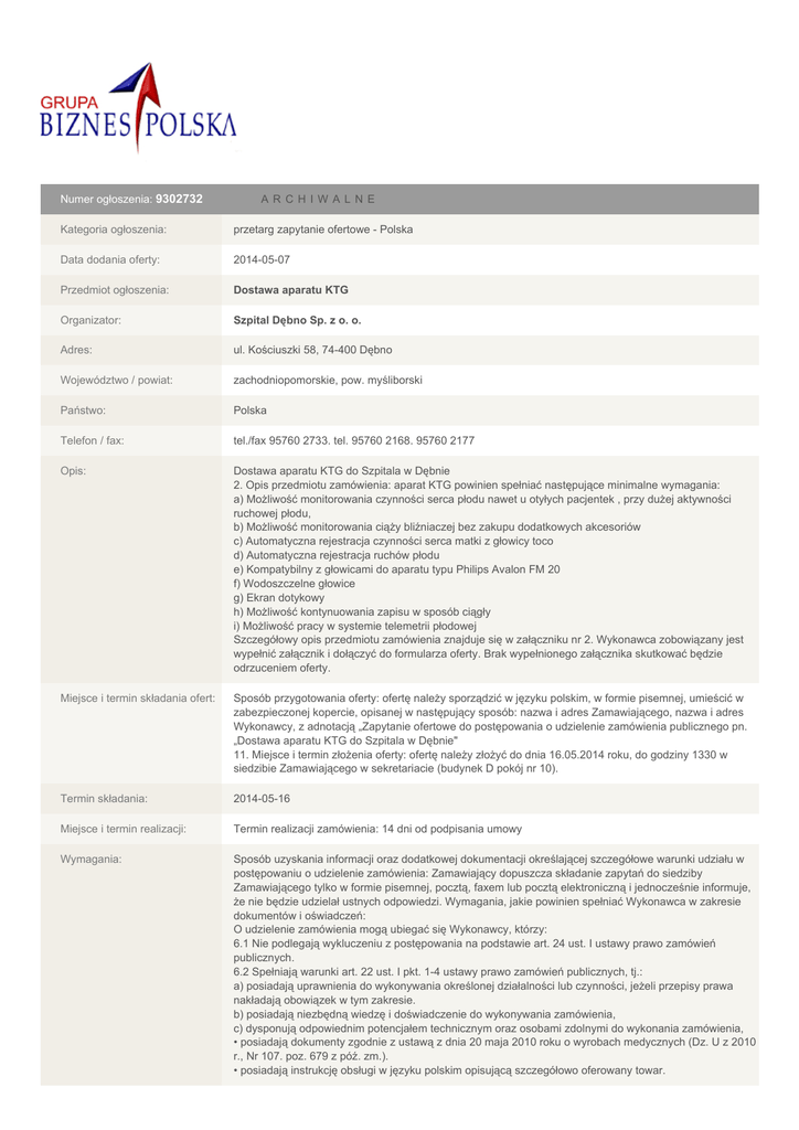 Numer ogłoszenia: 9302732 A RCHI WA L N E Kategoria ogłoszenia: przetarg zapytanie ofertowe - Polska Data dodania oferty: 2014-05-07 Przedmiot ogłoszenia: Dostawa aparatu KTG Organizator: Szpital Dębno Sp. z o. o. Adres: ul. Kościuszki 58, 74-400 Dębno Województwo / powiat: zachodniopomorskie, pow. myśliborski Państwo: Polska Telefon / fax: tel./fax 95760 2733. tel. 95760 2168. 95760 2177 Opis: Dostawa aparatu KTG do Szpitala w Dębnie 2. Opis przedmiotu zamówienia: aparat KTG powinien spełniać następujące minimalne wymagania: a) Możliwość monitorowania czynności serca płodu nawet u otyłych pacjentek , przy dużej aktywności ruchowej płodu, b) Możliwość monitorowania ciąży bliźniaczej bez zakupu dodatkowych akcesoriów c) Automatyczna rejestracja czynności serca matki z głowicy toco d) Automatyczna rejestracja ruchów płodu e) Kompatybilny z głowicami do aparatu typu Philips Avalon FM 20 f) Wodoszczelne głowice g) Ekran dotykowy h) Możliwość kontynuowania zapisu w sposób ciągły i) Możliwość pracy w systemie telemetrii płodowej Szczegółowy opis przedmiotu zamówienia znajduje się w załączniku nr 2. Wykonawca zobowiązany jest wypełnić załącznik i dołączyć do formularza oferty. Brak wypełnionego załącznika skutkować będzie odrzuceniem oferty. Miejsce i termin składania ofert: Sposób przygotowania oferty: ofertę należy sporządzić w języku polskim, w formie pisemnej, umieścić w zabezpieczonej kopercie, opisanej w następujący sposób: nazwa i adres Zamawiającego, nazwa i adres Wykonawcy, z adnotacją „Zapytanie ofertowe do postępowania o udzielenie zamówienia publicznego pn. „Dostawa aparatu KTG do Szpitala w Dębnie" 11. Miejsce i termin złożenia oferty: ofertę należy złożyć do dnia 16.05.2014 roku, do godziny 1330 w siedzibie Zamawiającego w sekretariacie (budynek D pokój nr 10). Termin składania: 2014-05-16 Miejsce i termin realizacji: Termin realizacji zamówienia: 14 dni od podpisania umowy Wymagania: Sposób uzyskania informacji oraz dodatkowej dokumentacji określającej szczegółowe warunki udziału w postępowaniu o udzielenie zamówienia: Zamawiający dopuszcza składanie zapytań do siedziby Zamawiającego tylko w formie pisemnej, pocztą, faxem lub pocztą elektroniczną i jednocześnie informuje, że nie będzie udzielał ustnych odpowiedzi. Wymagania, jakie powinien spełniać Wykonawca w zakresie dokumentów i oświadczeń: O udzielenie zamówienia mogą ubiegać się Wykonawcy, którzy: 6.1 Nie podlegają wykluczeniu z postępowania na podstawie art. 24 ust. I ustawy prawo zamówień publicznych. 6.2 Spełniają warunki art. 22 ust. I pkt. 1-4 ustawy prawo zamówień publicznych, tj.: a) posiadają uprawnienia do wykonywania określonej działalności lub czynności, jeżeli przepisy prawa nakładają obowiązek w tym zakresie. b) posiadają niezbędną wiedzę i doświadczenie do wykonywania zamówienia, c) dysponują odpowiednim potencjałem technicznym oraz osobami zdolnymi do wykonania zamówienia, • posiadają dokumenty zgodnie z ustawą z dnia 20 maja 2010 roku o wyrobach medycznych (Dz. U z 2010 r., Nr 107. poz. 679 z póź. zm.). • posiadają instrukcję obsługi w języku polskim opisującą szczegółowo oferowany towar. d) znajdują się w sytuacji ekonomicznej i finansowej zapewniającej wykonanie zamówienia. 6.3 Ocena spełniania warunków zostanie dokonana na podstawie oświadczenia o spełnieniu warunków udziału w postępowaniu i przedłożonych dokumentów. 6.4 Zamawiający oceni jako spełniony warunek nie podlegania wykluczeniu z postępowania na podstawie oświadczenia Wykonawcy o braku podstaw do wykluczenia. Na potwierdzenie spełnienia powyższych warunków wykonawca złoży oświadczenie wg załącznika nr 3. 7. Wzór umowy: stanowi załącznik nr 4 8. Wymagania dotyczące zabezpieczenia należytego wykonania umowy, sposób oraz formę jego wniesienia (jeżeli jest wymagane): zamawiający nie wymaga wpłaty vadium. Uwagi: Kryteria wyboru oferty: zostanie wybrana oferta o najniższej cenie. Termin ważności oferty: 30 dni. Źródło: Internet i własne Załączniki: ZIP specyfikacja