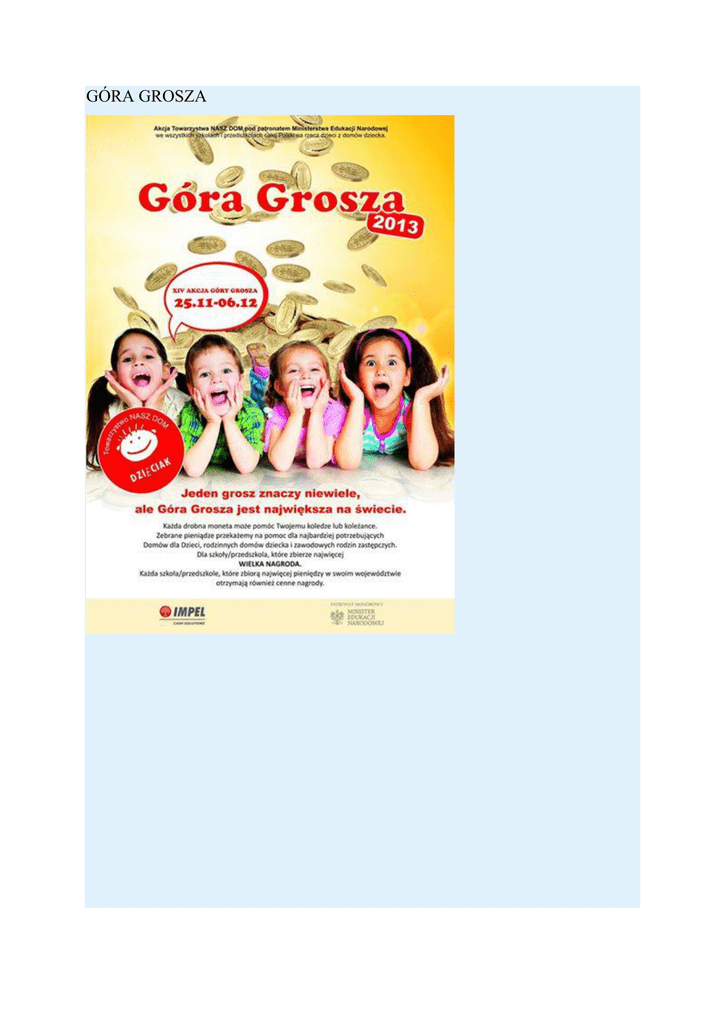 GÓRA GROSZA Od 25 listopada do 6 grudnia 2013 r. w naszym przedszkolu przeprowadziliśmy zbiórkę monet groszowych w ramach akcji „Góra Grosza". Organizatorem XIV już edycji akcji jest Towarzystwo „Nasz Dom" z siedzibą w Warszawie. Celem akcji jest m.in. zebranie funduszy na pomoc dla istniejących Domów Dziecka, tworzenie nowych Rodzinnych Domów Dziecka oraz na programy terapeutyczne dla dzieci osieroconych. Zadania akcji zostały przybliżone rodzicom poprzez wywieszenie plakatów w przedszkolu. Monety zbierane były do specjalnego pojemnika, umieszczonego na głównym korytarzu w widocznym miejscu. W akcji uczestniczyły wszystkie grupy z naszego przedszkola. Ogółem podczas XIV edycji akcji „Góra Grosza" zebraliśmy 160zł 70 groszy w tym: 2690 monet 1 gr 1645 monet 2 gr 1028 monet 5 gr 230 monet 10 gr 75 monet 20 gr 9 monet 50 gr 3 monet 1 zł 2 monety 2 zł Dnia 15 stycznia 2014r opiekun akcji wysłał protokół ze zbiórki pieniędzy na adres Towarzystwa „Nasz Dom". Wszystkim dzieciom i rodzicom serdecznie dziękujemy za udział w akcji i zapraszamy do udziału za rok w kolejnej edycji.