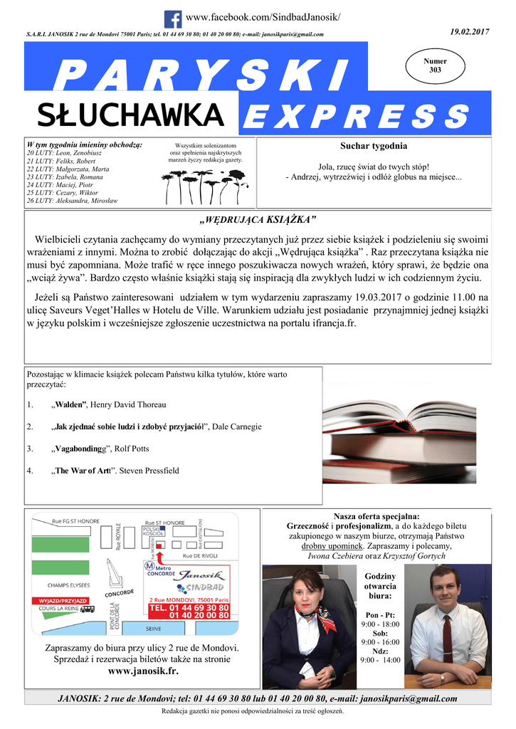 www.facebook.com/SindbadJanosik/ 19.02.2017 S.A.R.L JANOSIK 2 rue de Mondovi 75001 Paris; tel. 01 44 69 30 80; 01 40 20 00 80; e-mail: [email protected] PARYSKI Numer 303 SŁUCHAWKA E X P R E S S W tym tygodniu imieniny obchodzą: Wszystkim solenizantom oraz spełnienia najskrytszych marzeń życzy redakcja gazety. 20 LUTY: Leon, Zenobiusz 21 LUTY: Feliks, Robert 22 LUTY: Małgorzata, Marta 23 LUTY: Izabela, Romana 24 LUTY: Maciej, Piotr 25 LUTY: Cezary, Wiktor 26 LUTY: Aleksandra, Mirosław Suchar tygodnia Jola, rzucę świat do twych stóp! - Andrzej, wytrzeźwiej i odłóż globus na miejsce... „WĘDRUJĄCA KSIĄŻKA” Wielbicieli czytania zachęcamy do wymiany przeczytanych już przez siebie książek i podzieleniu się swoimi wrażeniami z innymi. Można to zrobić dołączając do akcji „Wędrująca książka” . Raz przeczytana książka nie musi być zapomniana. Może trafić w ręce innego poszukiwacza nowych wrażeń, który sprawi, że będzie ona „wciąż żywa”. Bardzo często właśnie książki stają się inspiracją dla zwykłych ludzi w ich codziennym życiu. Jeżeli są Państwo zainteresowani udziałem w tym wydarzeniu zapraszamy 19.03.2017 o godzinie 11.00 na ulicę Saveurs Veget’Halles w Hotelu de Ville. Warunkiem udziału jest posiadanie przynajmniej jednej książki w języku polskim i wcześniejsze zgłoszenie uczestnictwa na portalu ifrancja.fr. Pozostając w klimacie książek polecam Państwu kilka tytułów, które warto przeczytać: 1. „Walden”, Henry David Thoreau 2. „Jak zjednać sobie ludzi i zdobyć przyjaciół”, Dale Carnegie 3. „Vagabondingg”, Rolf Potts 4. „The War of Artt”. Steven Pressfield Nasza oferta specjalna: Grzeczność i profesjonalizm, a do każdego biletu zakupionego w naszym biurze, otrzymają Państwo drobny upominek. Zapraszamy i polecamy, Iwona Czebiera oraz Krzysztof Gortych Godziny otwarcia biura: Zapraszamy do biura przy ulicy 2 rue de Mondovi. Sprzedaż i rezerwacja biletów także na stronie Pon - Pt: 9:00 - 18:00 Sob: 9:00 - 16:00 Ndz: 9:00 - 14:00 www.janosik.fr. JANOSIK: 2 rue de Mondovi; tel: 01 44 69 30 80 lub 01 40 20 00 80, e-mail: [email protected] Redakcja gazetki nie ponosi odpowiedzialności za treść ogłoszeń. Renomowana i legalnie działająca firma prowadzi transfery na lotniska. Biuro Janosik poleca. PRACA : Elektryk Murarz +48 522305833 Monter płyt karton-gips +48 504734983 Operator wózka widłowego Spawacz MIG/MAG +48 571445378 Posadzkarz (z zakwaterowaniem) [email protected] MIESZKANIE — USŁUGI — NAUKA — INNE : Korepetycje język francuski kontakt e-mail: [email protected] Fotograf 06 27 31 22 18 Pokój do wynajęcia dla dwóch osób lub miejsce w pokoju dwuosobowym . kuchnia, WC, internet, do dyspozycji. Linia metra 7- druga zona. Telefon : 07 83 14 94 01 Dajcie nam znać jaki rodzaj łamigłówek chcielibyście rozwiązywać. Masz problemy z piciem? Może Anonimowi Alkoholicy pomogą! Tłumaczenia przysięgłe i zwykłe 07 82 15 98 22 Pomoc językowa i w sprawach urzędowych 06 12 79 44 37 Les Mureaux – sprzątanie klatek schodowych w blokach 06 61 15 00 28 Wszelaka pomoc prawna w administracji francuskiej (RSA, CAF, CNAV, ASSURANCE MALADIE, otwieranie firm i inne). Kontakt: Edyta - 06 22 72 26 68 [email protected] NIEDZIELA - 17.00: 3 rue Rampale (kod: 9172), Paris, Metro: Belleville. WTOREK – 19.30: 18 rue Claude Lorrain, Paris, Metro: Exelmans. ŚRODA – 19.30: 20 rue Legendre (I piętro), Paris, Metro: Villiers. CZWARTEK: 19.30: 11 Ville St-Jacques (kod: 0911); 10.45 -12.15: 3 rue Rampal, (kod: 9172), Metro: Belleville Godz. 19.30: (GRUPA AA DLA KOBIET) 3, rue Rampal, (kod: 9172), 75019 Paris, Metro: Belleville. Wynajmę studio 20 m. kwadratowych dla małżeństwa lub dwóch dziewczyn. Alfortville obok stacji RER B. Cena: 600 euro. Tel.1: 06 17 24 91 63 Tel.2: 06 29 91 39 22 _________________________ Mieszkanie do wynajęcia w Clamart dla pary lub przewoźnika, 29m (pokój, łazienka, kuchnia) parter, wejście z ulicy. 650euro/miesiąc. Tel. 06 18 60 16 21 Więcej plansz Sudoku na: mojesudoku.pl Przewóz Tadzik Bus oferuje: Przewóz osób i zwierząt, domowe wyroby, polskie produkty, przeprowadzki, transport motocykli i quadów. Zamówienia specjalne: spożywcze, budowlane, motoryzacyjne i inne. Wyjazdy z Paryża co sobotę godzina 20:00. Wyjazdy z Polski co czwartek o godzinie 10:00. Telefon: 0033 69 577 16 55 0033 78 1945 966 0048 500 89 14 22 Miejsce na Twoje ogłoszenie! UWAGA! Nowość w Moulin Tour Paris Poza wynajmem autokarów oraz busów, organizowaniem wycieczek szkolnych i pielgrzymek, wprowadzamy nowość - dowóz na odjazdy i odbiór z przyjazdów autokarów Sindbad-Eurobus. Telefon: 07 83 07 12 77 Redakcja gazetki nie ponosi odpowiedzialności za treść ogłoszeń.