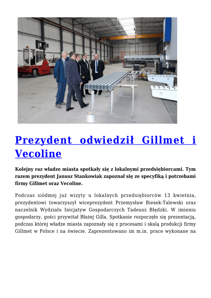 Prezydent odwiedził Gillmet i Vecoline Kolejny raz władze miasta spotkały się z lokalnymi przedsiębiorcami. Tym razem prezydent Janusz Stankowiak zapoznał się ze specyfiką i potrzebami firmy Gillmet oraz Vecoline. Podczas siódmej już wizyty u lokalnych przedsiębiorców 13 kwietnia, prezydentowi towarzyszył wiceprezydent Przemysław Biesek-Talewski oraz naczelnik Wydziału Inicjatyw Gospodarczych Tadeusz Błędzki. W imieniu gospodarzy, gości przywitał Błażej Gilla. Spotkanie rozpoczęło się prezentacją, podczas której władze miasta zapoznały się z procesami i skalą produkcji firmy Gillmet w Polsce i na świecie. Zaprezentowano im m.in. prace wykonane na mistrzostwa świata koni arabskich w Dubaju. Firma Gillmet i Vecoline specjalizują się w branży wyrobów metalowych. Tworzą ją ludzie, którzy od pięciu pokoleń stale utrzymują ten sam profil działalności, dotyczący branży metalowo – budowlanej. Gillmet Sp. z o.o. zajmuje się głównie budowaniem hal stalowych, które są wykorzystywane między innymi jako hale magazynowe, przemysłowe, namiotowe, hale szybkiego montażu oraz bramy wielkogabarytowe. Firma oferuje także usługi cynkowania ogniowego i śrutowania. Od dwóch lat jest też producentem stajni i ujeżdżalni dla koni. Z kolei firma Vecoline jest producentem urządzeń grzewczowentylacyjnych. – Jesteśmy bardzo otwarci i elastyczni – powiedział szef „Gillmetu”. – Potrafimy dotrzeć z naszymi wyrobami do każdego miejsca w kraju, dzięki temu doskonale znamy potrzeby naszych klientów. W dziedzinie konstrukcji stalowych nie musimy się już zbytnio reklamować, bo jesteśmy znani w branży od lat i klienci nam ufają – dodał. Natomiast od dwóch lat mocno wchodzimy na rynek jeździecki, czyli w obiekty hippiczne na całym świecie. Wystawiamy się w Europie i nie tylko. Klientów mamy także w Abu dhabi. Prezydenci zachęcali przedsiębiorców do inwestowania i rozwijania biznesu na terenie Starogardu Gdańskiego, który – jak podkreślili – ma potencjał i dobre grunty inwestycyjne. Wspomnieli o planach rozszerzenia Specjalnej Strefy Ekonomicznej. – Znalezienie terenu inwestycyjnego jest dużym problem – przyznał Andrzej Wojtysiak Dyrektor Zakładu Powłok Antykorozyjnych. – Grunt musi być uzbrojony. Potrzebny jest gaz, prąd, droga dojazdowa, a to szereg przeszkód do pokonania. Kiedy budowaliśmy zakład w Starogardzie, sami musieliśmy doprowadzić wszystkie media, co nas bardzo dużo kosztowało. – Obecnie to się zmienia – zwrócił uwagę Tadeusz Błędzki. Miasto dostrzega potrzebę powstawania nowych zakładów, bo to są dodatkowe miejsca pracy. Przygotowując tereny inwestycyjne wychodzimy naprzeciw potrzebom inwestorów. Wiemy, że przedsiębiorcy najchętniej wybierają tereny położone blisko miasta, które są przygotowane do szybkiego zagospodarowania. – W Starogardzie jest potencjał, jest wielu inżynierów i wiemy, że jeżeli nie będą tu powstawać zakłady, to ten potencjał będzie się zmniejszał – dodał prezydent. Uczestnicy spotkania rozmawiali też o problemach, związanych ze znalezieniem fachowców do pracy. Błażej Gilla żalił się, że brakuje mu chętnych i zaangażowanych ludzi do pracy. – Mamy plany inwestycyjne, wizje rozwoju, nowe patenty…, ale ciągle brakuje fachowców – podkreślił. Prezydent przyznał, że to jest istotny problem wszystkich przedsiębiorców. Firma z wielkimi tradycjami W roku 2011 firma „Gillmet” obchodziła swoje 100-lecie. Wilhelm Gilla – przodek obecnych właścicieli w 1911 roku wybudował i otworzył pierwszy zakład kowalski w Zblewie. Z roku na rok warsztat się powiększał. To waśnie tam zawodu uczył się obecny właściciel firmy Roman Gilla, który zaczynał od prostych prac ślusarskich. Kilkanaście lat później działalność przeniósł do Starogardu Gdańskiego, gdzie wybudował nowy zakład. Zajął się produkcją betoniarek, wind budowlanych, podstaw do stołów, szaf ubraniowych, krat pomostowe czy pojemników na odpady i kontenerów. Kolejny zakład powstał już w latach dziewięćdziesiątych w Rokocinie. To nowoczesna wytwórnia konstrukcji stalowych, w której wraz z synem Błażejem Gilla rozpoczął produkcję hal i konstrukcji stalowych. Ostatnią ważną inwestycją firmy było wybudowanie Ocynkowni Ogniowej na terenie Pomorskiej Specjalnej Strefy Ekonomicznej w Starogardzie Gdańskim. W najbliższych latach planują dalszą rozbudowę. Natomiast zakład w Zblewie, który pozostał w rodzinie Gillów, ze względu na bogatą historię i tradycje chcą zamienić w rodzinne muzeum. Tradycyjnie władze miasta zwiedziły zakład, zapoznając się z warunkami pracy i produkcją na miejscu.