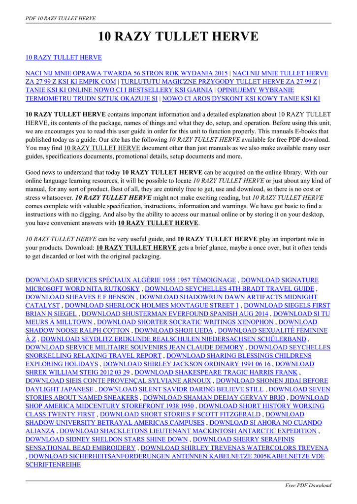 PDF 10 RAZY TULLET HERVE 10 RAZY TULLET HERVE 10 RAZY TULLET HERVE NACI NIJ MNIE OPRAWA TWARDA 56 STRON ROK WYDANIA 2015 | NACI NIJ MNIE TULLET HERVE ZA 27 99 Z KSI KI EMPIK COM | TURLUTUTU MAGICZNE PRZYGODY TULLET HERVE ZA 27 99 Z | TANIE KSI KI ONLINE NOWO CI I BESTSELLERY KSI GARNIA | OPINIUJEMY WYBRANIE TERMOMETRU TRUDN SZTUK OKAZUJE SI | NOWO CI AROS DYSKONT KSI KOWY TANIE KSI KI 10 RAZY TULLET HERVE contains important information and a detailed explanation about 10 RAZY TULLET HERVE, its contents of the package, names of things and what they do, setup, and operation. Before using this unit, we are encourages you to read this user guide in order for this unit to function properly. This manuals E-books that published today as a guide. Our site has the following 10 RAZY TULLET HERVE available for free PDF download. You may find 10 RAZY TULLET HERVE document other than just manuals as we also make available many user guides, specifications documents, promotional details, setup documents and more. Good news to understand that today 10 RAZY TULLET HERVE can be acquired on the online library. With our online language learning resources, it will be possible to locate 10 RAZY TULLET HERVE or just about any kind of manual, for any sort of product. Best of all, they are entirely free to get, use and download, so there is no cost or stress whatsoever. 10 RAZY TULLET HERVE might not make exciting reading, but 10 RAZY TULLET HERVE comes complete with valuable specification, instructions, information and warnings. We have got basic to find a instructions with no digging. And also by the ability to access our manual online or by storing it on your desktop, you have convenient answers with 10 RAZY TULLET HERVE. 10 RAZY TULLET HERVE can be very useful guide, and 10 RAZY TULLET HERVE play an important role in your products. Download: 10 RAZY TULLET HERVE gets a brief glance, maybe a once over, but it often tends to get discarded or lost with the original packaging. DOWNLOAD SERVICES SPÉCIAUX ALGÉRIE 1955 1957 TÉMOIGNAGE , DOWNLOAD SIGNATURE MICROSOFT WORD NITA RUTKOSKY , DOWNLOAD SEYCHELLES 4TH BRADT TRAVEL GUIDE , DOWNLOAD SHEAVES E F BENSON , DOWNLOAD SHADOWRUN DAWN ARTIFACTS MIDNIGHT CATALYST , DOWNLOAD SHERLOCK HOLMES MONTAGUE STREET 1 , DOWNLOAD SIEGELS FIRST BRIAN N SIEGEL , DOWNLOAD SHUSTERMAN EVERFOUND SPANISH AUG 2014 , DOWNLOAD SI TU MEURS À MILLTOWN , DOWNLOAD SHORTER SOCRATIC WRITINGS XENOPHON , DOWNLOAD SHADOW NOOSE RALPH COTTON , DOWNLOAD SHOJI UEDA , DOWNLOAD SEXUALITÉ FÉMININE À Z , DOWNLOAD SEYDLITZ ERDKUNDE REALSCHULEN NIEDERSACHSEN SCHÜLERBAND , DOWNLOAD SERVICE MILITAIRE SOUVENIRS JEAN CLAUDE DEMORY , DOWNLOAD SEYCHELLES SNORKELLING RELAXING TRAVEL REPORT , DOWNLOAD SHARING BLESSINGS CHILDRENS EXPLORING HOLIDAYS , DOWNLOAD SHIRLEY JACKSON ORDINARY 1991 06 16 , DOWNLOAD SHREK WILLIAM STEIG 2012 03 29 , DOWNLOAD SHAKESPEARE TRAGIC HARRIS FRANK , DOWNLOAD SIEIS CONTE PROVENÇAL SYLVIANE ARNOUX , DOWNLOAD SHONEN JIDAI BEFORE DAYLIGHT JAPANESE , DOWNLOAD SILENT SAVIOR DARING BELIEVE STILL , DOWNLOAD SEVEN STORIES ABOUT NAMED SNEAKERS , DOWNLOAD SHAMAN DEEJAY GERVAY BRIO , DOWNLOAD SHOP AMERICA MIDCENTURY STOREFRONT 1938 1950 , DOWNLOAD SHORT HISTORY WORKING CLASS TWENTY FIRST , DOWNLOAD SHORT STORIES F SCOTT FITZGERALD , DOWNLOAD SHADOW UNIVERSITY BETRAYAL AMERICAS CAMPUSES , DOWNLOAD SI AHORA NO CUANDO ALIANZA , DOWNLOAD SHACKLETONS LIEUTENANT MACKINTOSH ANTARCTIC EXPEDITION , DOWNLOAD SIDNEY SHELDON STARS SHINE DOWN , DOWNLOAD SHERRY SERAFINIS SENSATIONAL BEAD EMBROIDERY , DOWNLOAD SHIRLEY TREVENAS WATERCOLORS TREVENA , DOWNLOAD SICHERHEITSANFORDERUNGEN ANTENNEN KABELNETZE 2005KABELNETZE VDE SCHRIFTENREIHE Free PDF Download