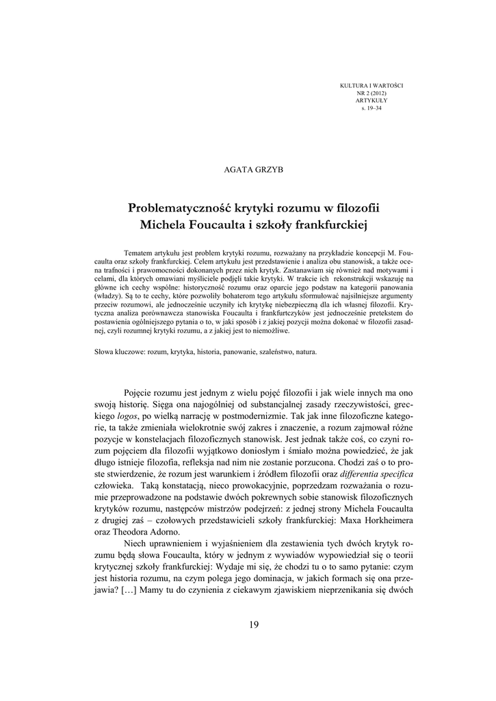 KULTURA I WARTOŚCI NR 2 (2012) ARTYKUŁY s. 19–34 AGATA GRZYB Problematyczność krytyki rozumu w filozofii Michela Foucaulta i szkoły frankfurckiej Tematem artykułu jest problem krytyki rozumu, rozważany na przykładzie koncepcji M. Foucaulta oraz szkoły frankfurckiej. Celem artykułu jest przedstawienie i analiza obu stanowisk, a także ocena trafności i prawomocności dokonanych przez nich krytyk. Zastanawiam się również nad motywami i celami, dla których omawiani myśliciele podjęli takie krytyki. W trakcie ich rekonstrukcji wskazuję na główne ich cechy wspólne: historyczność rozumu oraz oparcie jego podstaw na kategorii panowania (władzy). Są to te cechy, które pozwoliły bohaterom tego artykułu sformułować najsilniejsze argumenty przeciw rozumowi, ale jednocześnie uczyniły ich krytykę niebezpieczną dla ich własnej filozofii. Krytyczna analiza porównawcza stanowiska Foucaulta i frankfurtczyków jest jednocześnie pretekstem do postawienia ogólniejszego pytania o to, w jaki sposób i z jakiej pozycji można dokonać w filozofii zasadnej, czyli rozumnej krytyki rozumu, a z jakiej jest to niemożliwe. Słowa kluczowe: rozum, krytyka, historia, panowanie, szaleństwo, natura. Pojęcie rozumu jest jednym z wielu pojęć filozofii i jak wiele innych ma ono swoją historię. Sięga ona najogólniej od substancjalnej zasady rzeczywistości, greckiego logos, po wielką narrację w postmodernizmie. Tak jak inne filozoficzne kategorie, ta także zmieniała wielokrotnie swój zakres i znaczenie, a rozum zajmował różne pozycje w konstelacjach filozoficznych stanowisk. Jest jednak także coś, co czyni rozum pojęciem dla filozofii wyjątkowo doniosłym i śmiało można powiedzieć, że jak długo istnieje filozofia, refleksja nad nim nie zostanie porzucona. Chodzi zaś o to proste stwierdzenie, że rozum jest warunkiem i źródłem filozofii oraz differentia specifica człowieka. Taką konstatacją, nieco prowokacyjnie, poprzedzam rozważania o rozumie przeprowadzone na podstawie dwóch pokrewnych sobie stanowisk filozoficznych krytyków rozumu, następców mistrzów podejrzeń: z jednej strony Michela Foucaulta z drugiej zaś – czołowych przedstawicieli szkoły frankfurckiej: Maxa Horkheimera oraz Theodora Adorno. Niech uprawnieniem i wyjaśnieniem dla zestawienia tych dwóch krytyk rozumu będą słowa Foucaulta, który w jednym z wywiadów wypowiedział się o teorii krytycznej szkoły frankfurckiej: Wydaje mi się, że chodzi tu o to samo pytanie: czym jest historia rozumu, na czym polega jego dominacja, w jakich formach się ona przejawia? […] Mamy tu do czynienia z ciekawym zjawiskiem nieprzenikania się dwóch 19 AGATA GRZYB – PROBLEMATYCZNOŚĆ KRYTYKI ROZUMU W FILOZOFII M. F0UCAULTA... postaci myśli wyjątkowo sobie bliskich i być może ta bliskość właśnie tłumaczy owo nieprzenikanie się. Nic nie ukrywa bardziej wspólnego problemu niż dwa pokrewne sposoby podchodzenia do niego.”1. Zarówno filozofia Foucaulta, jak i teoria krytyczna są ciągle obecne i dyskutowane we współczesnych debatach o kondycji współczesnych społeczeństw i kondycji rozumu w filozofii. Można chyba powiedzieć, że autorzy ci doczekali się wręcz pozycji klasyków. W niniejszym artykule spróbuję pokazać podobieństwa i różnice obu stanowisk oraz odtworzyć przebieg, technikę, cel i wynik stoczonej przez nich walki przeciwko rozumowi (która, jak spróbuję pokazać, musi być jednocześnie walką o rozum). Gdy mówię o „technice walki”, mam na myśli także ogólniejsze pytanie o to, jakich środków należy użyć, by dokonać spójnej, racjonalnej krytyki rozumu, a z jakiej pozycji jest to niemożliwe. Analizowany przeze mnie materiał swą objętością i bogactwem znacznie przekracza możliwości jakie daje forma artykułu, dlatego też moje przedstawienie stanowisk Foucaulta i frankfurtczyków nie pretenduje do kompletności. Wybrałam z całości ich twórczości te elementy, które moim zdaniem dają możliwie najbardziej adekwatny obraz przeprowadzonej przez nich krytyki rozumu. W przypadku frankfurtczyków pomijam ich początkowy okres prac nad teorią krytyczną (przedwojenny) i koncentruję się na dwóch głównych pozycjach: Krytyce instrumentalnego rozumu2 i Dialektyce oświecenia.3 W badaniach Foucaulta konieczne jest przedstawienie pewnej ewolucji jego stanowiska, związanej również z ewolucją metody. Większy jednak nacisk kładę w tym tekście na jego pierwszy projekt, którego główne wątki zostały częściowo zmienione w projekcie genealogicznym, ale sądzę, że nigdy nie zostały przez Foucaulta do końca zarzucone. Dokonuję takiej selekcji również ze względu na to, że filozofia z tego drugiego okresu, prezentowana zwłaszcza w Nadzorować i karać4 jest znacznie lepiej znana i częściej dyskutowana, dlatego streszczanie jej w tym artykule uznałam za niekonieczne. HISTORIA ROZUMU W UJĘCIU M. FOUCAULTA Pierwszy, najbardziej rzucający się w oczy wspólny rys krytyki racjonalności w wersji Foucaulta i szkoły frankfurckiej to wątek historyczności rozumu. Obie koncepcje zdecydowanie odrzucają klasyczną, substancjalną definicję rozumu i rozum kartezjański na rzecz rozumu funkcjonującego w historii, zmiennego i uwikłanego w relacje między człowiekiem a jego kulturą i społeczeństwem. To wspólne założenie zawdzięczają, jak sądzę, wspólnym źródłom, z których się wywodzą. Mowa o marksistowskiej teorii dziejów i krytyce ideologii, a z drugiej strony – o głębokich inspiracjach ze strony nietzscheańskiej krytyki nihilizmu. Inspiracje te przybierające formę 1 M. Foucault, Strukturalizm i poststrukturalizm, [w:] Filozofia, historia, polityka. Wybór pism, tłum. D. Leszczyński, L. Rasiński, Wydawnictwo Naukowe PWN, Warszawa– Wrocław, 2000, s. 302. 2 M. Horkheimer, Krytyka instrumentalnego rozumu, tłum., H. Walentowicz, Wydawnictwo Naukowe Scholar, Warszawa 2007. 3 M. Horkheime