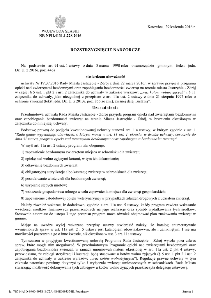 Katowice, 29 kwietnia 2016 r. WOJEWODA ŚLĄSKI NR NPII.4131.1.228.2016 ROZSTRZYGNIĘCIE NADZORCZE Na podstawie art. 91 ust. 1 ustawy z dnia 8 marca 1990 roku o samorządzie gminnym (tekst jedn. Dz. U. z 2016r. poz. 446) stwierdzam nieważność uchwały Nr IV.37.2016 Rady Miasta Jastrzębie - Zdrój z dnia 22 marca 2016r. w sprawie przyjęcia programu opieki nad zwierzętami bezdomnymi oraz zapobiegania bezdomności zwierząt na terenie miasta Jastrzębie - Zdrój w części § 5 ust. 1 pkt 2 i ust. 2 załącznika do uchwały w zakresie wyrazów: „oraz kotów wolnożyjących” i § 11 załącznika do uchwały, jako niezgodnej z przepisem z art. 11a ust. 2 ustawy z dnia 21 sierpnia 1997 roku o ochronie zwierząt (tekst jedn. Dz. U. z 2013r. poz. 856 ze zm.), zwanej dalej „ustawą”. Uzasadnienie Przedmiotową uchwałą Rada Miasta Jastrzębie - Zdrój przyjęła program opieki nad zwierzętami bezdomnymi oraz zapobiegania bezdomności zwierząt na terenie Miasta Jastrzębie - Zdrój, w brzmieniu określonym w załączniku do niniejszej uchwały. Podstawę prawną do podjęcia kwestionowanej uchwały stanowi art. 11a ustawy, w którym zgodnie z ust. 1 "Rada gminy wypełniając obowiązek, o którym mowa w art. 11 ust. 1, określa, w drodze uchwały, corocznie do dnia 31 marca, program opieki nad zwierzętami bezdomnymi oraz zapobiegania bezdomności zwierząt". W myśl art. 11a ust. 2 ustawy program taki obejmuje: 1) zapewnienie bezdomnym zwierzętom miejsca w schronisku dla zwierząt; 2) opiekę nad wolno żyjącymi kotami, w tym ich dokarmianie; 3) odławianie bezdomnych zwierząt; 4) obligatoryjną sterylizację albo kastrację zwierząt w schroniskach dla zwierząt; 5) poszukiwanie właścicieli dla bezdomnych zwierząt; 6) usypianie ślepych miotów; 7) wskazanie gospodarstwa rolnego w celu zapewnienia miejsca dla zwierząt gospodarskich; 8) zapewnienie całodobowej opieki weterynaryjnej w przypadkach zdarzeń drogowych z udziałem zwierząt. Należy również wskazać, iż dodatkowo, zgodnie z art. 11a ust. 5 ustawy, każdy program zawiera wskazanie wysokości środków finansowych przeznaczonych na jego realizację oraz sposób wydatkowania tych środków. Stosownie natomiast do ustępu 3 tego przepisu program może również obejmować plan znakowania zwierząt w gminie. Mając na uwadze wyżej wskazane przepisy ustawy stwierdzić należy, że katalog enumeratywnie wymienionych spraw w art. 11a ust. 2 i 5 ustawy jest katalogiem obowiązkowym, ale i zamkniętym. I nie ma możliwości poszerzenia go o inne kwestie, niż określone w ust. 3 art. 11a ustawy. Tymczasem w przyjętym kwestionowaną uchwałą Programie Rada Jastrzębie - Zdrój wyszła poza zakres spraw, które mogła nim uregulować. W przedmiotowym Programie opieki nad zwierzętami bezdomnymi oraz zapobiegania bezdomności zwierząt, w ramach unormowań materii określonej w art. 11a ust. 2 pkt 4 ustawy, przewidziano, że zabiegi sterylizacji i kastracji będą stosowane u kotów wolno żyjących (§ 5 ust. 1 pkt 2 i ust. 2 załącznika do uchwały w zakresie wyrazów: „oraz kotów wolnożyjących”). Regulacje prawne uchwały w tym zakresie natomiast powinny dotyczyć tylko i wyłącznie zwierząt umieszczonych w schroniskach. Rada Miasta stwarzając możliwość dokonywania tych zabiegów u kotów wolno żyjących przekroczyła delegację ustawową. Id: 7B714A1D-9F00-493B-BC2A-4E4E0093374E. Podpisany Strona 1 Podobnie należy stwierdzić co do materii określonej w § 11 załącznika do uchwały. Kwestia edukowania mieszkańców miasta w zakresie opieki nad zwierzętami, nie wchodzi w zakres programu, o którym mowa w art. 11a ust. 2 ustawy, a co za tym idzie nie może być regulowana w drodze omawianego programu (por. wyrok Wojewódzkiego Sądu Administracyjnego we Wrocławiu z dnia 11 grudnia 2012 r., sygn. akt II SA/Wr 570/12, wyrok Wojewódzkiego Sądu Administracyjnego w Gorzowie z dnia 28 sierpnia 2014r. sygn. akt II SA/Go 389/14, wyrok Wojewódzkiego Sądu Administracyjnego w Bydgoszczy z dnia 19 listopada 2013r. sygn. akt II SA/Bd 887/13, publ. CBOSA). Naczelną zasadą prawa administracyjnego jest zakaz domniemania kompetencji. To oznacza, że normy kompetencyjne powinny być interpretowane w sposób ścisły i literalny. Tym samym zakazane jest dokonywanie wykładni rozszerzającej przepisów kompetencyjnych oraz wyprowadzanie kompetencji w drodze analogii. Bezwzględny obowiązek działania organów stanowiących w granicach prawa (art. 7 Konstytucji RP) wyklucza zatem wykraczanie przez radę poza granice upoważnienia ustawowego. Wszelkie zaś takie działania uznawane są za istotne naruszenie prawa i jako takie nie mogą być akceptowane. Mając powyższe na uwadze, należy stwierdzić, że zamieszczenie w uchwale kwestionowanych przepisów nastąpiło z istotnym naruszeniem przepisów prawa, gdyż art. 11a ustawy nie upoważnia Rady Miasta Jastrzębie Zdrój do uregulowania kwestii dotyczących edukacji mieszkańców oraz sterylizacji i kastracji kotów wolnożyjących. Tym samym stwierdzenie nieważności przedmiotowej uchwały we wskazanej części jest uzasadnione i konieczne. Stwierdzenie nieważności uchwały, zgodnie z art. 92 ust. 1 ustawy o samorządzie gminnym, wstrzymuje jej wykonanie z mocy prawa w zakresie objętym stwierdzeniem nieważności, z dniem doręczenia rozstrzygnięcia nadzorczego. Na niniejsze rozstrzygnięcie nadzorcze służy skarga do Wojewódzkiego Sądu Administracyjnego w Gliwicach, za pośrednictwem Wojewody Śląskiego, w terminie 30 dni od dnia doręczenia rozstrzygnięcia. Otrzymują: 1) Rada Miasta Jastrzębie - Zdrój, 2) aa. z up. WOJEWODY ŚLĄSKIEGO Dyrektor Wydziału Nadzoru Prawnego Krzysztof Nowak Id: 7B714A1D-9F00-493B-BC2A-4E4E0093374E. Podpisany Strona 2