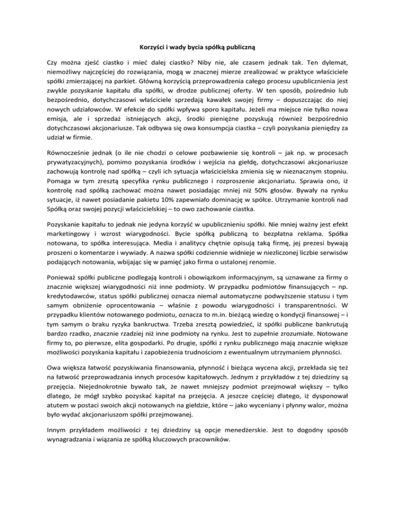 Korzyści i wady bycia spółką publiczną Czy można zjeść ciastko i mieć dalej ciastko? Niby nie, ale czasem jednak tak. Ten dylemat, niemożliwy najczęściej do rozwiązania, mogą w znacznej mierze zrealizować w praktyce właściciele spółki zmierzającej na parkiet. Główną korzyścią przeprowadzenia całego procesu upublicznienia jest zwykle pozyskanie kapitału dla spółki, w drodze publicznej oferty. W ten sposób, pośrednio lub bezpośrednio, dotychczasowi właściciele sprzedają kawałek swojej firmy – dopuszczając do niej nowych udziałowców. W efekcie do spółki wpływa sporo kapitału. Jeżeli ma miejsce nie tylko nowa emisja, ale i sprzedaż istniejących akcji, środki pieniężne pozyskują również bezpośrednio dotychczasowi akcjonariusze. Tak odbywa się owa konsumpcja ciastka – czyli pozyskania pieniędzy za udział w firmie. Równocześnie jednak (o ile nie chodzi o celowe pozbawienie się kontroli – jak np. w procesach prywatyzacyjnych), pomimo pozyskania środków i wejścia na giełdę, dotychczasowi akcjonariusze zachowują kontrolę nad spółką – czyli ich sytuacja właścicielska zmienia się w nieznacznym stopniu. Pomaga w tym zresztą specyfika rynku publicznego i rozproszenie akcjonariatu. Sprawia ono, iż kontrolę nad spółką zachować można nawet posiadając mniej niż 50% głosów. Bywały na rynku sytuacje, iż nawet posiadanie pakietu 10% zapewniało dominację w spółce. Utrzymanie kontroli nad Spółką oraz swojej pozycji właścicielskiej – to owo zachowanie ciastka. Pozyskanie kapitału to jednak nie jedyna korzyść w upublicznieniu spółki. Nie mniej ważny jest efekt marketingowy i wzrost wiarygodności. Bycie spółką publiczną to bezpłatna reklama. Spółka notowana, to spółka interesująca. Media i analitycy chętnie opisują taką firmę, jej prezesi bywają proszeni o komentarze i wywiady. A nazwa spółki codziennie widnieje w niezliczonej liczbie serwisów podających notowania, wbijając się w pamięć jako firma o ustalonej renomie. Ponieważ spółki publiczne podlegają kontroli i obowiązkom informacyjnym, są uznawane za firmy o znacznie większej wiarygodności niż inne podmioty. W przypadku podmiotów finansujących – np. kredytodawców, status spółki publicznej oznacza niemal automatyczne podwyższenie statusu i tym samym obniżenie oprocentowania – właśnie z powodu wiarygodności i transparentności. W przypadku klientów notowanego podmiotu, oznacza to m.in. bieżącą wiedzę o kondycji finansowej – i tym samym o braku ryzyka bankructwa. Trzeba zresztą powiedzieć, iż spółki publiczne bankrutują bardzo rzadko, znacznie rzadziej niż inne podmioty na rynku. Jest to zupełnie zrozumiałe. Notowane firmy to, po pierwsze, elita gospodarki. Po drugie, spółki z rynku publicznego mają znacznie większe możliwości pozyskania kapitału i zapobieżenia trudnościom z ewentualnym utrzymaniem płynności. Owa większa łatwość pozyskiwania finansowania, płynność i bieżąca wycena akcji, przekłada się też na łatwość przeprowadzania innych procesów kapitałowych. Jednym z przykładów z tej dziedziny są przejęcia. Niejednokrotnie bywało tak, że nawet mniejszy podmiot przejmował większy – tylko dlatego, że mógł szybko pozyskać kapitał na przejęcia. A jeszcze częściej dlatego, iż dysponował atutem w postaci swoich akcji notowanych na giełdzie, które – jako wyceniany i płynny walor, można było wydać akcjonariuszom spółki przejmowanej. Innym przykładem możliwości z tej dziedziny są opcje menedżerskie. Jest to dogodny sposób wynagradzania i wiązania ze spółką kluczowych pracowników. Bycie spółką publiczną to jednak nie tylko korzyści, ale i pewne niedogodności. Niedogodności zresztą niewspółmierne do potencjalnych korzyści. Pierwszą sprawą są dodatkowe koszty. W początkowym etapie koszty te związane są z samym procesem upublicznienia i przeprowadzenia emisji publicznej – są to np. koszty sporządzenia prospektu emisyjnego, wynagrodzenie dla oferującego, promocja oferty, opłaty urzędowe. Te koszty nie są małe, ale pokrywane są w zdecydowanej większości ze środków z emisji – nie są wiec dla spółki dodatkowym obciążeniem. W drugim etapie koszty te związane są z notowaniem i wypełnianiem obowiązków informacyjnych. To już są znacznie mniejsze sumy, do udźwignięcia nawet przez podmioty o umiarkowanych rozmiarach. Druga istotna niedogodność wiąże się z koniecznością realizacji obowiązków informacyjnych. Jest to zatem dla spółki dodatkowa praca do wykonania, ale też i w pewnym stopniu odsłonięcie się przed potencjalną konkurencją. W spółce publicznej po prostu więcej zawsze widać. W ograniczonym stopniu obowiązki informacyjne dotyczą też i akcjonariuszy spółki – chodzi tu głównie o znaczne pakiety akcji. No i wreszcie minus najbardziej oczywisty – trzeba po prostu część spółki oddać w obce ręce – czy to drobnych inwestorów, czy inwestorów finansowych. Mają oni swoje prawa – np. prawo do udziału w ewentualnej dywidendzie, czy uczestnictwa w walnym. Mają też prawo do uzyskiwania rzetelnej informacji o sytuacji w spółce. Trzeba te wszystkie prawa respektować. Minusy bycia spółką publiczną istnieją więc, ale są nieproporcjonalne do korzyści z tego tytułu. Trudno się więc dziwić, iż coraz więcej firm wybiera rozwoju poprzez emisję publiczną i późniejsze notowanie na rynku giełdowym.