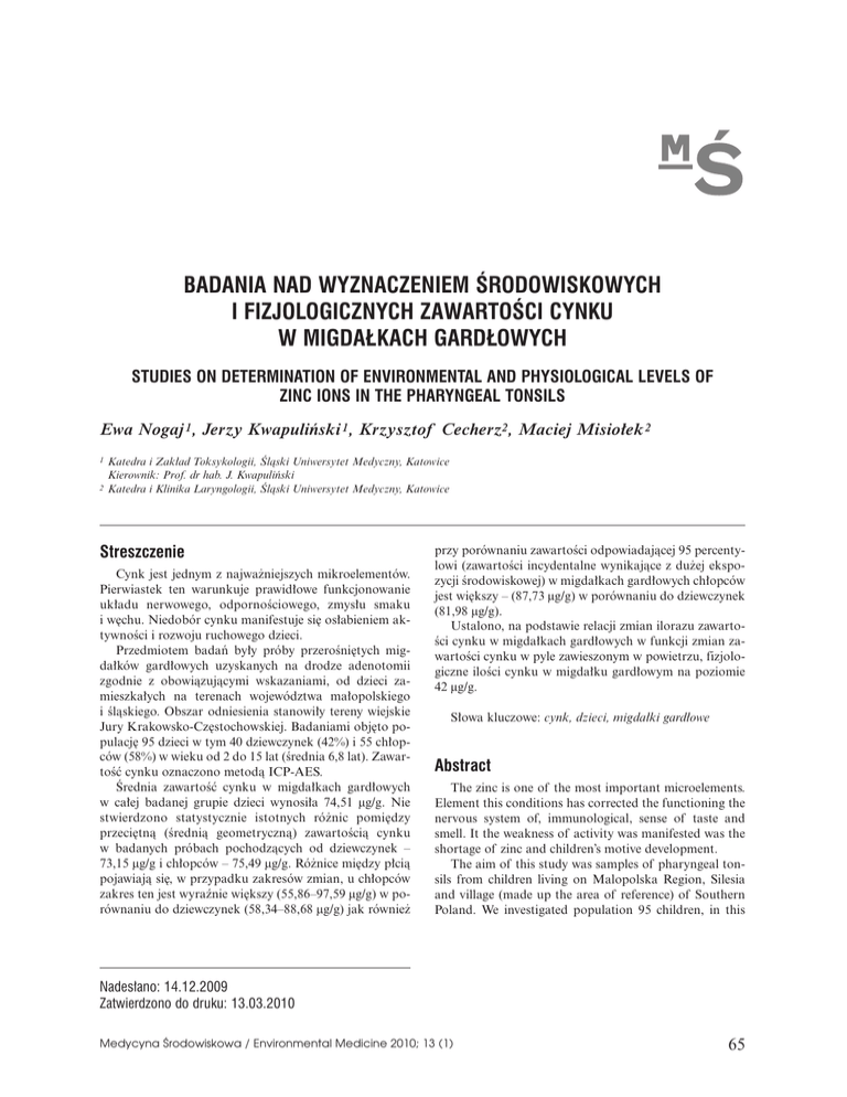 BADANIA NAD WYZNACZENIEM ÂRODOWISKOWYCH I FIZJOLOGICZNYCH ZAWARTOÂCI CYNKU W MIGDA¸KACH GARD¸OWYCH STUDIES ON DETERMINATION OF ENVIRONMENTAL AND PHYSIOLOGICAL LEVELS OF ZINC IONS IN THE PHARYNGEAL TONSILS Ewa Nogaj 1, Jerzy Kwapuliƒski 1, Krzysztof Cecherz2, Maciej Misio∏ek 2 1 2 Katedra i Zak∏ad Toksykologii, Âlàski Uniwersytet Medyczny, Katowice Kierownik: Prof. dr hab. J. Kwapuliƒski Katedra i Klinika Laryngologii, Âlàski Uniwersytet Medyczny, Katowice Streszczenie Cynk jest jednym z najwa˝niejszych mikroelementów. Pierwiastek ten warunkuje prawid∏owe funkcjonowanie uk∏adu nerwowego, odpornoÊciowego, zmys∏u smaku i w´chu. Niedobór cynku manifestuje si´ os∏abieniem aktywnoÊci i rozwoju ruchowego dzieci. Przedmiotem badaƒ by∏y próby przeroÊni´tych migda∏ków gard∏owych uzyskanych na drodze adenotomii zgodnie z obowiàzujàcymi wskazaniami, od dzieci zamieszka∏ych na terenach województwa ma∏opolskiego i Êlàskiego. Obszar odniesienia stanowi∏y tereny wiejskie Jury Krakowsko-Cz´stochowskiej. Badaniami obj´to populacj´ 95 dzieci w tym 40 dziewczynek (42%) i 55 ch∏opców (58%) w wieku od 2 do 15 lat (Êrednia 6,8 lat). ZawartoÊç cynku oznaczono metodà ICP-AES. Ârednia zawartoÊç cynku w migda∏kach gard∏owych w ca∏ej badanej grupie dzieci wynosi∏a 74,51 µg/g. Nie stwierdzono statystycznie istotnych ró˝nic pomi´dzy przeci´tnà (Êrednià geometrycznà) zawartoÊcià cynku w badanych próbach pochodzàcych od dziewczynek – 73,15 µg/g i ch∏opców – 75,49 µg/g. Ró˝nice mi´dzy p∏cià pojawiajà si´, w przypadku zakresów zmian, u ch∏opców zakres ten jest wyraênie wi´kszy (55,86–97,59 µg/g) w porównaniu do dziewczynek (58,34–88,68 µg/g) jak równie˝ przy porównaniu zawartoÊci odpowiadajàcej 95 percentylowi (zawartoÊci incydentalne wynikajàce z du˝ej ekspozycji Êrodowiskowej) w migda∏kach gard∏owych ch∏opców jest wi´kszy – (87,73 µg/g) w porównaniu do dziewczynek (81,98 µg/g). Ustalono, na podstawie relacji zmian ilorazu zawartoÊci cynku w migda∏kach gard∏owych w funkcji zmian zawartoÊci cynku w pyle zawieszonym w powietrzu, fizjologiczne iloÊci cynku w migda∏ku gard∏owym na poziomie 42 µg/g. S∏owa kluczowe: cynk, dzieci, migda∏ki gard∏owe Abstract The zinc is one of the most important microelements. Element this conditions has corrected the functioning the nervous system of, immunological, sense of taste and smell. It the weakness of activity was manifested was the shortage of zinc and children’s motive development. The aim of this study was samples of pharyngeal tonsils from children living on Malopolska Region, Silesia and village (made up the area of reference) of Southern Poland. We investigated population 95 children, in this Nades∏ano: 14.12.2009 Zatwierdzono do druku: 13.03.2010 Medycyna Ârodowiskowa / Environmental Medicine 2010; 13 (1) 65 40 girls (42%) and 55 boys (58%) in age from 2 till 15 years (average 6,8 years). The content of zinc was determined by ICP – AES method. Average the content of zinc in pharyngeal tonsils in whole studied children’s population carried out 74,51 µg/g. The statistical differences were not affirmed among average (the average geometrical) content of ions of zinc in studied come from girls – 73,15 µg/g and the boys – 75,49 µg/g. The differences between sex appear, in case of ranges of changes, at boys range this it is clearly larger (55,86–97,59 µg/g) in comparison to girls (58,34–88,68 µg/g) how also near comparison of content answering 95 percentylowi (the incidental resulting with large environmental exposition contents) it in the pharyngeal boys’ tonsils is larger – (87,73 µg/g) in comparison to young girls (81,98 µg/g). It was established, on basis of report of changes quotient content zinc in pharyngeal tonsils in function of changes of content zinc in air dust, the physiological quantities of zinc in pharyngeal tonsil on level 42 µg/g. Wst´p w miejscu przejÊcia sklepienia gard∏a w jego tylna Êcian´. Jego anatomiczne po∏o˝enie eksponuje go szczególnie na sta∏y kontakt z nowymi antygenami oraz ksenobiotykami, dostajàcymi si´ wy∏àcznie wraz z py∏ami zawieszonymi we wdychanym powietrzu [14, 15]. W kontekÊcie wielu badaƒ w oÊrodkach naukowych nad ocenà korelacji pomi´dzy st´˝eniem pierwiastków Êladowych w tkankach a iloÊcià tych pierwiastków w p∏ynach ustrojowych, zarówno w przypadku równowagi fizjologicznej, jak i w zaburzeniach patologicznych zasadne by∏o zainteresowanie si´ migda∏kiem gard∏owym jako potencjalnym biomarkerem ekspozycji na cynk [16]. Migda∏ek gard∏owy ze swojà lokalizacjà i strukturà morfologicznà mo˝e byç w∏aÊciwym i wybiórczym biomarkerem ekspozycji na cynk zawarty w pyle drobnodyspersyjnym zawieszonym w powietrzu podobnie jak w przypadku Al, Ba, Fe, Cr, Cd, Cu [17–22]. Dodajàc do tego fakt, ˝e adenotomia jest najcz´Êciej wykonywanym zabiegiem w laryngologii dzieci´cej, stwarza to idealne mo˝liwoÊci badawcze wyjaÊnienia ewentualnej roli migda∏ka gard∏owego jako biomarkera ekspozycji na cynk. Cynk nale˝y do pierwiastków niezb´dnych do ˝ycia, do tzw. mikrobiopierwiastków. Do tej pory zosta∏ rozpoznany w budowie blisko 200 enzymów obecnych w organizmie cz∏owieka [1]. Uczestniczy w procesach anabolicznych i katabolicznych, jak równie˝ jest regulatorem tych procesów [2]. Rozwój centralnego uk∏adu nerwowego, prawid∏owy rozwój i funkcjonowanie OUN zale˝y od obecnoÊci cynku w diecie. Dotyczy to bia∏ek, enzymów, neurotransmiterów, metalotioneiny [3, 4]. Cynk jest niezb´dny do utrzymania w∏aÊciwej struktury kwasów nukleinowych, bia∏ek i b∏on komórkowych [1]. Niedobór cynku manifestuje si´ os∏abieniem aktywnoÊci i rozwoju ruchowego dzieci. Zaobserwowano, ˝e dzieci, które otrzymywa∏y suplementacje zwiàzków cynku, w porównaniu do dzieci z grupy kontrolnej, cz´Êciej siada