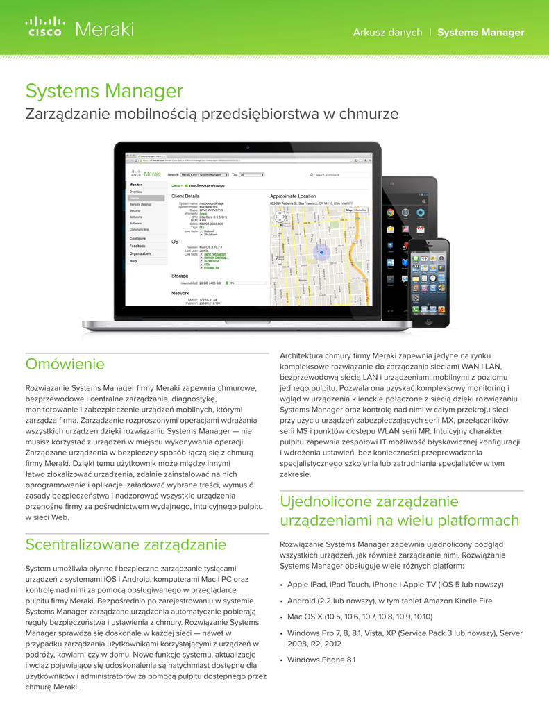 Arkusz danych | Systems Manager Systems Manager Zarządzanie mobilnością przedsiębiorstwa w chmurze Omówienie Rozwiązanie Systems Manager firmy Meraki zapewnia chmurowe, bezprzewodowe i centralne zarządzanie, diagnostykę, monitorowanie i zabezpieczenie urządzeń mobilnych, którymi zarządza firma. Zarządzanie rozproszonymi operacjami wdrażania wszystkich urządzeń dzięki rozwiązaniu Systems Manager — nie musisz korzystać z urządzeń w miejscu wykonywania operacji. Zarządzane urządzenia w bezpieczny sposób łączą się z chmurą firmy Meraki. Dzięki temu użytkownik może między innymi łatwo zlokalizować urządzenia, zdalnie zainstalować na nich oprogramowanie i aplikacje, załadować wybrane treści, wymusić zasady bezpieczeństwa i nadzorować wszystkie urządzenia przenośne firmy za pośrednictwem wydajnego, intuicyjnego pulpitu w sieci Web. Scentralizowane zarządzanie System umożliwia płynne i bezpieczne zarządzanie tysiącami urządzeń z systemami iOS i Android, komputerami Mac i PC oraz kontrolę nad nimi za pomocą obsługiwanego w przeglądarce pulpitu firmy Meraki. Bezpośrednio po zarejestrowaniu w systemie Systems Manager zarządzane urządzenia automatycznie pobierają reguły bezpieczeństwa i ustawienia z chmury. Rozwiązanie Systems Manager sprawdza się doskonale w każdej sieci — nawet w przypadku zarządzania użytkownikami korzystającymi z urządzeń w podróży, kawiarni czy w domu. Nowe funkcje systemu, aktualizacje i wciąż pojawiające się udoskonalenia są natychmiast dostępne dla użytkowników i administratorów za pomocą pulpitu dostępnego przez chmurę Meraki. Architektura chmury firmy Meraki zapewnia jedyne na rynku kompleksowe rozwiązanie do zarządzania sieciami WAN i LAN, bezprzewodową siecią LAN i urządzeniami mobilnymi z poziomu jednego pulpitu. Pozwala ona uzyskać kompleksowy monitoring i wgląd w urządzenia klienckie połączone z siecią dzięki rozwiązaniu Systems Manager oraz kontrolę nad nimi w całym przekroju sieci przy użyciu urządzeń zabezpieczających serii MX, przełączników serii MS i punktów dostępu WLAN serii MR. Intuicyjny charakter pulpitu zapewnia zespołowi IT możliwość błyskawicznej konfiguracji i wdrożenia ustawień, bez konieczności przeprowadzania specjalistycznego szkolenia lub zatrudniania specjalistów w tym zakresie. Ujednolicone zarządzanie urządzeniami na wielu platformach Rozwiązanie Systems Manager zapewnia ujednolicony podgląd wszystkich urządzeń, jak również zarządzanie nimi. Rozwiązanie Systems Manager obsługuje wiele różnych platform: • Apple iPad, iPod Touch, iPhone i Apple TV (iOS 5 lub nowszy) • Android (2.2 lub nowszy), w tym tablet Amazon Kindle Fire • Mac OS X (10.5, 10.6, 10.7, 10.8, 10.9, 10.10) • Windows Pro 7, 8, 8.1, Vista, XP (Service Pack 3 lub nowszy), Server 2008, R2, 2012 • Windows Phone 8.1 LISTA I WGLĄD W ZARZĄDZANE URZĄDZENIA Błyskawiczne wdrożenie i duża skalowalność Platforma zarządzania w chmurze firmy Meraki umożliwia zarządzanie i planowanie wdrożeń urządzeń mobilnych bardzo szybko i na niespotykaną dotychczas skalę. Rozwiązanie Systems Manager zarządza urządzeniami z systemami iOS i Android za pośrednictwem profili. Aby wziąć udział w projekcie 1-to-1 lub inicjatywie BYOD, wystarczy samodzielnie zarejestrować się przy użyciu urządzenia mobilnego za pośrednictwem sieci Web, instalując aplikację ze sklepu App Store. Rozwiązanie Systems Manager integruje się również z narzędziami Apple Configurator oraz iPhone Configuration Utility. ARCHITEKTURA SYSTEMU ZARZĄDZANIA W CHMURZE FIRMY MERAKI W przypadku komputerów z systemami Mac i Windows rozwiązanie Systems Manager jest instalowane na poszczególnych urządzeniach przy użyciu prostego instalatora. Wdrażanie odbywa się za pośrednictwem sieci przy użyciu obiektu GPO usługi Active Directory. Pozwala to na błyskawiczną rejestrację urządzenia w sieciach domenowych Windows. Po zarejestrowaniu każde z urządzeń pobiera konfigurację z chmury firmy Meraki, automatycznie uwzględniając wymagane dla urządzenia ograniczenia oraz zasady dotyczące sieci i zabezpieczeń, co pozwala wyeliminować ręczną obsługę urządzenia. SZCZEGÓŁOWE OGRANICZENIA DOTYCZĄCE URZĄDZEŃ Dynamiczna rejestracja Systems Manager Sentry Dzięki integracji funkcji kontroli dostępu do sieci (NAC) z bezprzewodowymi punktami dostępu Meraki (seria MR) administratorzy sieci mogą zezwalać na dostęp tylko urządzeniom objętym kontrolą poprzez rozwiązanie Systems Manager. Nieznane urządzenia uprzednio niepodłączone do programu Systems Manager przed dostępem do sieci bezprzewodowej przedsiębiorstwa i sieci VPN są najpierw odsyłane do strony powitalnej w celu instalacji. Administracja i zarządzanie Rozwiązanie Systems Manager zostało opracowane z myślą o zapewnieniu zgodności zarządzanych urządzeń z najnowszymi wymaganiami użytkowników i firm przy jednoczesnym zmniejszeniu obciążenia zespołu IT. Umożliwia ono płynne wdrażanie reguł bezpieczeństwa i zmian ustawień za pośrednictwem chmury równolegle w tysiącach urządzeń. 2 Cisco Systems, Inc. | 32-38 Saffron Hill, London, EC1N 8FN | +44 (0) 203 640 6120 | [email protected] ZARZĄDZANIE GLOBALNE INTEGRACJA Z APP STORE Wdrażanie oprogramowania Exchange ActiveSync Rozwiązanie Systems Manager pozwala zainstalować oprogramowanie na dowolnej liczbie komputerów PC i Mac w sieci. Możliwe jest przekazywanie plików MSI do komputerów PC i plików PKG do komputerów Mac, wybór urządzeń oraz uruchamianie instalatora. W przypadku niedostępności komputera PC lub Mac oprogramowanie zostaje zainstalowane następnym razem, gdy tylko urządzenie znajdzie się w trybie online. Pozwala na obsługę kont e-mail i ustawień poczty, w tym szyfrowania i przechowywanej historii poczty na zarejestrowanych urządzeniach z systemem Apple iOS. Wdrażanie aplikacji W urządzeniach z sys